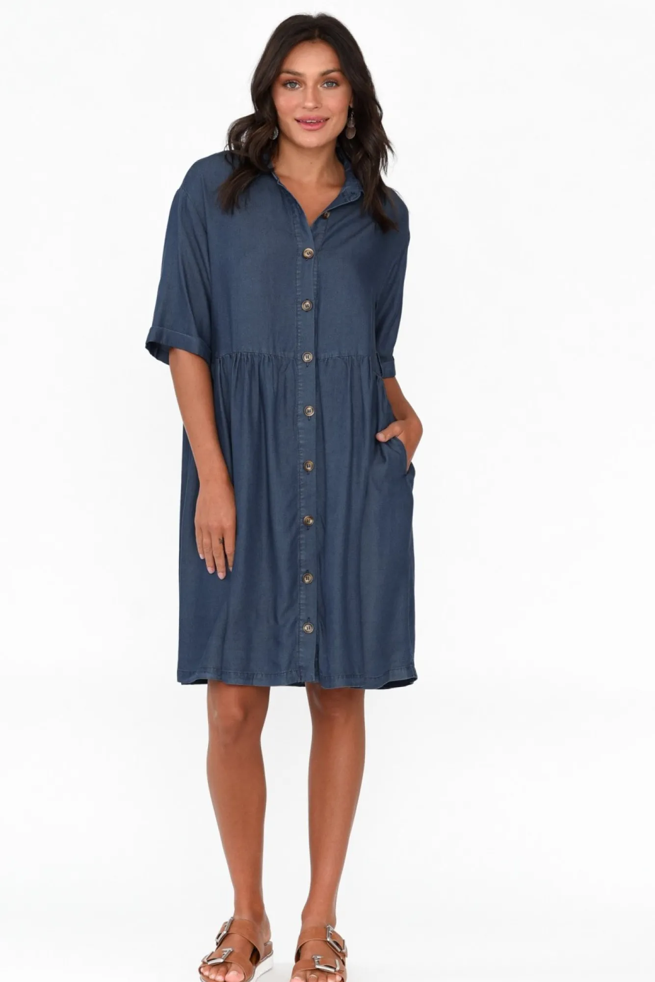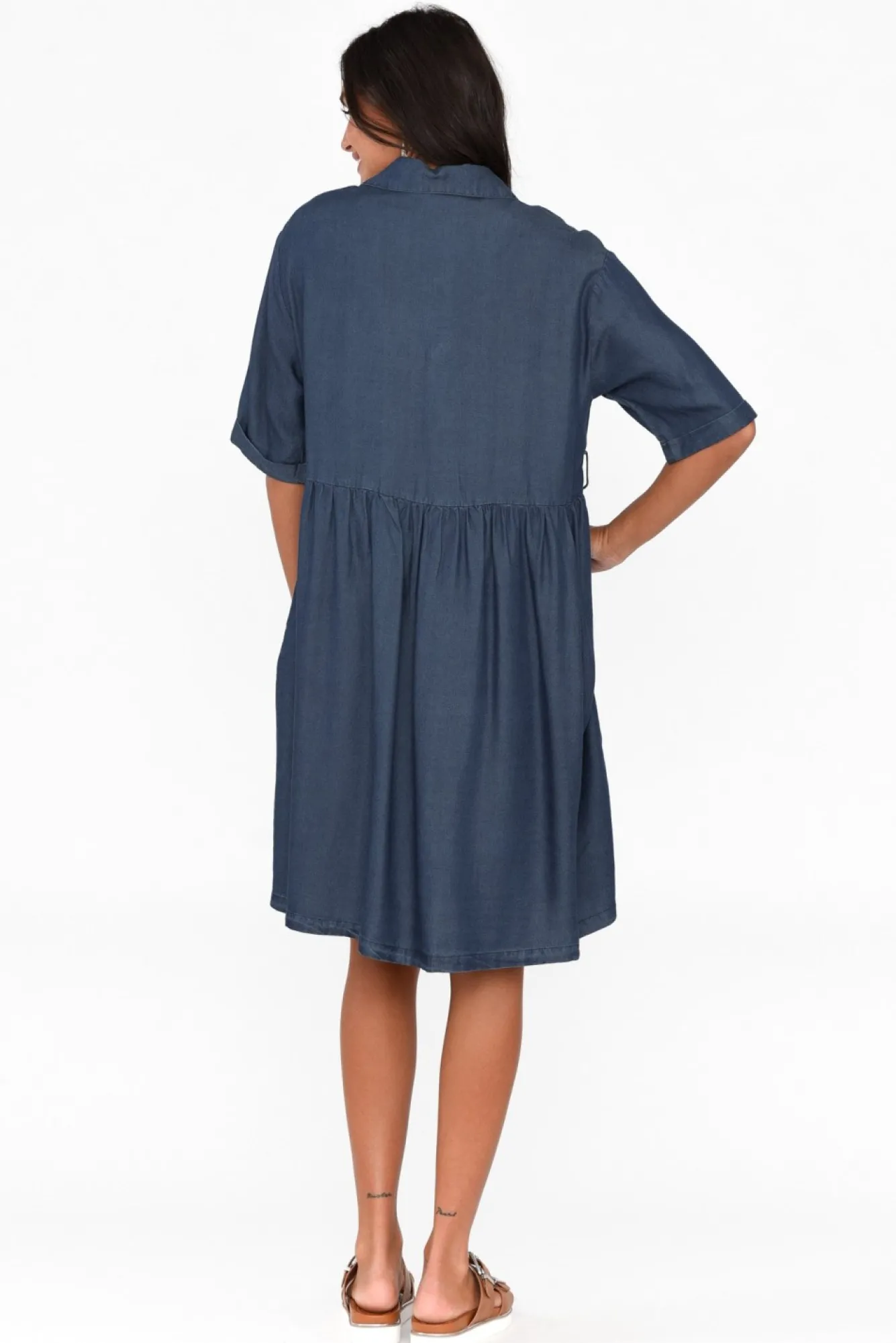 Fit: True To Size. Refer To Size & Fit Tab Below For Specific Size RecommendationNNfabric: 100% LyocellNlightweight And Ultra-Soft Fabric With A Slight Sheen And Denim Look FinishNcollared Neckline With A Tortoiseshell Button Front NNhalf-Length Sleeves With A Folded CuffNa-Line Silhouette With Soft Pleats Falling From The WaistNNoptional Matching Waist Tie NNtwo Discreet Hip PocketsNstraight Hem Falls To The KneesNNNcare: Cool Gentle Machine Wash RecommendedNNcolour: Denim Blue