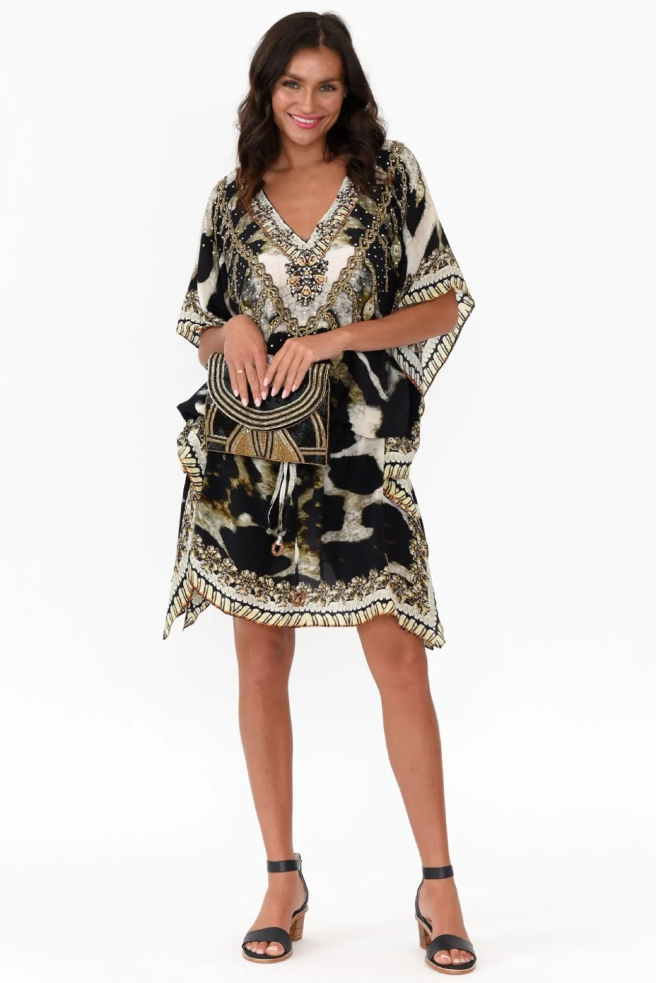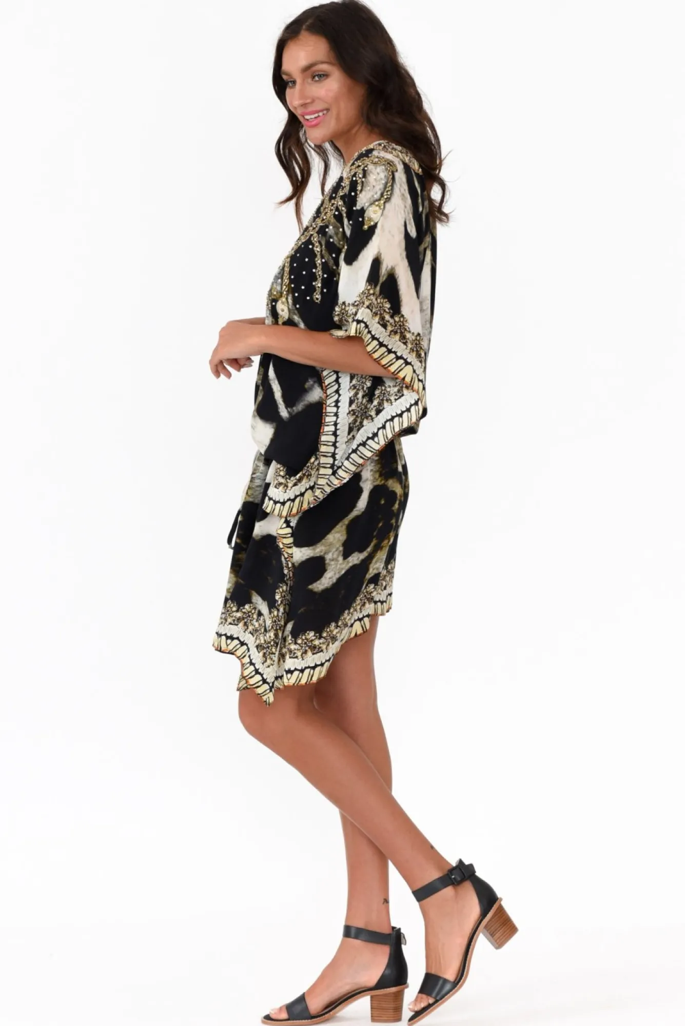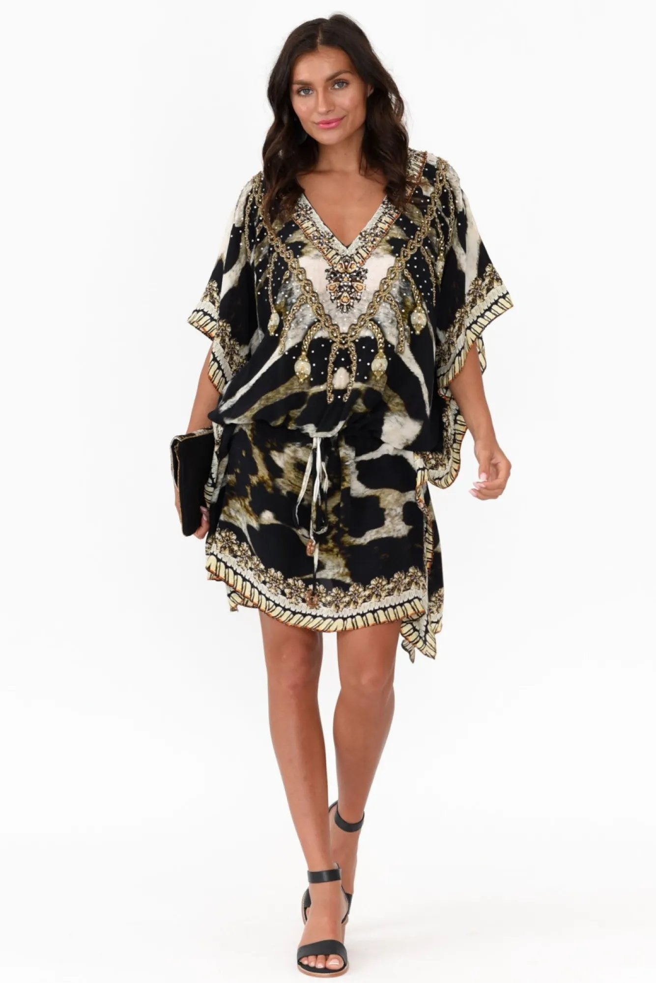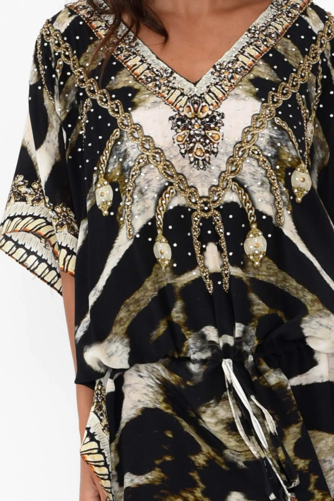 Fit: True To Size. Refer To Size & Fit Tab Below For Specific Size Recommendation NNfabric: 100% SilkNcrafted From Luxurious Lightweight, Breathable And Ultra-Soft Silk Fabric Nstriking V-Neckline With Scattered Diamante Embellishments NNgorgeous Batwing Sleeves Drape BeautifullyNNadjustable Drawstring Waist Featuring Circular Metal Detailing Nclassic And Flattering Drape Silhouette NNfeaturing 36Cm Side Splits NNasymmetric Hemline Falls Above Knee Length NNcare: Specialist Dry Clean OnlyNNcolour: Chocolate Brown Base With Bohemian Cougar Print NNstyle Tip: This Versatile Silhouette Can Be Worn As A Dress Or Layered Over Pants For A Tunic Look And Feel