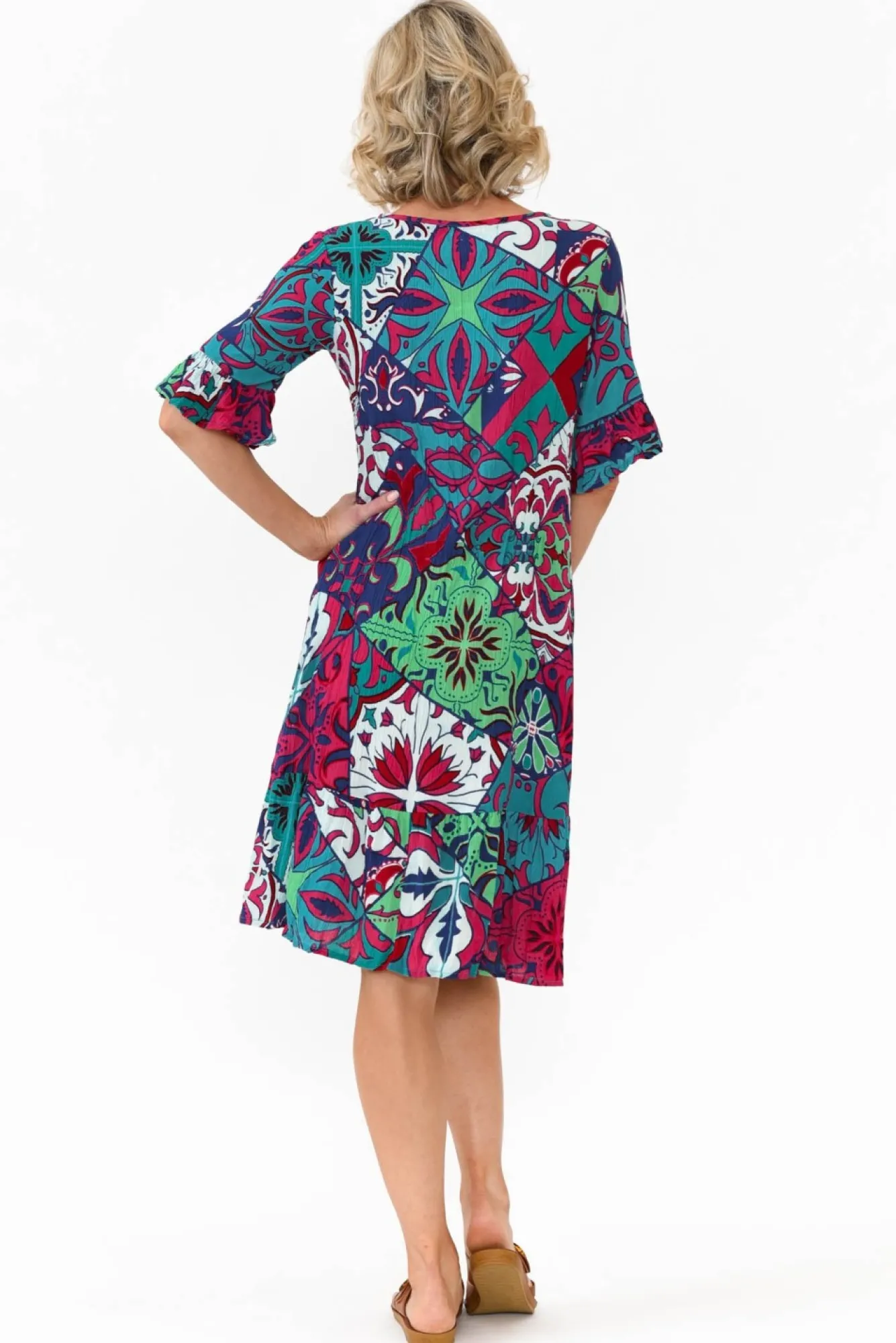 Fit: True To Size. Refer To Size & Fit Tab Below For Specific Size RecommendationNNfabric: 100% RayonNmade Breezy Lightweight Rayon Designed With A Fuss-Free Crinkle Finish!NNtimeless V-Neckline Highlights The Collarbones Nhalf-Length Sleeves With An Elevated Frill Cuff NNversatile A-Line Silhouette – Perfect For Everyday Wear!Nruffled Flare Hemline Falls To The KneeNNcare: Cool Gentle Hand Wash RecommendedNNcolour: Striking Teal, Red And Green Mosaic PrintNNfabric Tip: Twist The Garment, Fold In Half And Secure With A Rubber Band To Store After Washing And Drying To Keep The Crinkle Alive