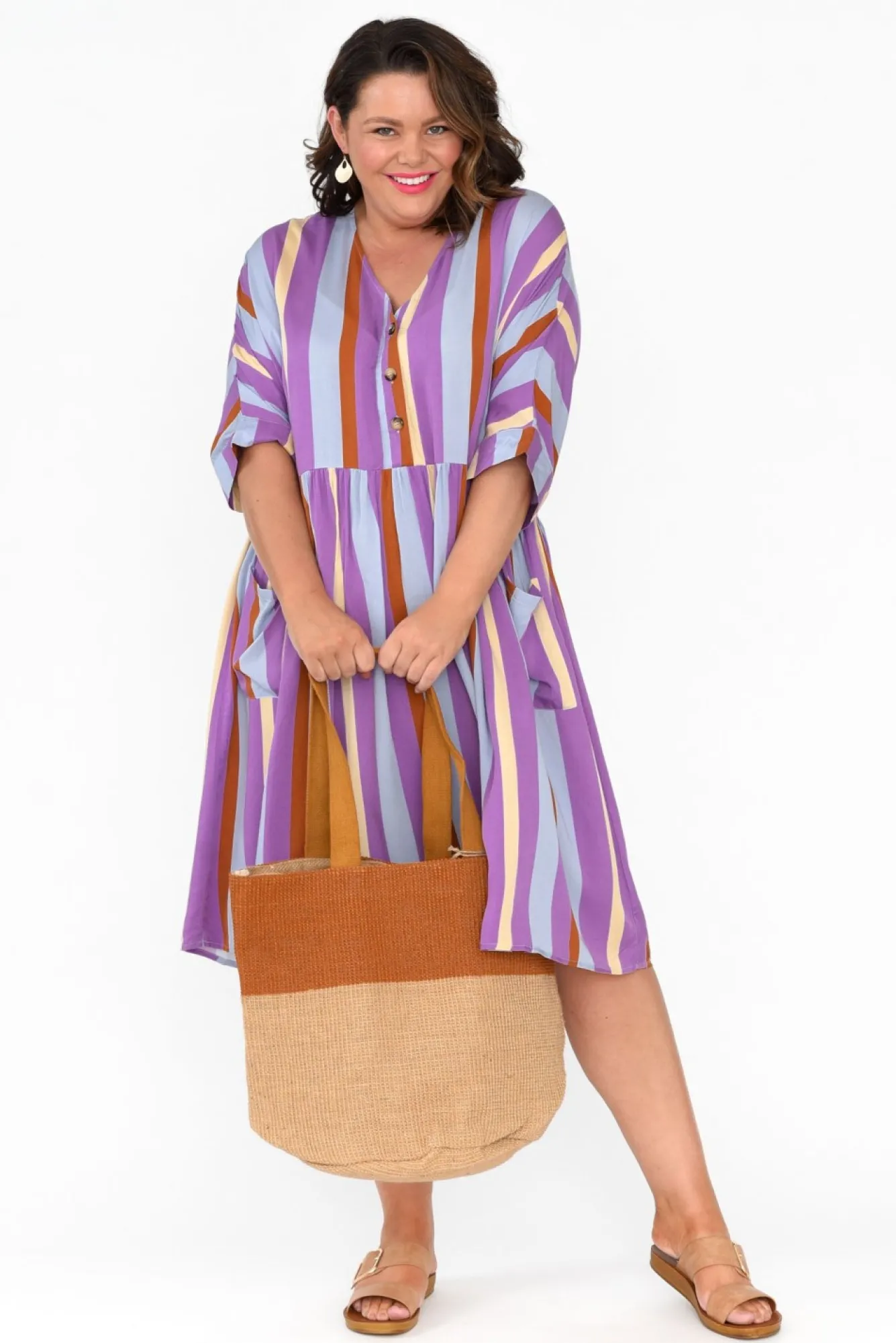 Fit: Relaxed Fit Refer To Size & Fit Tab Below For Specific Size RecommendationNNfabric: 100% RayonNwonderfully Smooth And Soft Rayon With A Lightweight, Non-Stretch FinishNtimeless V-Neck Flows To A Button Front NNrelaxed Three-Quarter Length Sleeve Featuring A Drop ShoulderNnon-Stretch Waist Seam With Pleated DetailingNtwo Functional Front Pockets Ndrape Silhouette Flows Over Curves Nstraight Hem Falls To The Knees NNNcare: Cool Gentle Machine Wash RecommendedNNcolour: Stunning Stripe Print In Purple, Blue, Yellow And Orange