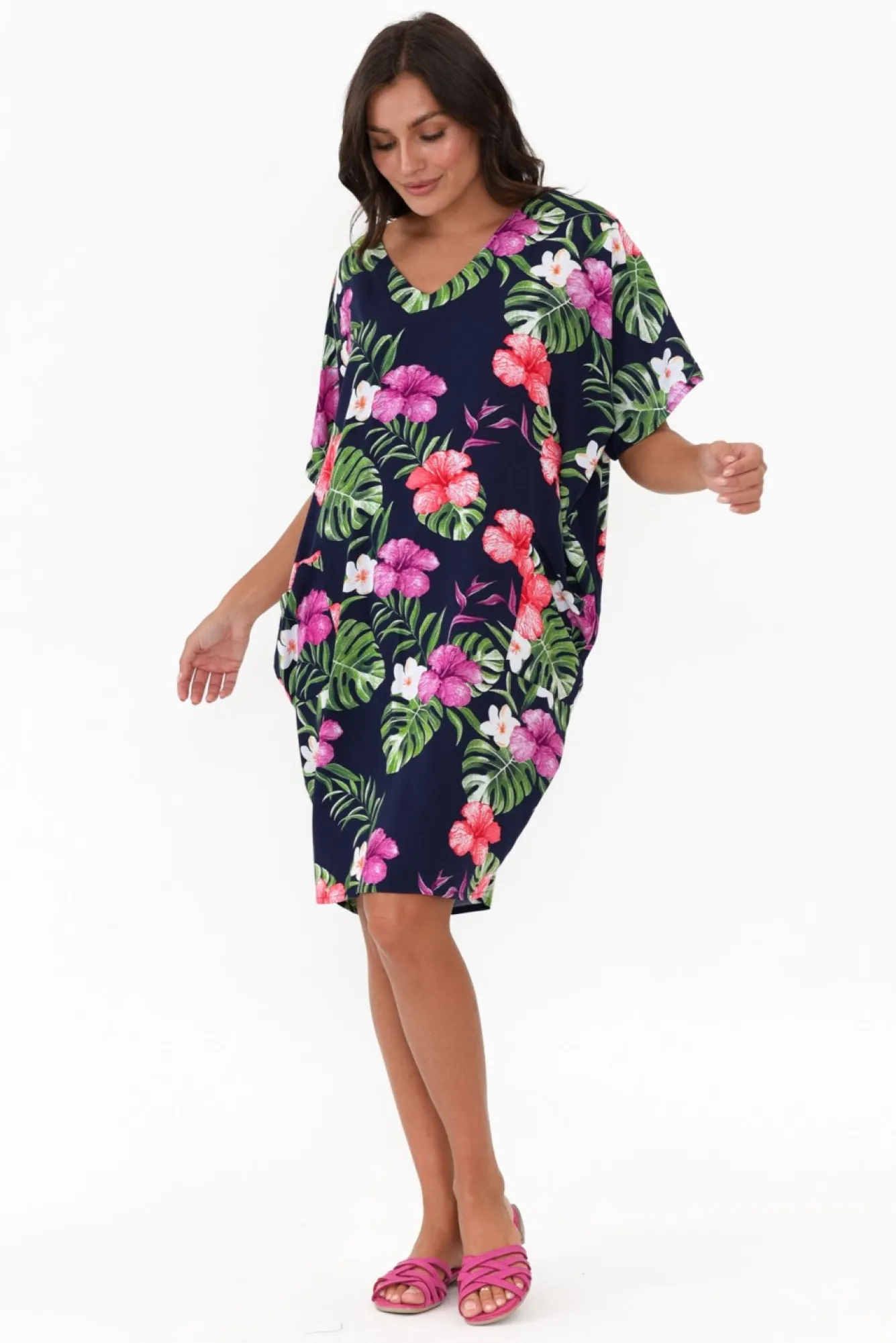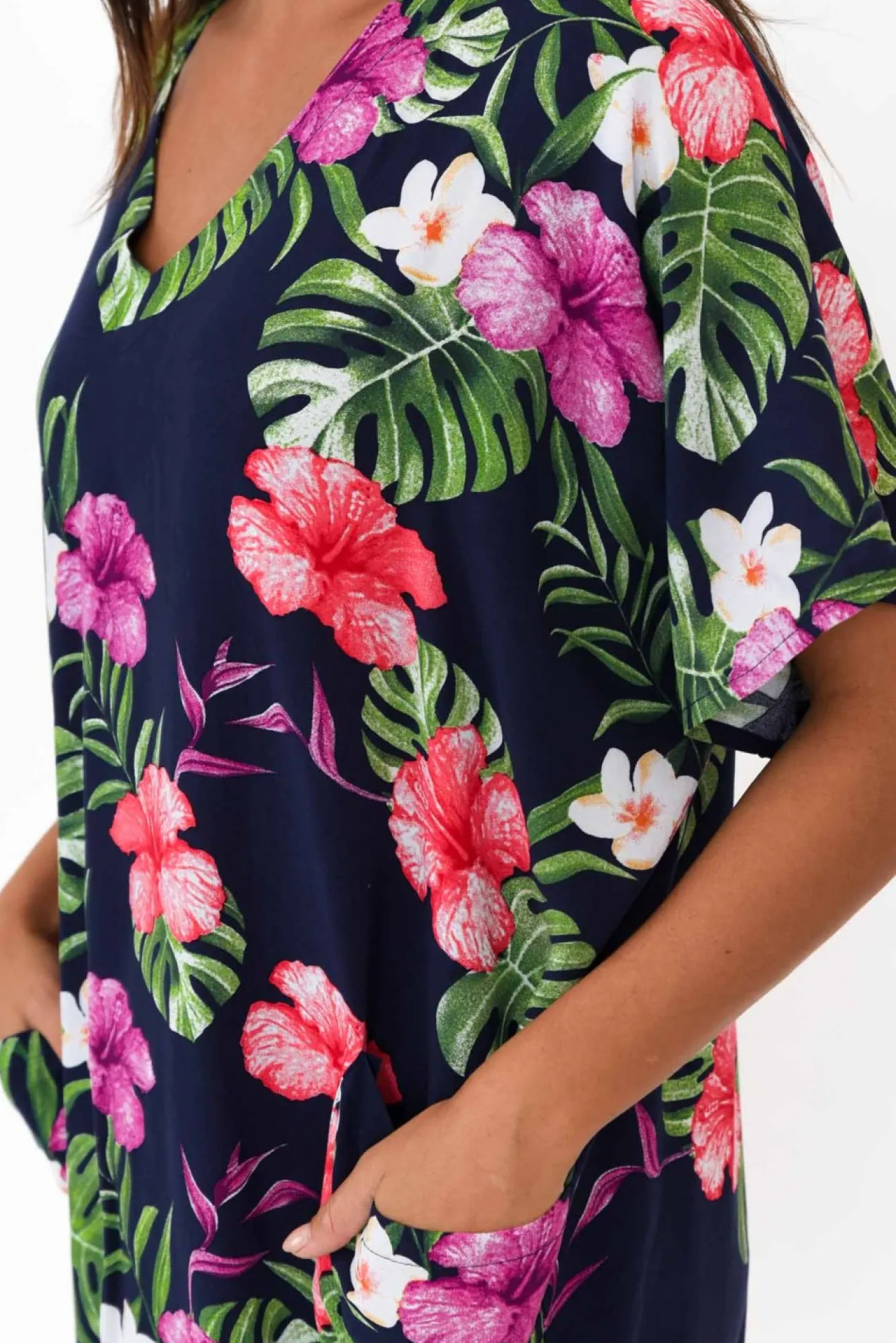 Fit: True. Refer To Size & Fit Tab Below For Specific Size RecommendationNNfabric: 100% RayonNsmooth, Lightweight Non-Stretch Fabric For A Breezy FeelNNstriking V-Neckline Complements The Short Sleeves Ndraped Silhouette With Elevated Tapering Through The Hips And HemNtwo Feature Front PocketsNstraight Hemline Falls Above Knee Length NNNcare: Cool Gentle Hand Wash RecommendedNNcolour: Deep Navy With Vibrant Tropical Floral Print NNfit Tip: This Relaxed Style Features A Tapered Hem – Follow Our Size Guide Below To Ensure The Fit Is Easy To Take Off And Put On. If You Carry Your Weight In Your Hips/Lower Body Please Ensure That You Look At Those Measurements As The Hem Does Not Stretch.