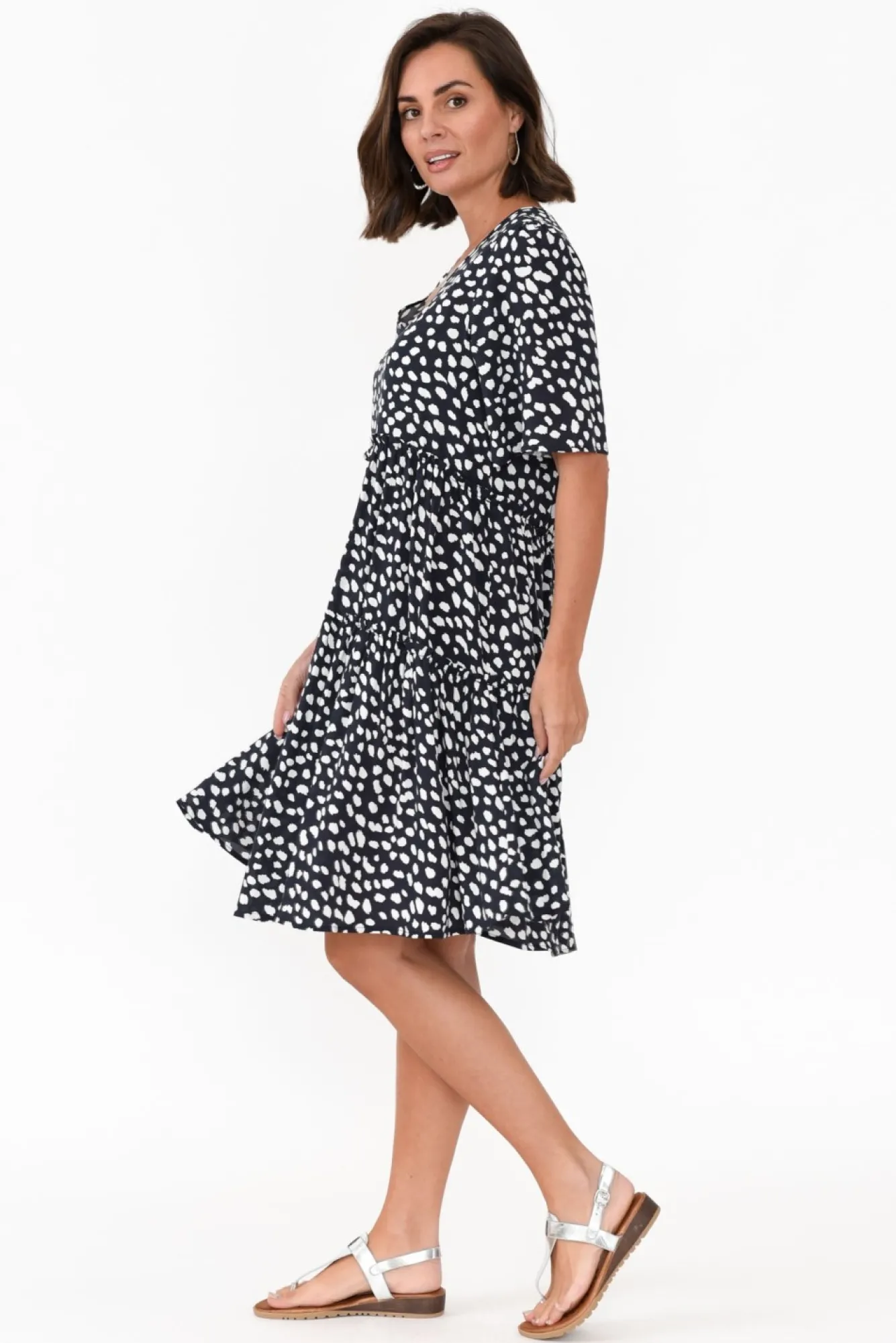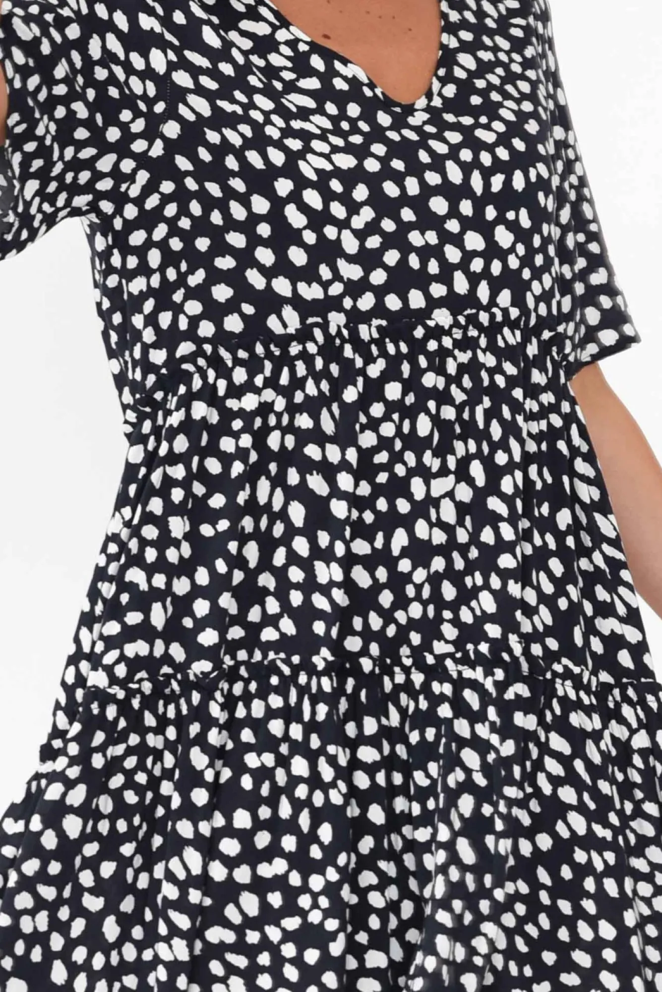 Fit: True. Refer To Size & Fit Tab Below For Specific Size RecommendationNNfabric: 100% RayonNa Lightweight, Soft And Breathable Summer StapleNsubtle Round And V Neckline CombinationNNshort, T-Shirt Style SleevesNNruffle Detailing Featured On Tiered SeamsNrelaxed, Flowy SilhouetteNNoversized Hemline Creates Stunning FlareNNstyle Falls Just Short Of The KneeNNcare: Cool Gentle Hand Wash RecommendedNNcolour: Navy Base With White Abstract Spots
