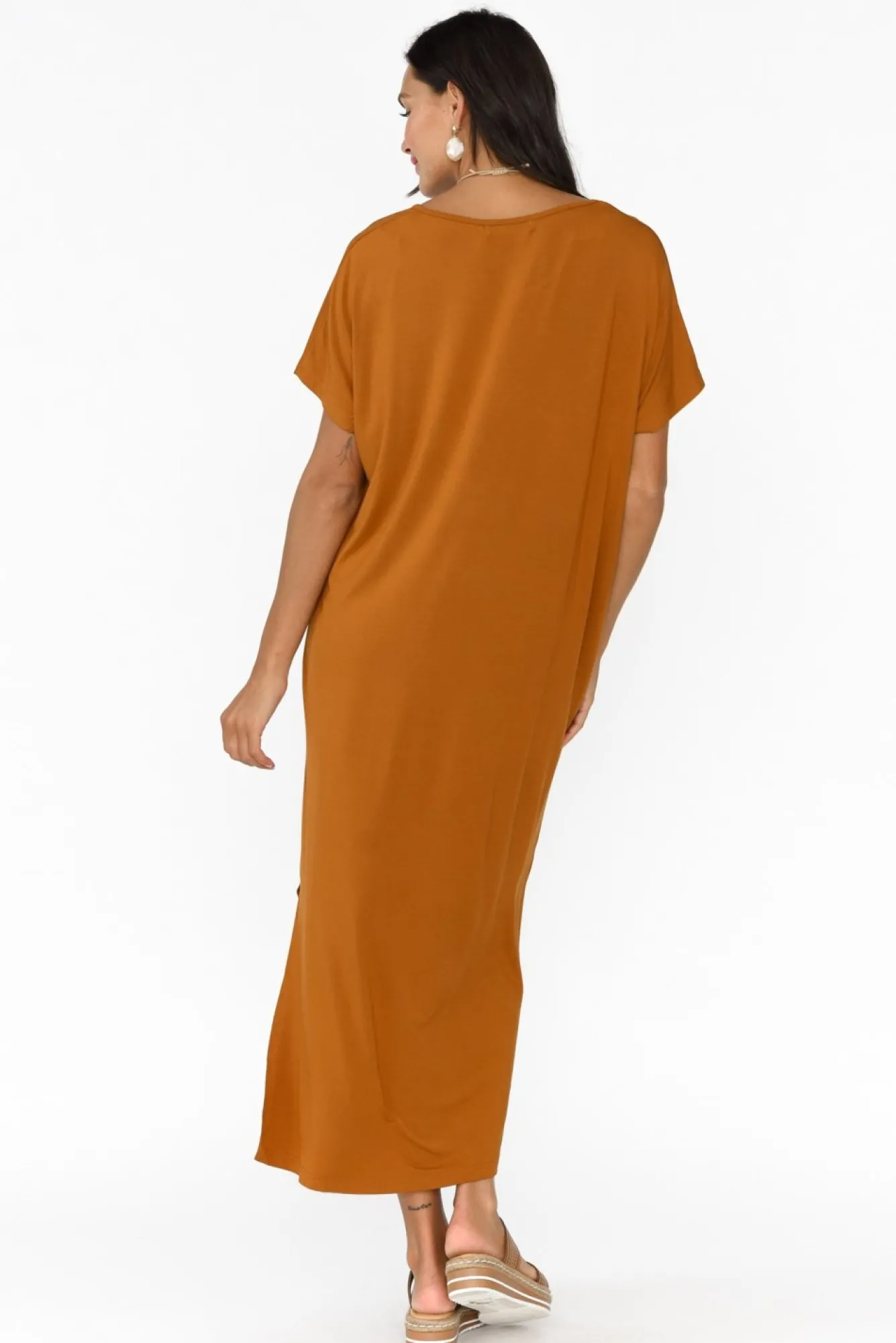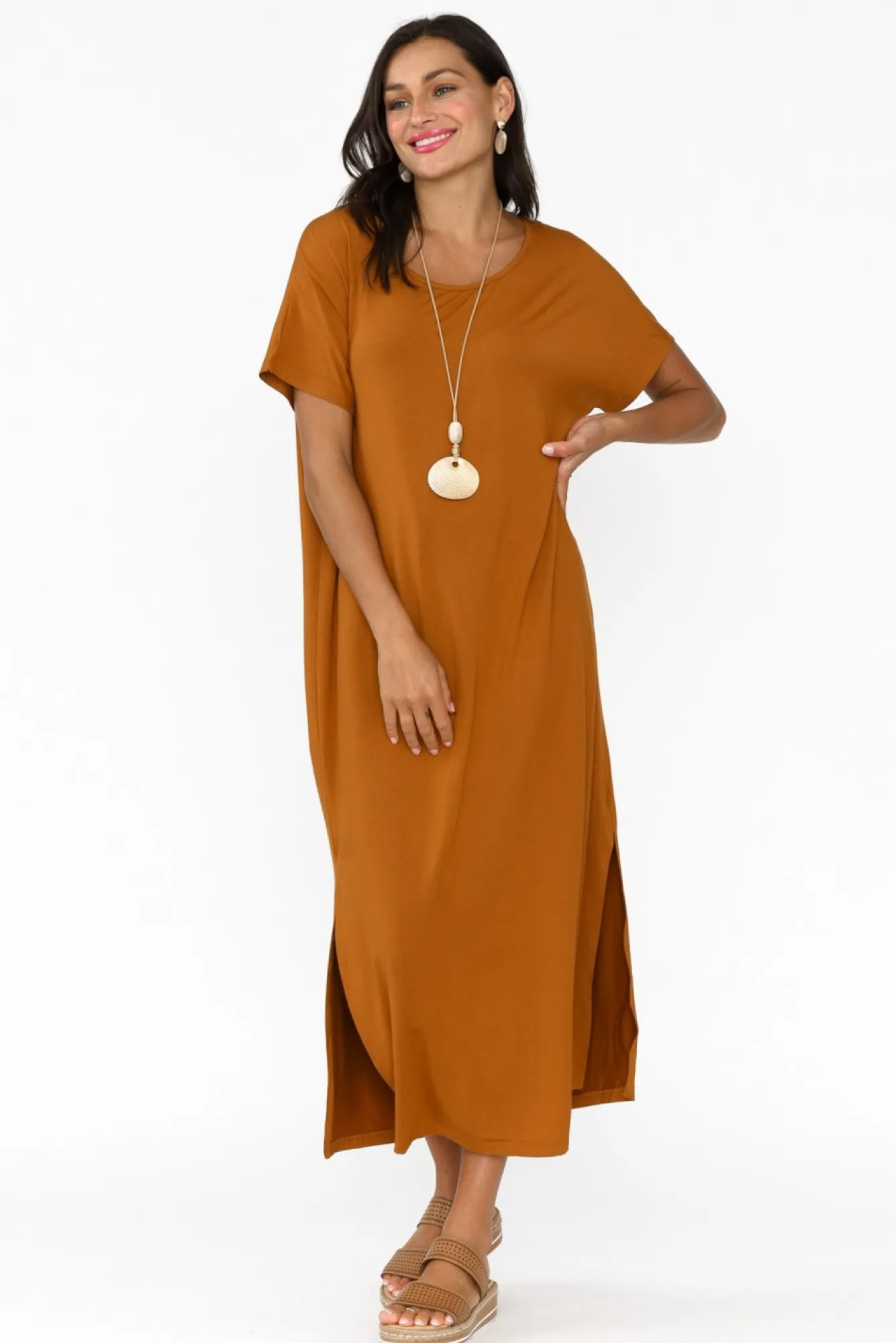 Fit: True To Size. Refer To Size & Fit Tab Below For Specific Size RecommendationNNfabric: 95% Bamboo Viscose, 5% SpandexNultra-Soft And Stretchy Bamboo Jersey Fabric Offering Lightweight And Breathable QualitiesNNclassic Round NecklineNNshort, Tee-Style Sleeves NNversatile Straight Silhouette Nmidi Length Featuring Side Splits At The Hem For Ease Of MovementNNcare: Cool Gentle Machine Wash RecommendedNNcolour: Striking Mocha Hue With A Marigold Undertone