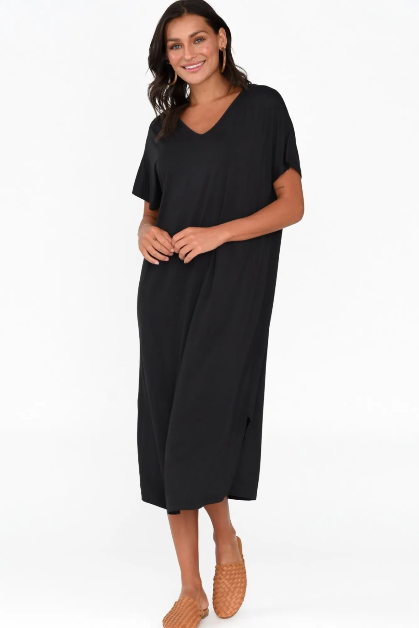 Fit: True To Size. Refer To Size & Fit Tab Below For Specific Size RecommendationNNfabric: 95% Bamboo Viscose, 5% Spandex Nultra-Soft And Stretchy Midweight Bamboo Fabric With Signature Breathability And Thermoregulating Properties NNsoft V-Neckline Defines The Collarbones NNclassic Short Sleeves NNstraight Tee-Dress Silhouette – Perfect For Everyday Wear! NNsmall Side Splits At The Hem For Ease Of Movement NNfalls To A Comfortable Midi Length NNNcare: Cool Gentle Machine Wash RecommendedNNcolour: Midnight Black