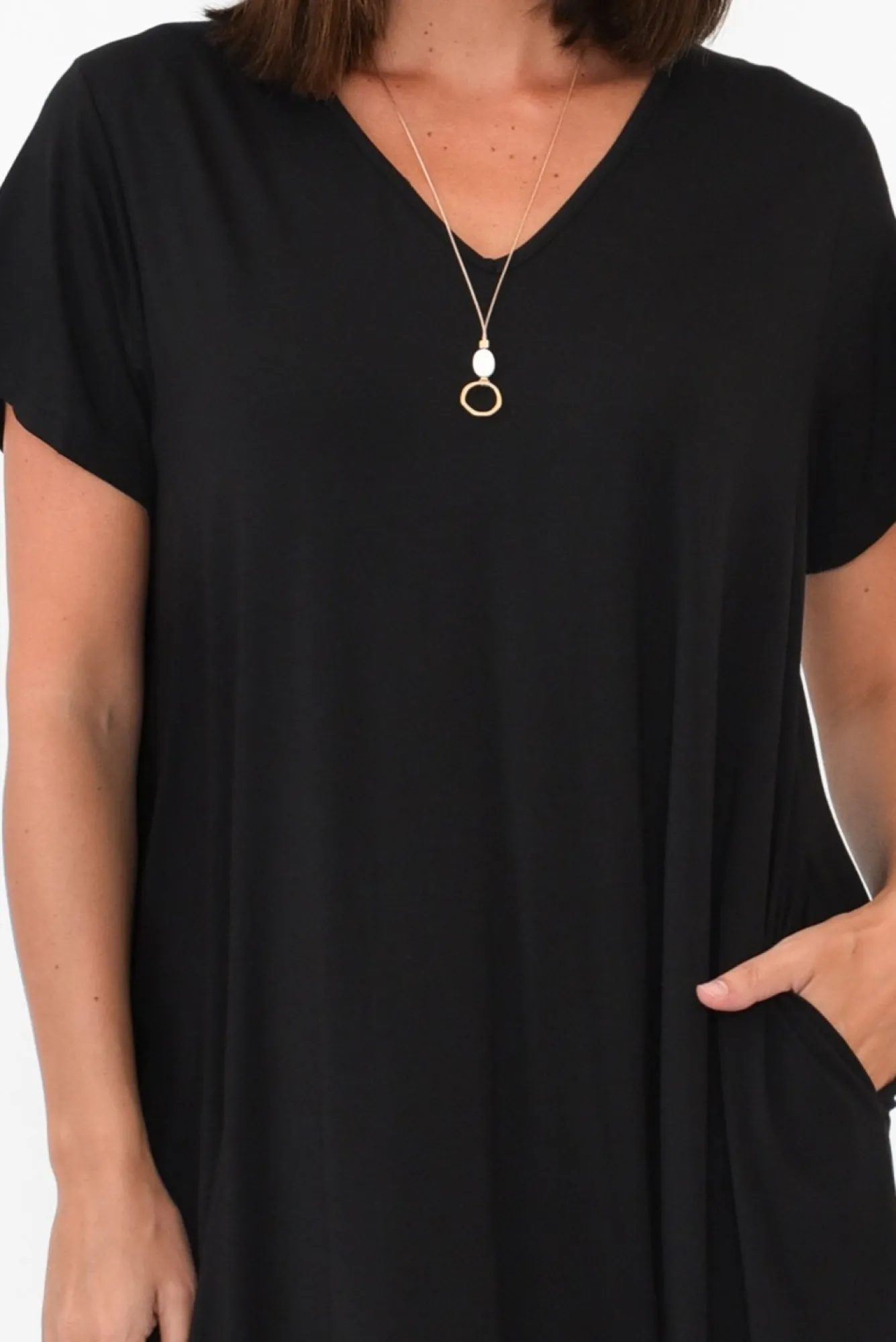 Fit: Oversized. Refer To Size & Fit Tab Below For Specific Size RecommendationNNfabric: 95% Bamboo Viscose, 5% SpandexNlightweight, Breathable And Stretchy Bamboo Fabric With A Lovely Soft Hand-FeelNNNflattering Sharp V-Neckline And Short Tee-Style SleevesNtwo Internal Hip PocketsNsubtle Hi-Lo Hemline For Easy MovementNbelow-Knee LengthNNcare: Cool Gentle Machine Wash RecommendedNNcolour: Classic Black ToneNNnote: Please See Photos Rather Than Video For Most Accurate Colour.