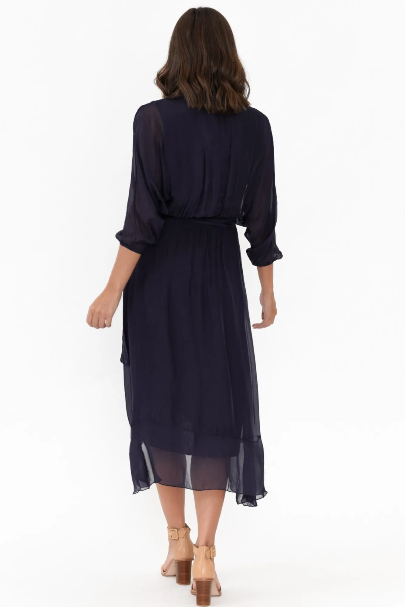 Fit: True To Size. Refer To Size & Fit Tab Below For Specific Size RecommendationNNfabric: Main: 70% Viscose, 30% Silk Lining: 95% Viscose, 5% Elastane Nmade In Italy From Luxurious Silk Blend Overlay With An Ultra-Stretchy And Soft Lining NNdeep V-Neckline Enhanced By Faux Wrap Design NNsheer 3/4 Length Sleeves With An Elasticated Cuff For A Billowy Look NNelegant Faux Wrap Silhouette Creates An A-Line Layering Effect NNelasticated Waist With Removable Waist Tie Ndramatic Frill Asymmetric Hemline Falls Below Knee Length NNNcare: Cool Gentle Hand Wash RecommendedNNcolour: Oceanic Navy Shade