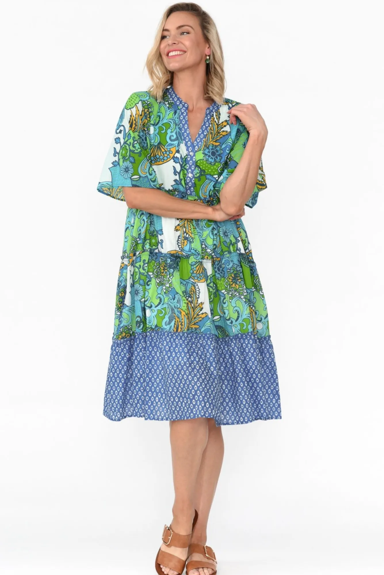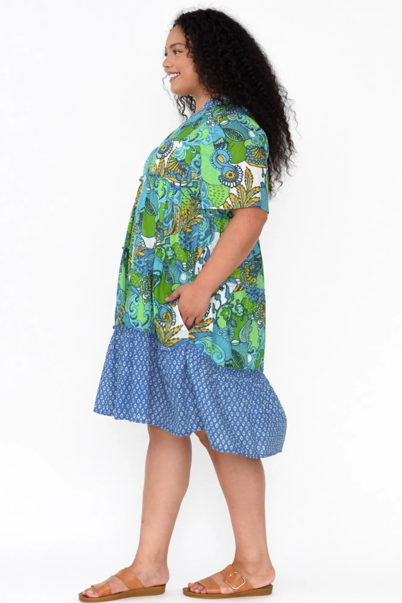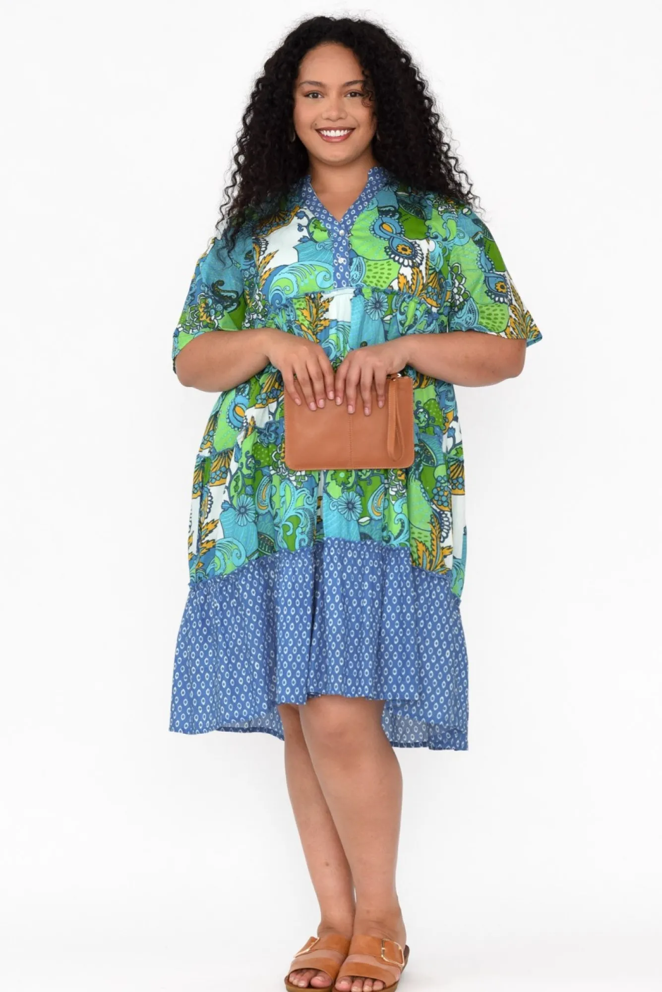 Fit: True To Size. Refer To Size & Fit Tab Below For Specific Size RecommendationNNfabric: 100% CottonNNlightweight, Breathable And Soft Cotton, Fully Lined For Added CoverageNNround, Banded Neckline With A V-Split And Double Button FrontNhalf-Length Straight Sleeves NNa-Line Silhouette Features Ruffled TiersNNtwo Hip PocketsNNstraight Hem Falls To The Knees NNNcare: Cool Gentle Hand Wash RecommendedNNcolour: Green Paisley Print With A Blue Print Block Blue Toward The Hem