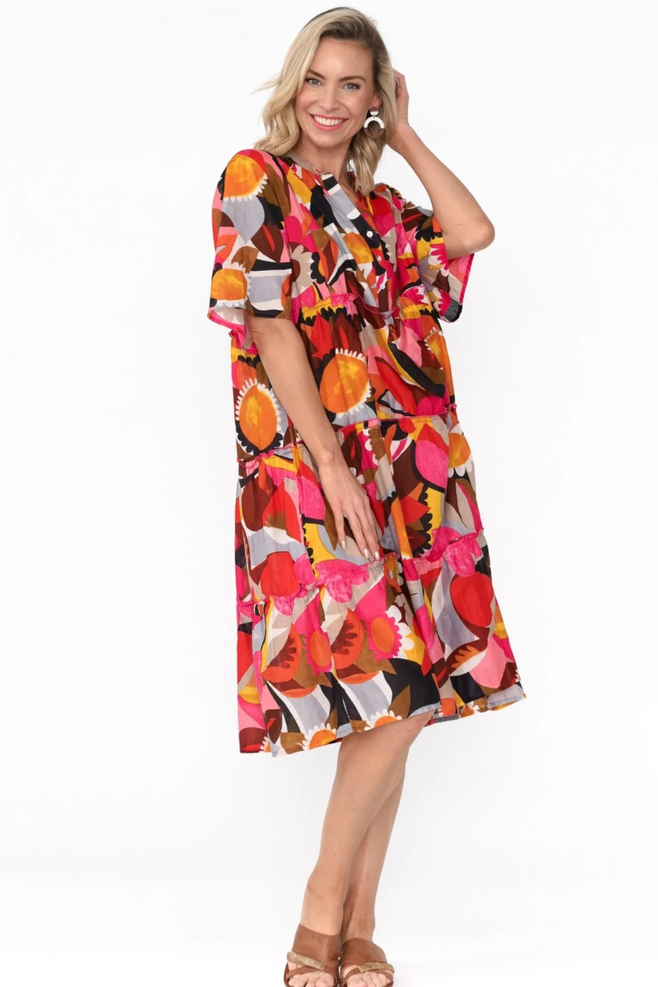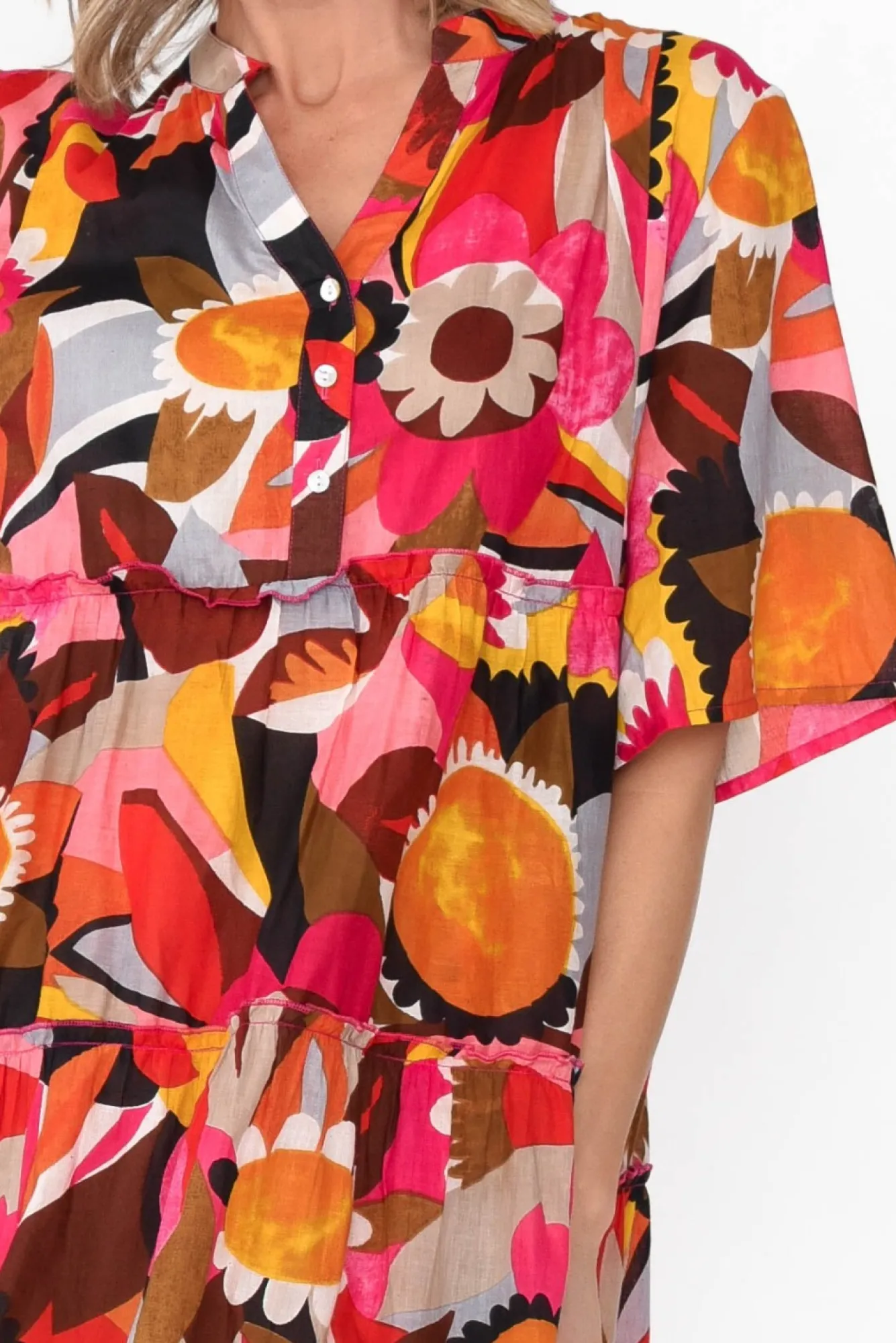 Fit: True To Size. Refer To Size & Fit Tab Below For Specific Size RecommendationNNfabric: 100% CottonNNlightweight, Breathable And Soft Cotton, Fully Lined For Added CoverageNNround, Banded Neckline With A V-Split And Double Button FrontNhalf-Length Straight Sleeves NNfeminine, Tiered A-Line Silhouette With Ruffle DetailsNNtwo Hip PocketsNNstraight Hem Falls To The Knees NNNcare: Cool Gentle Hand Wash RecommendedNNcolour: Pink Abstract Print Featuring Orange And Brown Hues