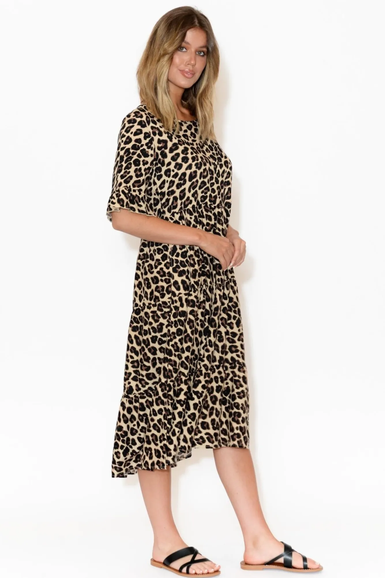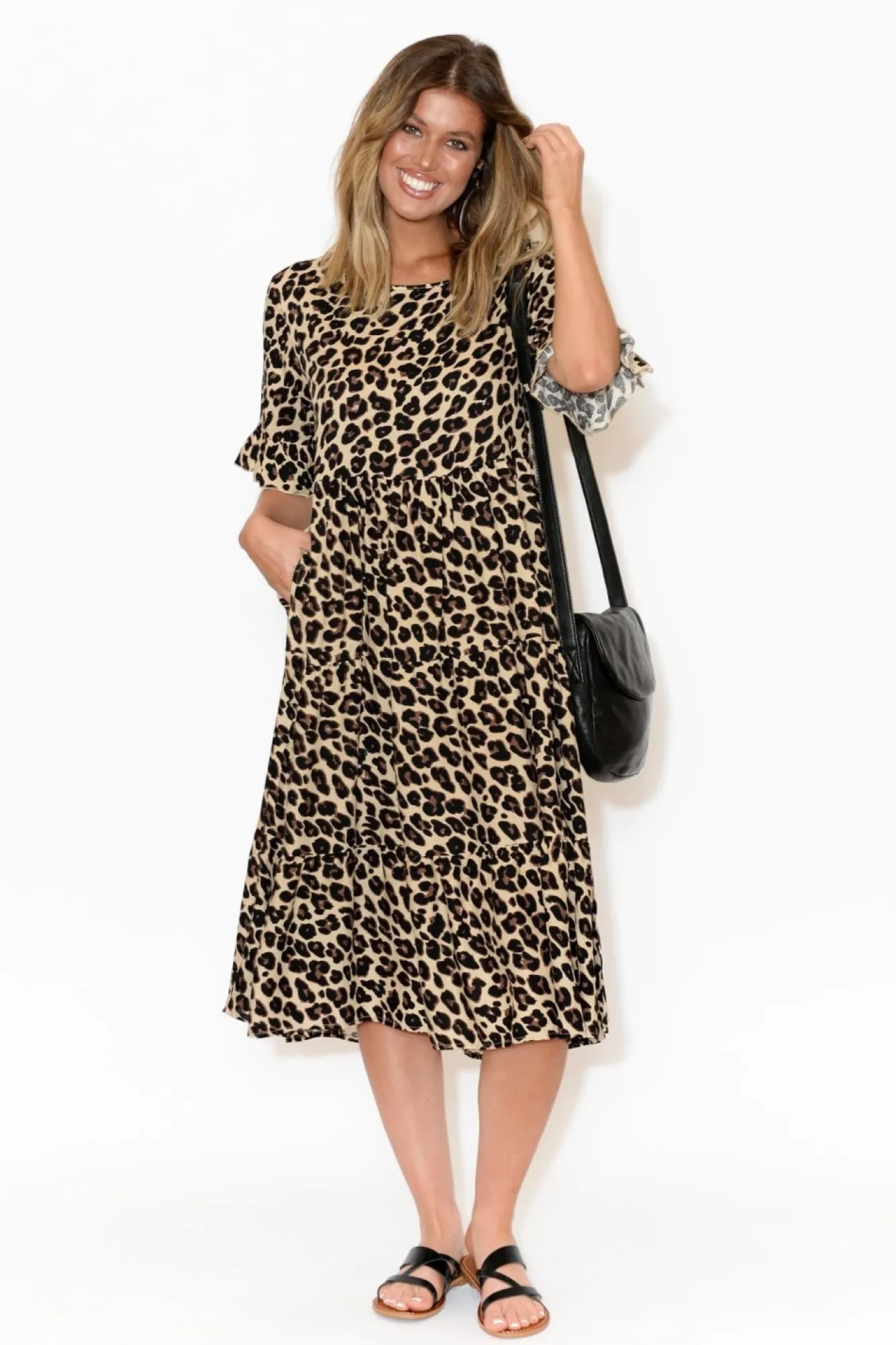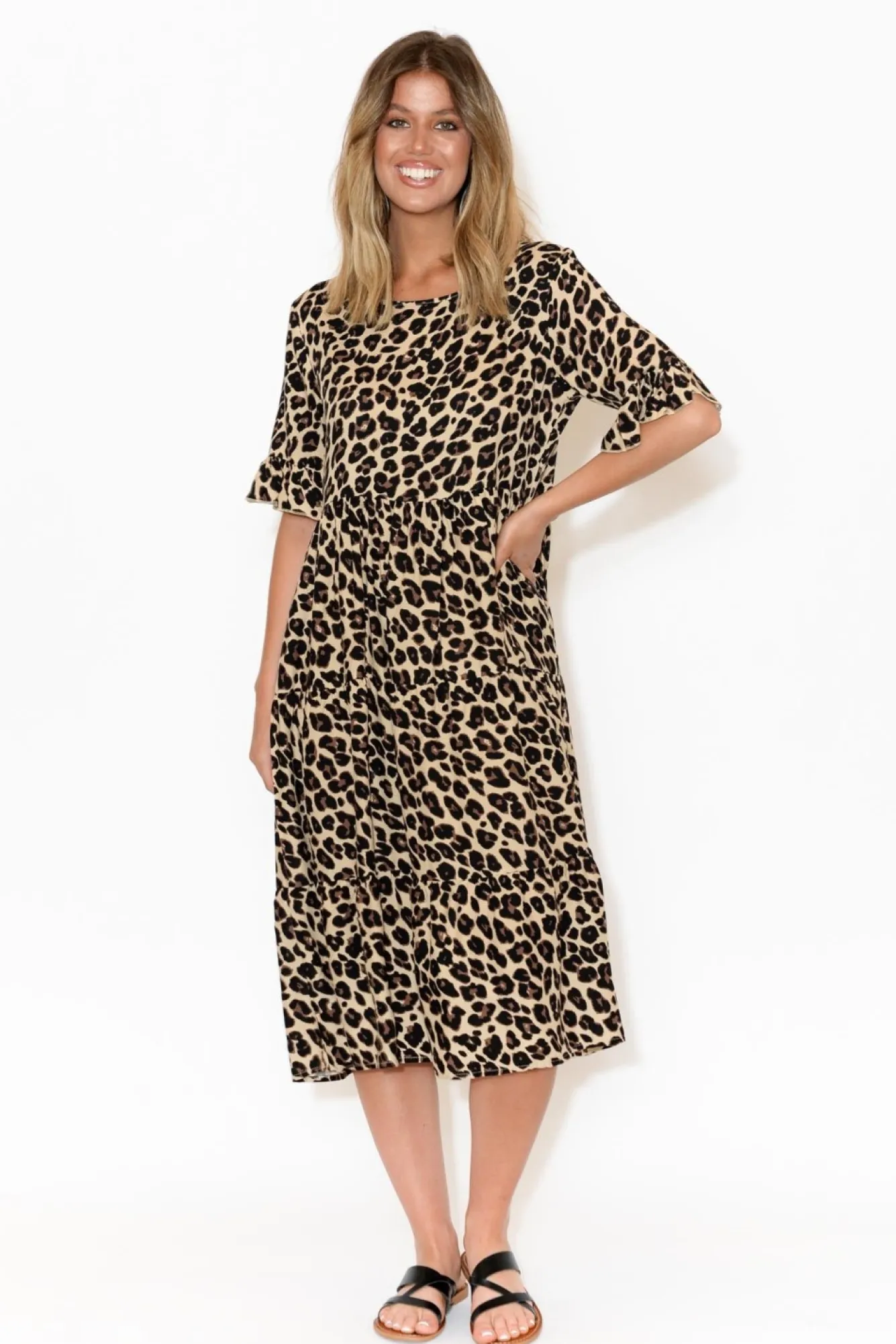 Fit: True. Refer To Size & Fit Tab Below For Specific Size RecommendationNNfabric: 100% RayonNa Lightweight, Non-Stretch Garment In A Fun On-Trend Print!Ndesigned With A Classic Round NecklineNhalf Length Sleeve With Frilled CuffNNtiered A Line SilhouetteNNtwo Pockets Located At The HipNNgarment Falls Below The KneeNNcare: Cool Gentle Hand Wash RecommendedNNcolour: Beige Base With Leopard Print OverlayNNNfit Tip: This Style Features A Non-Stretch Waist Seam That Must Fit Over Your Bust. If You Have A Larger Bust, We Suggest Sizing Up. Please Consult The Size & Fit Tab Below To Determine The Size Best For You.