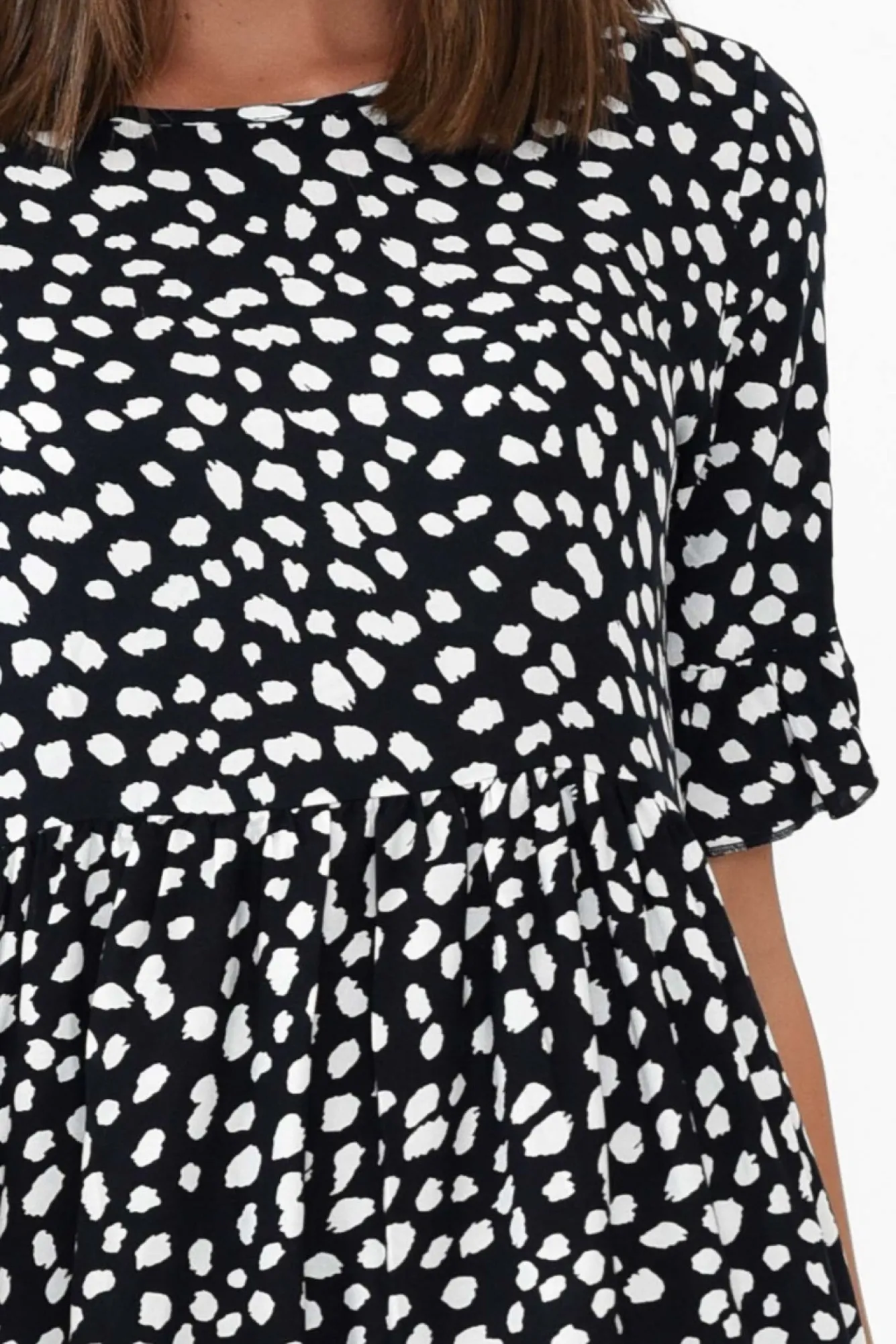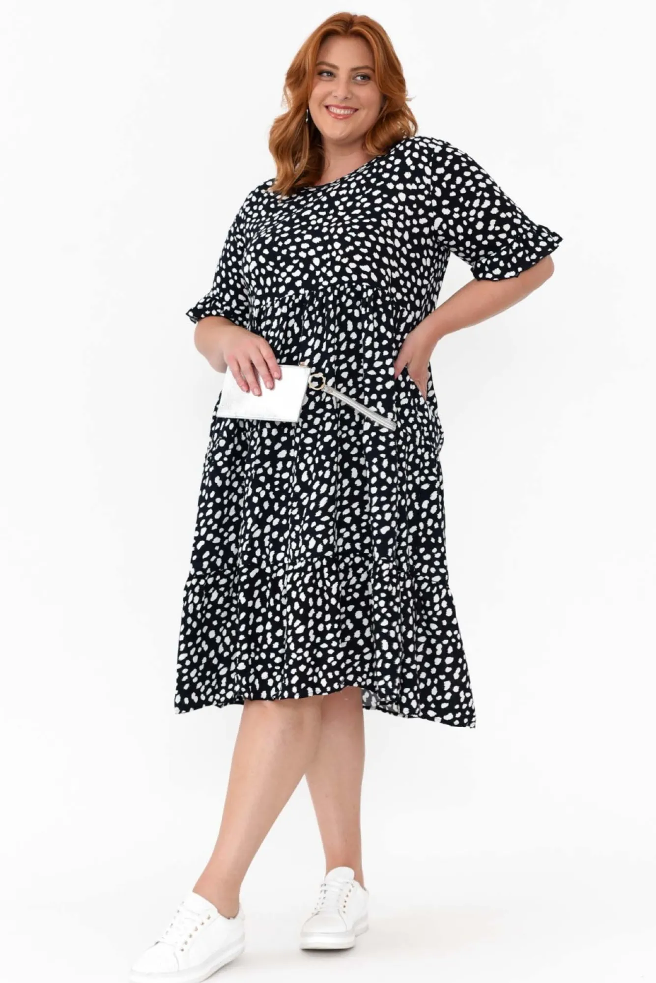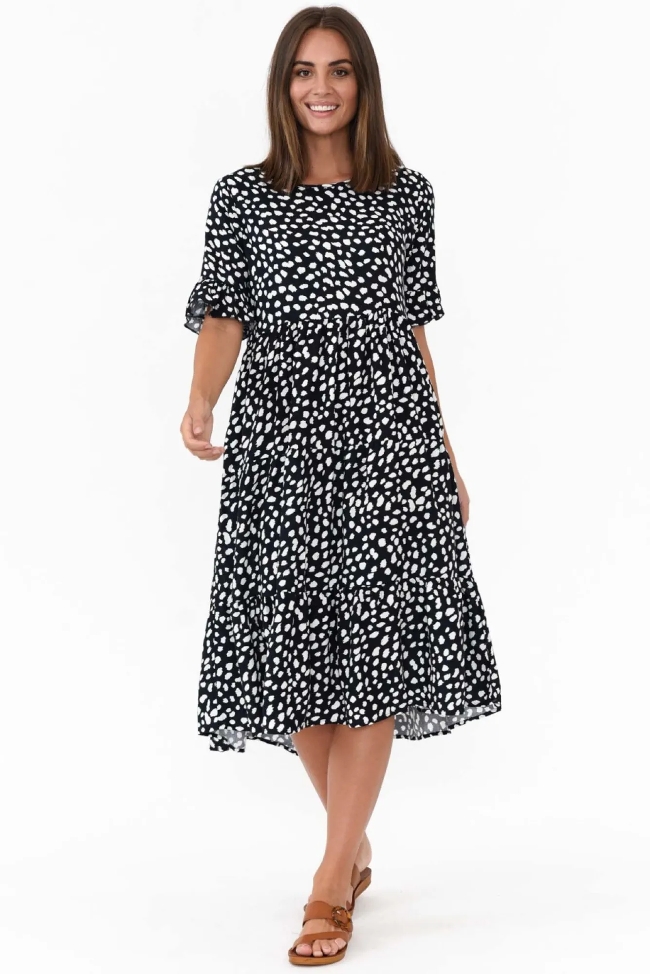 Fit: True To Size. Refer To Size & Fit Tab Below For Specific Size RecommendationNNfabric: 100% RayonNkeep Comfortable In This Gorgeously Soft, Non-Stretch Dress In A Fun Fleck Print!Nsimple Round Neckline NNhalf-Length Sleeves Elevated With Frill Sleeve NNflattering Tiered A-Line Silhouette Featuring Two Hip Pockets Nfalls To Easy-To-Wear Midi Length NNNcare: Cool Gentle Hand Wash RecommendedNNcolour: Deep Navy Base With Small White Fleck Print NNNfit Tip: This Style Features A Non-Stretch Waist Seam That Must Fit Over Your Bust. If You Have A Larger Bust, We Suggest Sizing Up. Please Consult The Size & Fit Tab Below To Determine The Size Best For You.