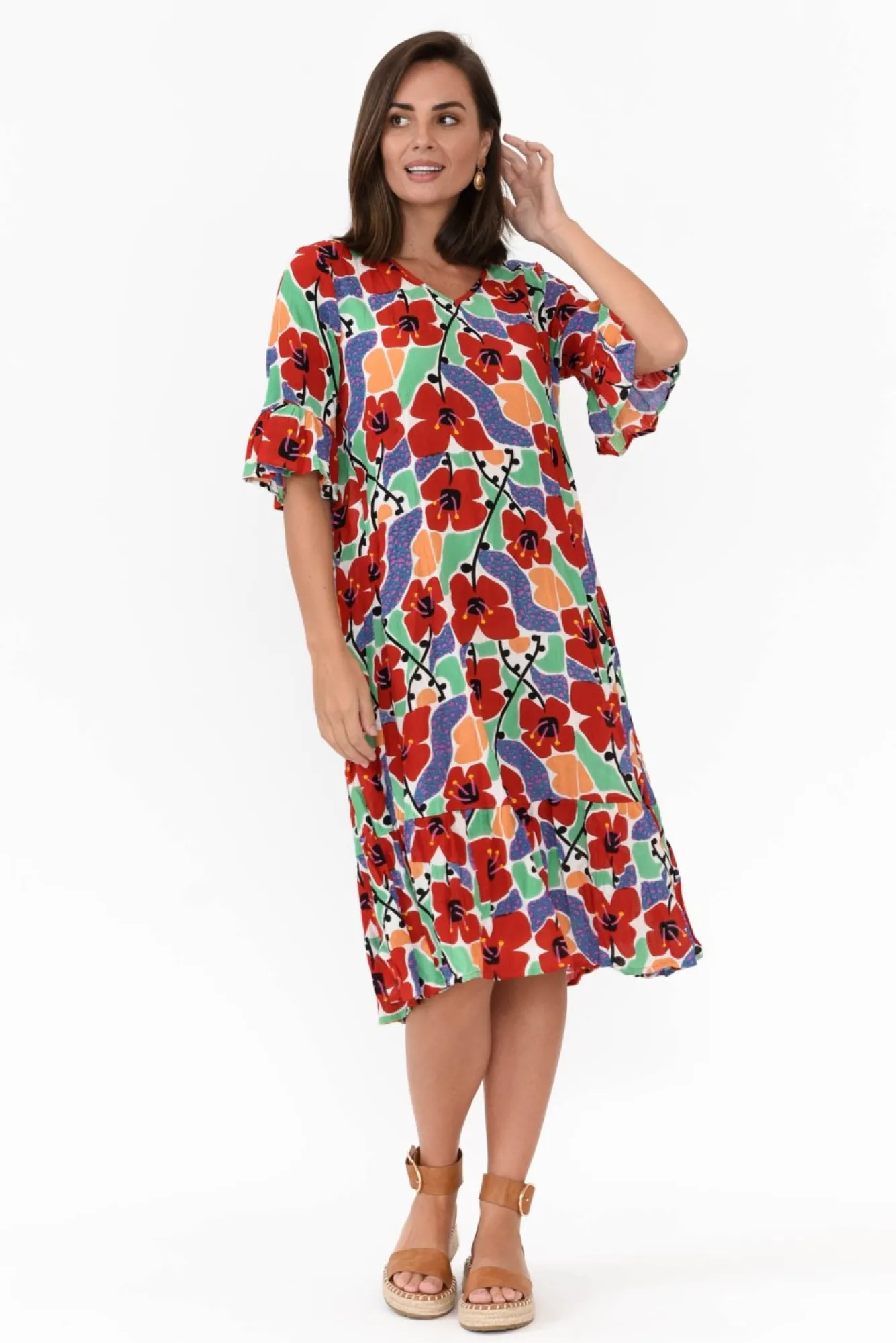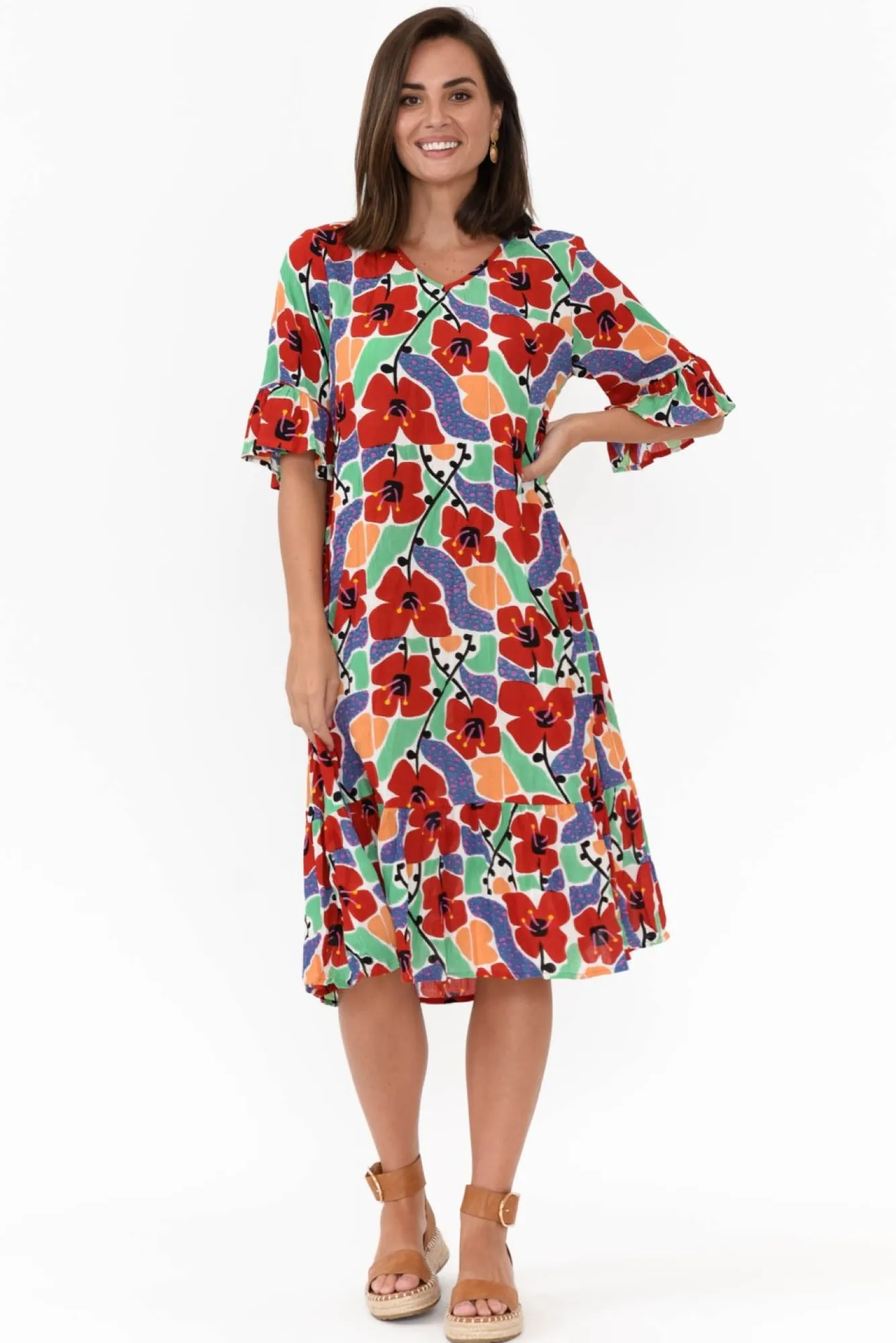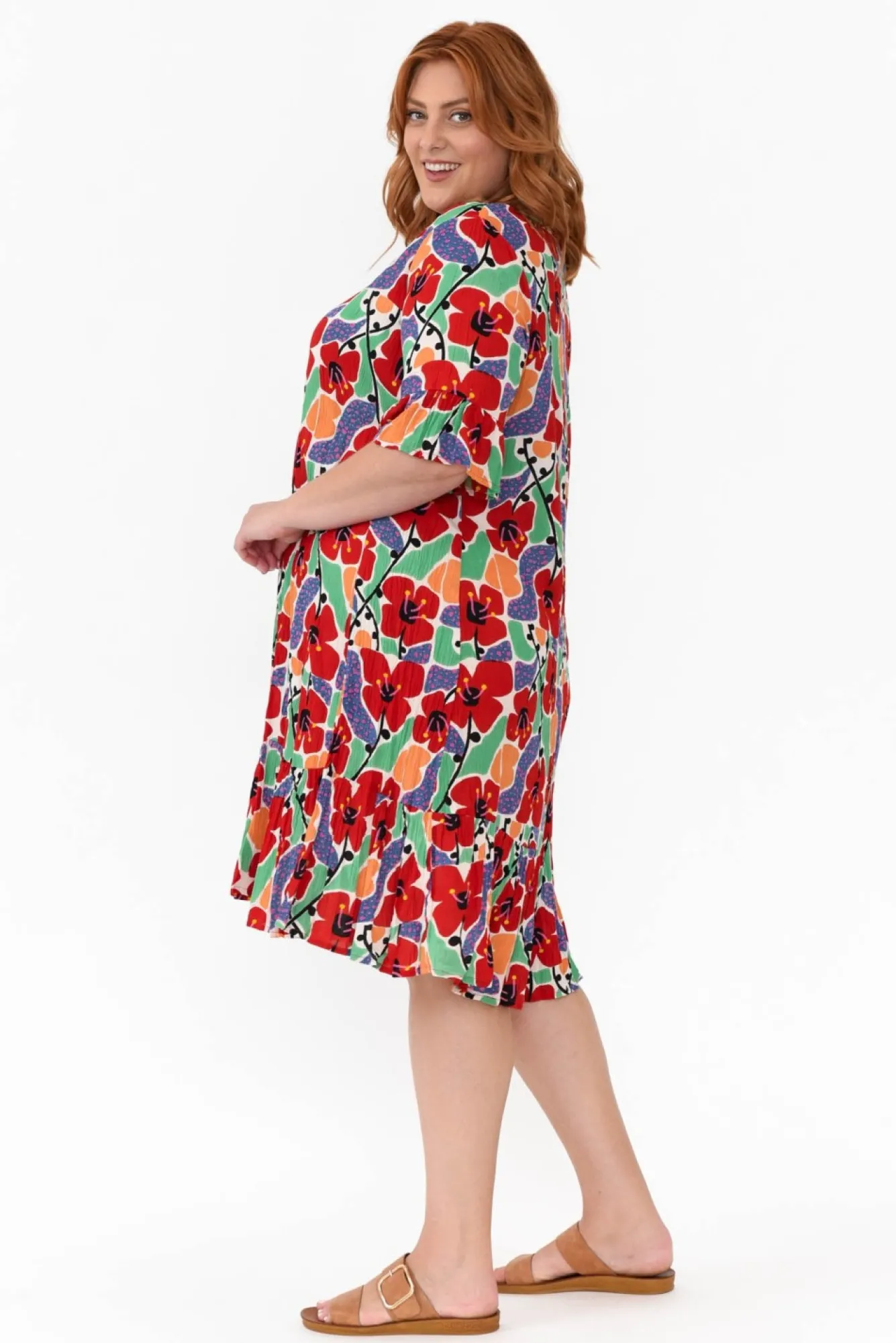 Fit: True To Size. Refer To Size & Fit Tab Below For Specific Size RecommendationNNfabric: 100% RayonNlovely Soft And Lightweight Rayon FabricNcustomer Favourite Crinkle Texture Requires No Ironing! Nclassic A-Line Silhouette Flows Over CurvesNdesigned With A Simple V-NecklineNhalf Length Sleeves With Fun Flared CuffsNruffled Flare Hemline Falls To The KneeNNcare: Cool Gentle Hand Wash RecommendedNNcolour: Blue And Green Base With Gorgeous Red PoppiesNN Note:Please See Photos Rather Than Video For Most Accurate Colour.