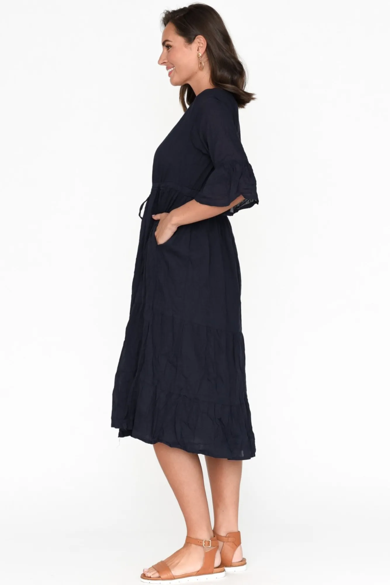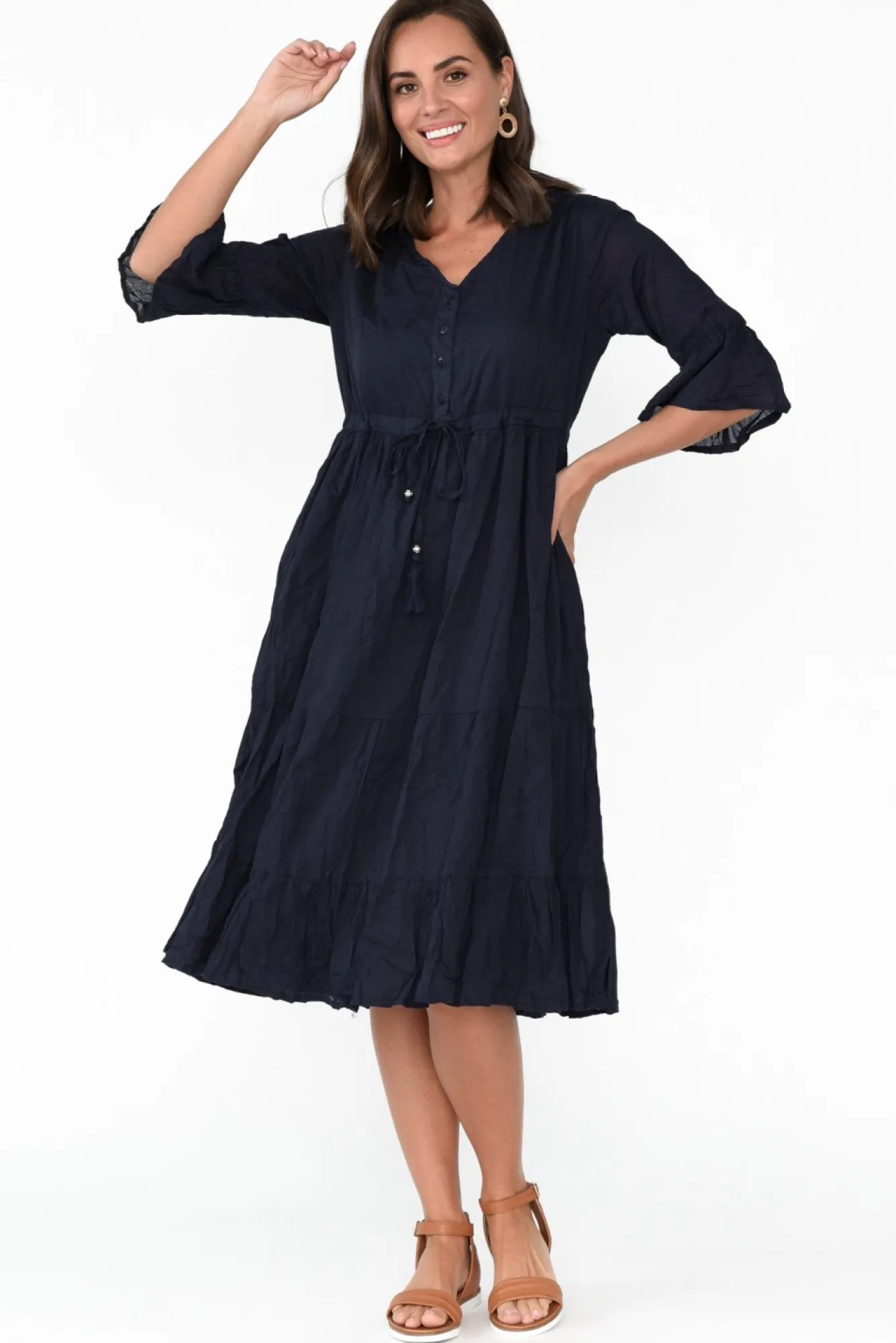 Fit: True To Size. Refer To Size & Fit Tab Below For Specific Size RecommendationNNfabric: 100% Cotton Nlightweight And Breathable Cotton In A Customer Favourite Crinkle CottonNNsoft V-Neckline With A Button Front To The Waist NNthree-Quarter Sleeves With A Flared, Frill DetailNclassy A-Line Silhouette Featuring A Tiered SkirtNNdrawstring Waist For A Personalised Fit, Featuring Soft Pleating Details Nfunctional Style Features Two Hip Pockets NNstraight Hem Falls Below The Knees NNcare: Cool Gentle Hand Wash RecommendedNNcolour: Navy Blue NNfabric Tip: Store It Rolled Up Either In The Wardrobe Or In Your Suitcase To Keep The Crinkle Alive!NN Note:Please See Photos Rather Than Video For Most Accurate Colour.
