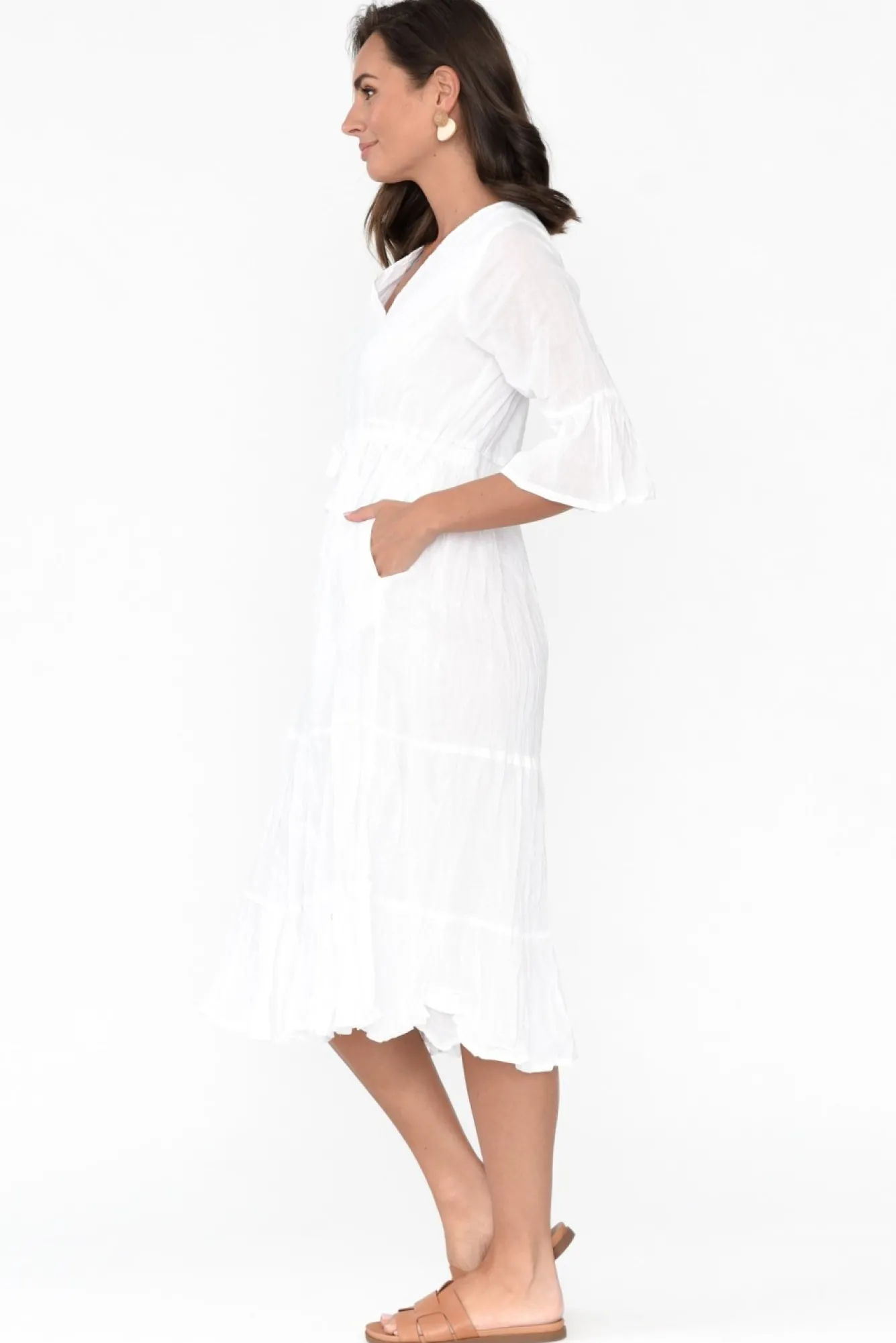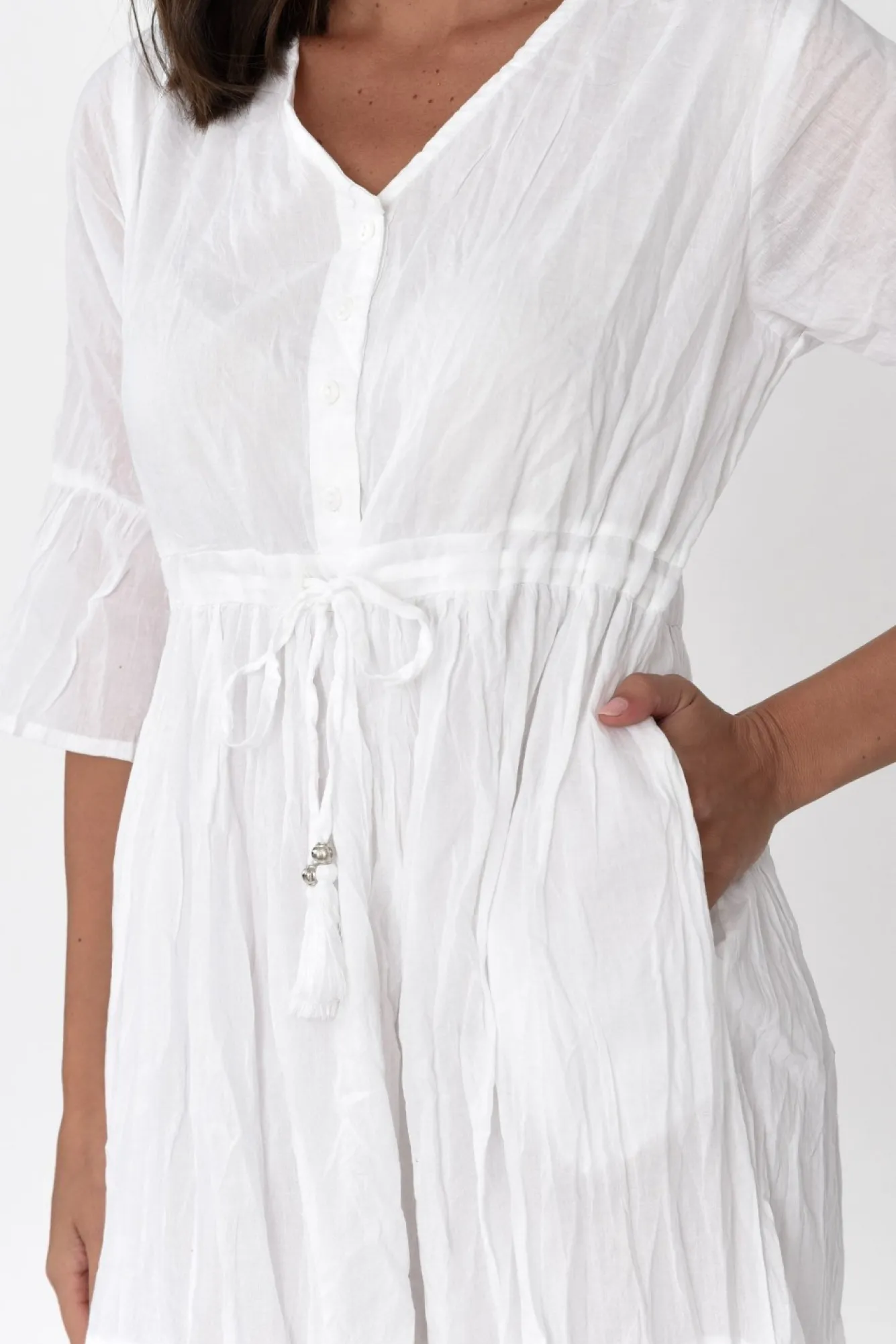 Fit: True To Size. Refer To Size & Fit Tab Below For Specific Size RecommendationNNfabric: 100% Cotton Nlightweight And Breathable Cotton In A Customer Favourite Crinkle CottonNNfabric Is Semi Sheer, We Recommend Pairing With Nude Undergarments Ntimeless V-Neck Style Flows To A Button Front NNthree-Quarter Sleeves With A Flared, Frill DetailNeffortless Tiered A-Line SilhouetteNNdrawstring Waist For A Personalised Fit, Featuring Soft Pleating Details Nfunctional Style Features Two Hip Pockets NNstraight Hem Falls Below The Knees NNcare: Cool Gentle Hand Wash RecommendedNNcolour: Classic WhiteNNfabric Tip: Store It Rolled Up Either In The Wardrobe Or In Your Suitcase To Keep The Crinkle Alive!