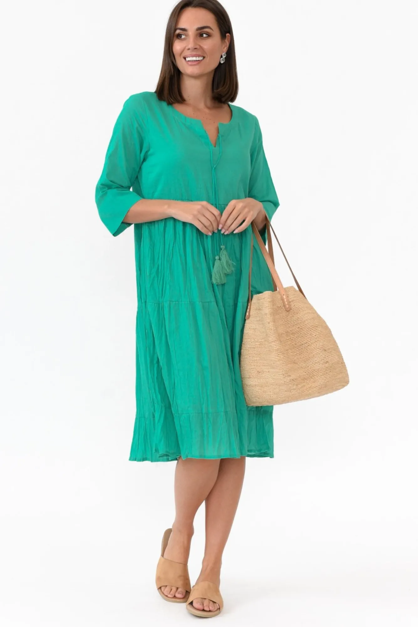 Fit: True To Size. Refer To Size & Fit Tab Below For Specific Size RecommendationNNfabric: 100% CottonNbreezy And No-Fuss Crinkle Cotton Offering A Lightweight, Non-Stretch Feel And Wonderful BreathabilityNNv-Split Neckline With Adjustable Tassel Tie Nstraight 3/4 Length Sleeves With Cuff Stitch Detail NNa-Line Silhouette Accentuated By Tiered Skirt And Under-Bust Seam NNfully Lined Style For Added CoverageNfalls To Knee Length NNNcare: Cool Gentle Hand Wash RecommendedNNcolour: Light Emerald HueNNfabric Tip: Twist The Garment, Fold In Half And Secure With A Rubber Band To Store After Washing And Drying To Keep The Crinkle Alive