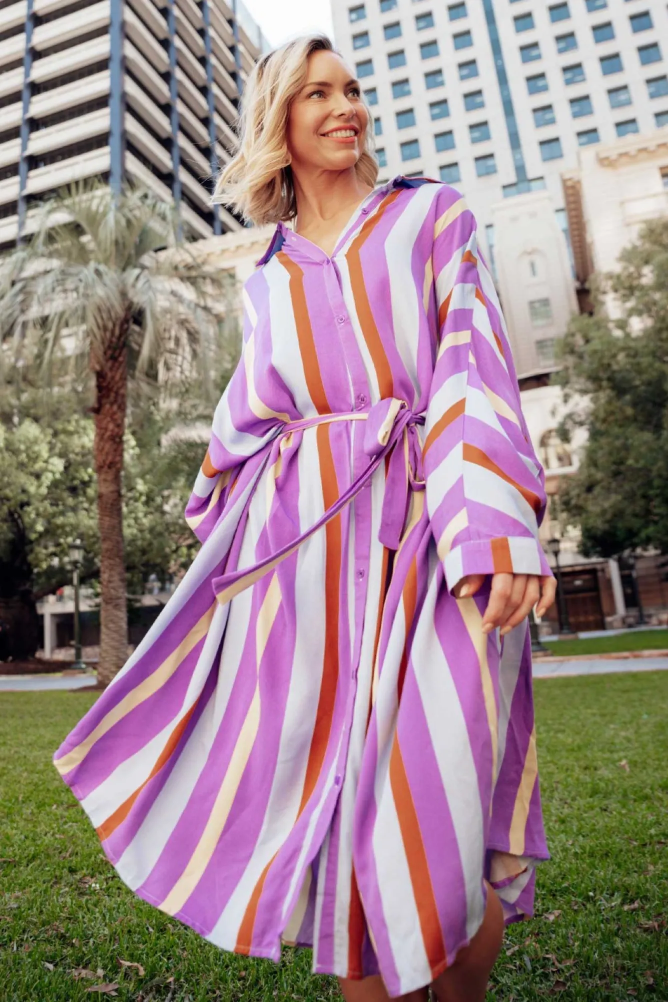 Fit: Relaxed Fit. Refer To Size & Fit Tab Below For Specific Size RecommendationNNfabric: 100% RayonNsilky Smooth, Non-Stretch Rayon With A Billowy Drape And Lightweight FeelNcollared Neckline Complemented By A Button Front In A True Shirt Dress StyleNfull-Length Sleeve Featuring A Dramatic Drop Shoulder For A Relaxed FitNNeffortless Drape SilhouetteNoptional Matching 185Cm Waist Tie To Create ShapeNNtwo Functional Hip Pockets NNstraight Hem Falls Just Below The KneeNNcare: Cool Gentle Machine Wash RecommendedNNNcolour: Wonderful Summer Stripe Print With Purple, Blue, Orange And Yellow