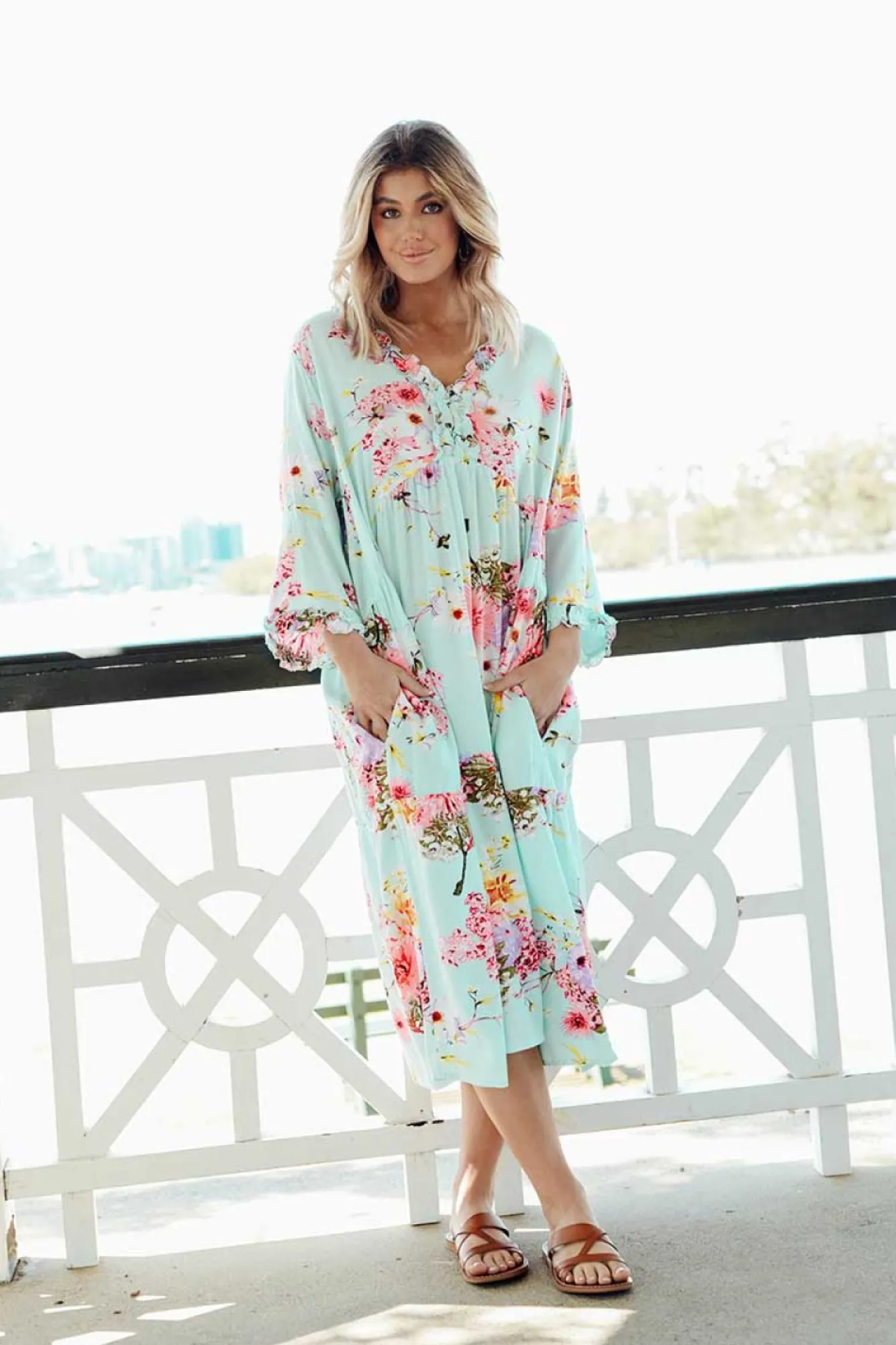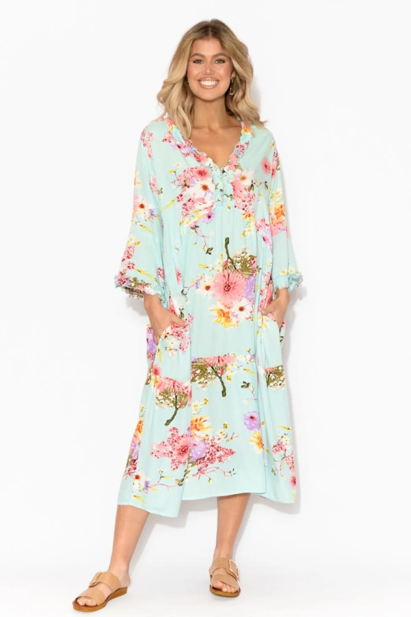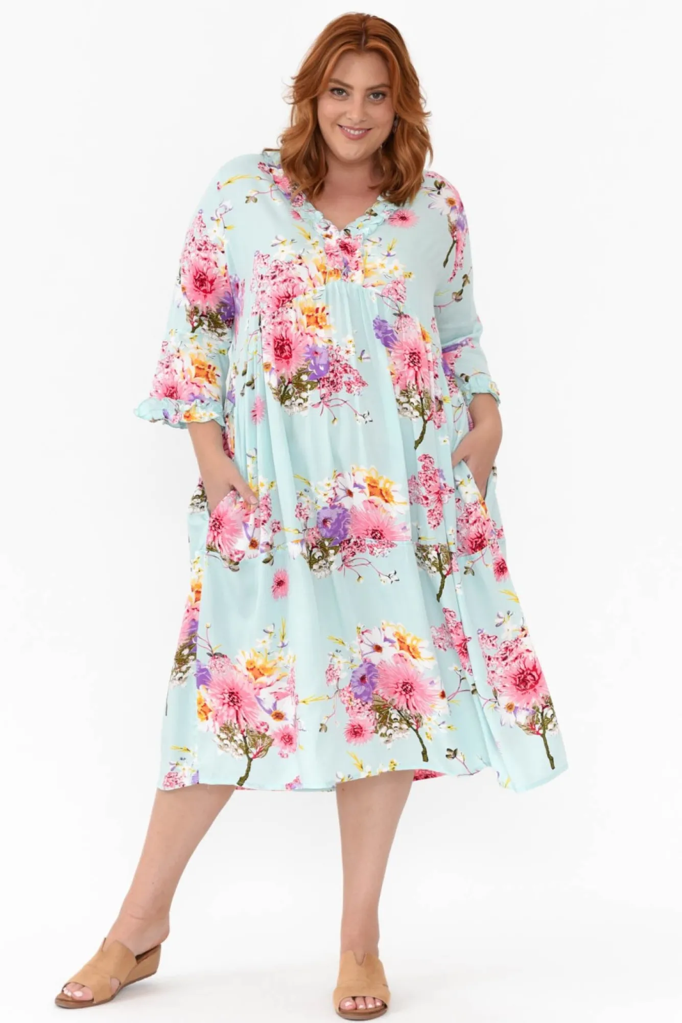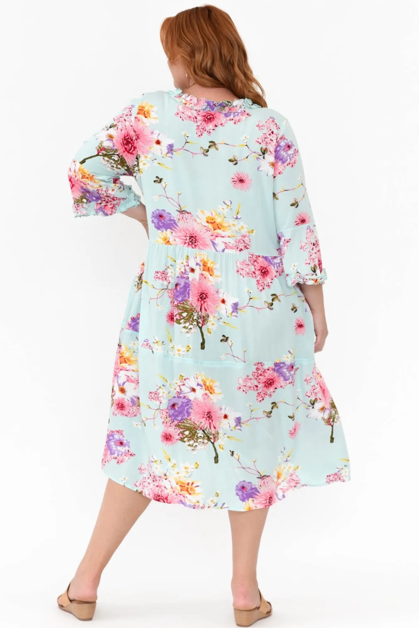 Fit: Slightly Oversized: Refer To The Size GuideNNfabric: 100% RayonNlightweight, Soft, Breathable, Non-Stretch Fabric Nv-Neckline With Feminine Ruffle DetailingN3/4 Length SleevesNNsubtle Peak Upwards From Waist Creating A Waist CinchNhip PocketsNswing SilhouetteNmidi Length NNcare: Cool Gentle Hand Wash RecommendedNNcolour: Light Blue Base With A Gorgeous Cherry Blossom Pattern OverlayNnote:Please See Photos Rather Than Video For Most Accurate Colour.