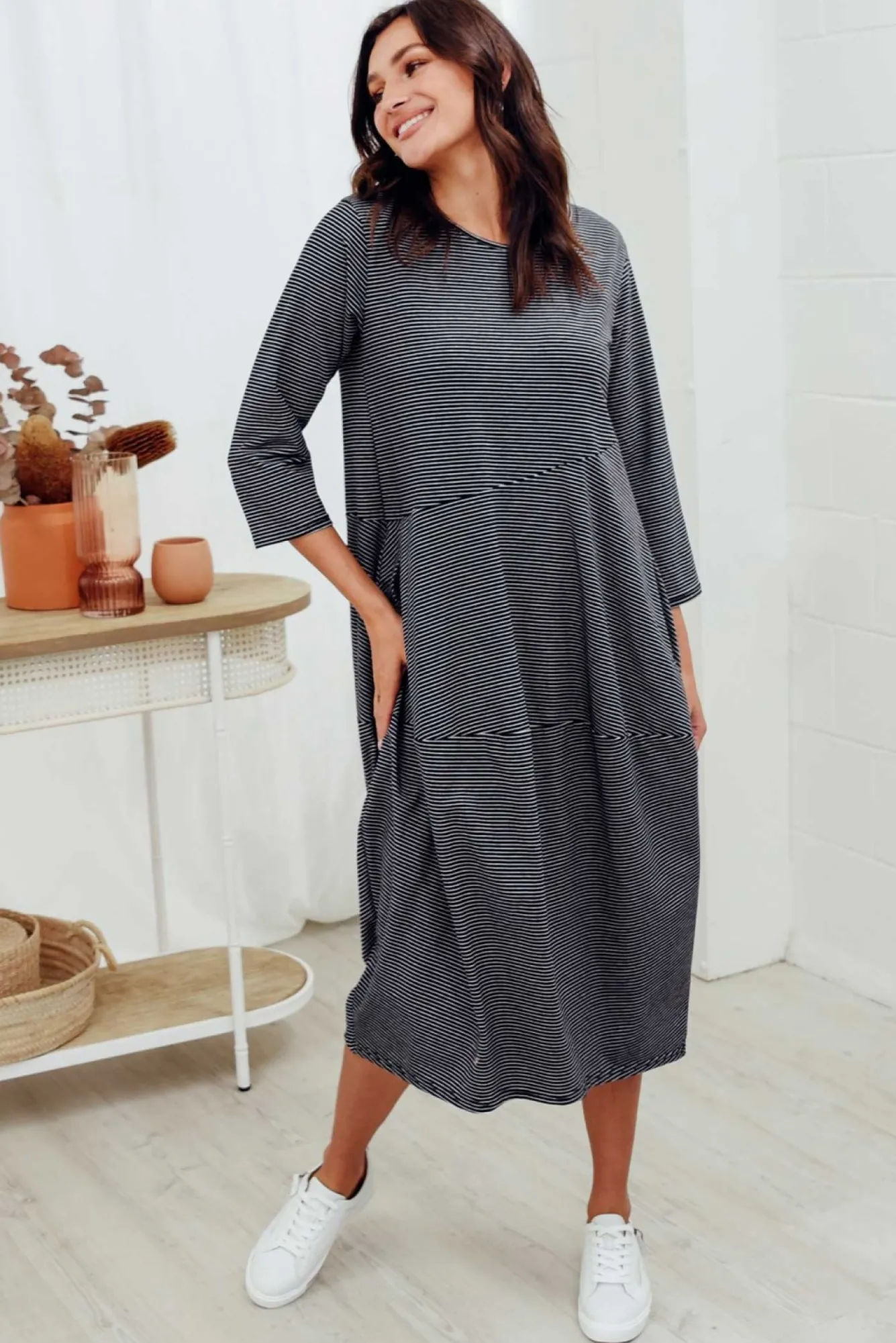 Fit: True. Refer To Size & Fit Tab Below For Specific Size RecommendationNNfabric: 95% Cotton, 5% ElastaneNluxurious Midweight And Ultra-Soft Cotton Blend Fabric With Slight Stretch Nclassic Rounded Neckline And 3/4 Length SleevesNhorizontal Stripes Contrast With The Diagonal Seams Down The DressNtwo Internal Front PocketsNstructured Drape Elevates The Look Without Sacrificing ComfortNNballoon Silhouette Is Accentuated By The Tapered Hemline Nbelow-Knee LengthNNcare: Cool Gentle Hand Wash RecommendedNNNcolour: Lovely Black And White Striped Print