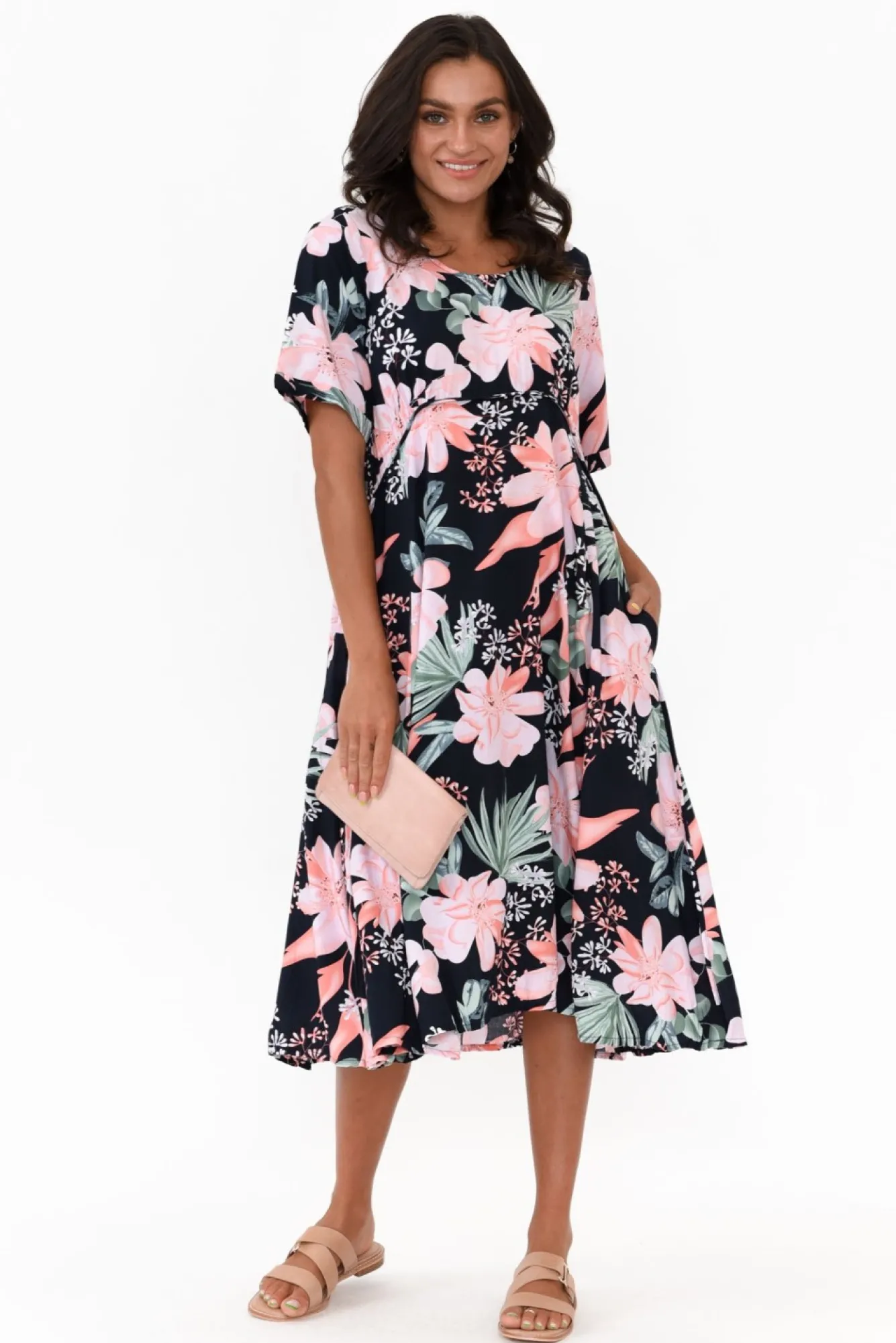 Fit: True To Size. Refer To Size & Fit Tab Below For Specific Size Recommendation NNfabric: 100% RayonNthe Perfect Everyday Dress That Will Become A Wardrobe Favourite Nlovely Lightweight, Breathable And Non-Stretch Fabric Nfeaturing No-Fuss Crinkle Textured Fabric NNsoft Rounded Neckline NNshort Sleeves With Lovely Cuffed Detail NNflattering Relaxed A-Line Silhouette Ngorgeous Curved Waistline Ntwo Discreet Hip Pockets Nstraight Hemline Falls Below Knee Length NNNcare: Cool Gentle Hand Wash RecommendedNNcolour: Deep Navy Base With A Lovely Pink Hibiscus Print