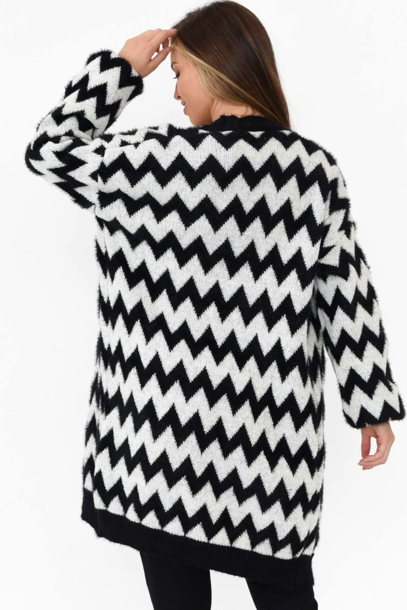 Fit: True To Size. Refer To Size & Fit Tab Below For Specific Size RecommendationNNfabric: 85% Acrylic 15% PolyesterNcozy Midweight, Soft And Fuzzy Acrylic Cardigan NNopen Collarless Design NNsubtle Balloon Sleeves With Tapered CuffNNslouchy Relaxed Straight Silhouette WNNstraight Hem Fall To Mid-Thigh Length NNNcare: Cool Gentle Hand Wash RecommendedNNcolour: Striking Oversized Black And White Chevron Print