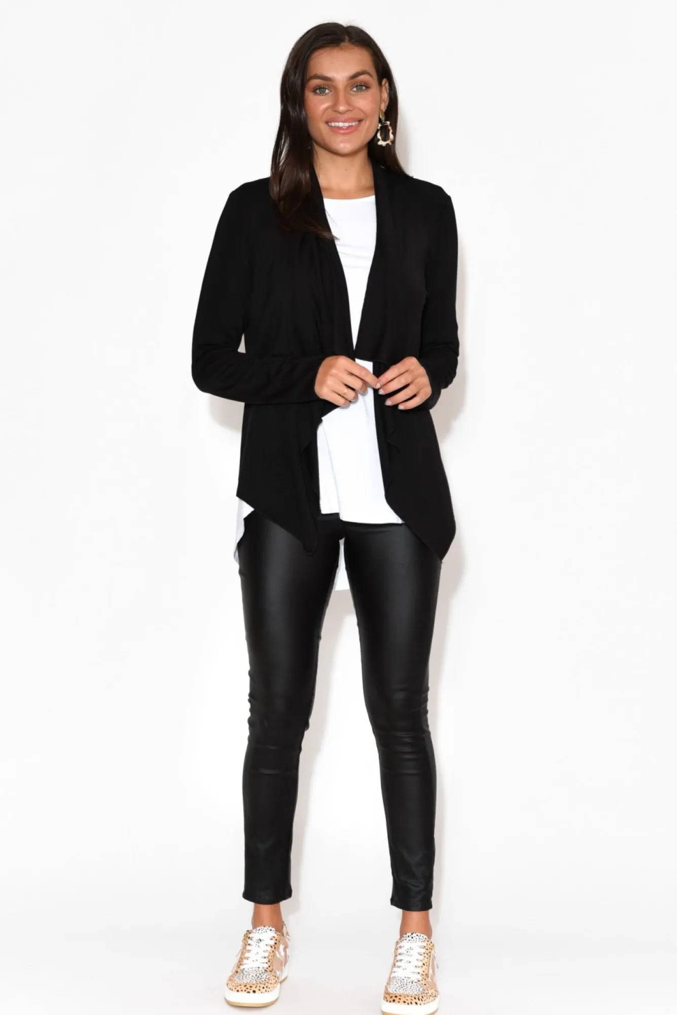 Fit: True To Size. Refer To Size & Fit Tab Below For Specific Size Recommendation NNfabric: 93% Bamboo, 7% ElastaneNpremium, Ultra-Soft And Stretchy, Mid-Weight Bamboo FabricNNtrendy Open Style JacketNthe Waterfall Hemline Drapes Down The BodyNlong Slimming SleevesNNcropped Length Hits Above The HipsNNcare: Cool Gentle Machine Wash RecommendedNNcolour: Classic Black Shade