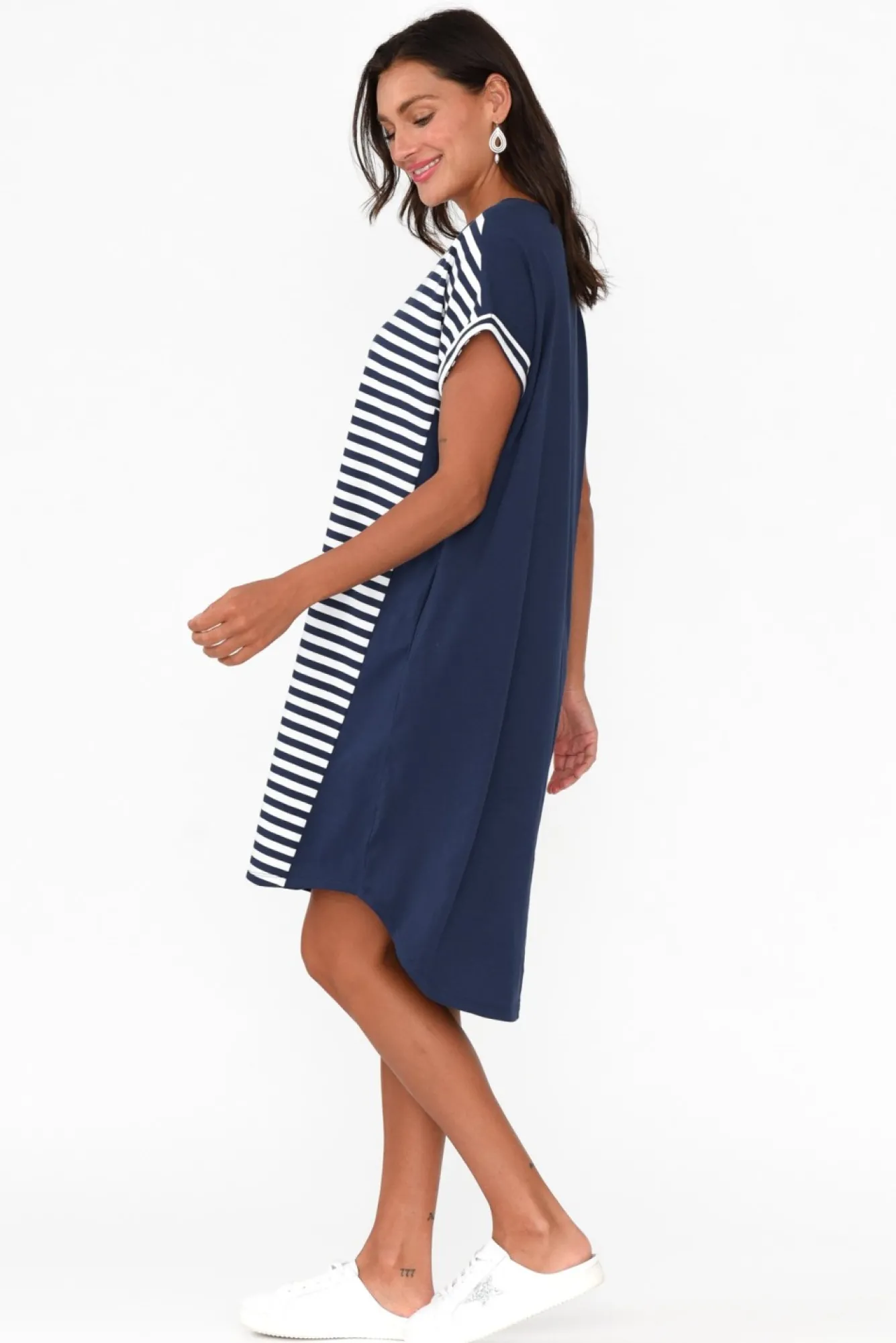 Fit: True To Size. Refer To Size & Fit Tab Below For Specific Size RecommendationNNfabric: 100% Cotton Nlightweight, Breathable, 100% Australian Cotton With A Soft Finish And A Subtle StretchNNhigh, Rounded Neckline NNshort Cap Sleeves With A Rolled Hem Create A Casual Look Nstraight T-Shirt Silhouette With Stitching Details Down The Sides NNtwo Hip Pockets NNhi-Lo Hem Sits Just Above The Knees At The Front And Lower At The Back NNcare: Cool Gentle Machine Wash RecommendedNNcolour: Navy And White Stripe With Solid Navy Side PanelsNN Note:Please See Photos Rather Than Video For Most Accurate Colour.