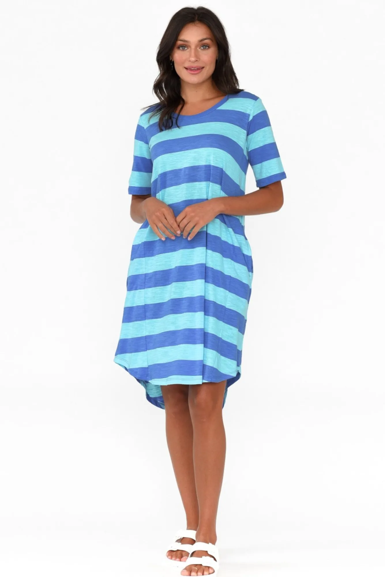 Fit: True. Refer To Size & Fit Tab Below For Specific Size RecommendationNNfabric: 100% CottonNlightweight, Soft, Stretchy And Breathable CottonNsimple Round NecklineNNshort Tee SleevesNtwo Discreet Pockets Located At The HipNslight A-Line Silhouette Creates A Feminine LookNNcurved Hi-Lo Hemline Falls Just Short Of The KneeNNcare: Cold Gentle Machine Wash RecommendedNNcolour: Stripe Design With Aqua And Blue Shades