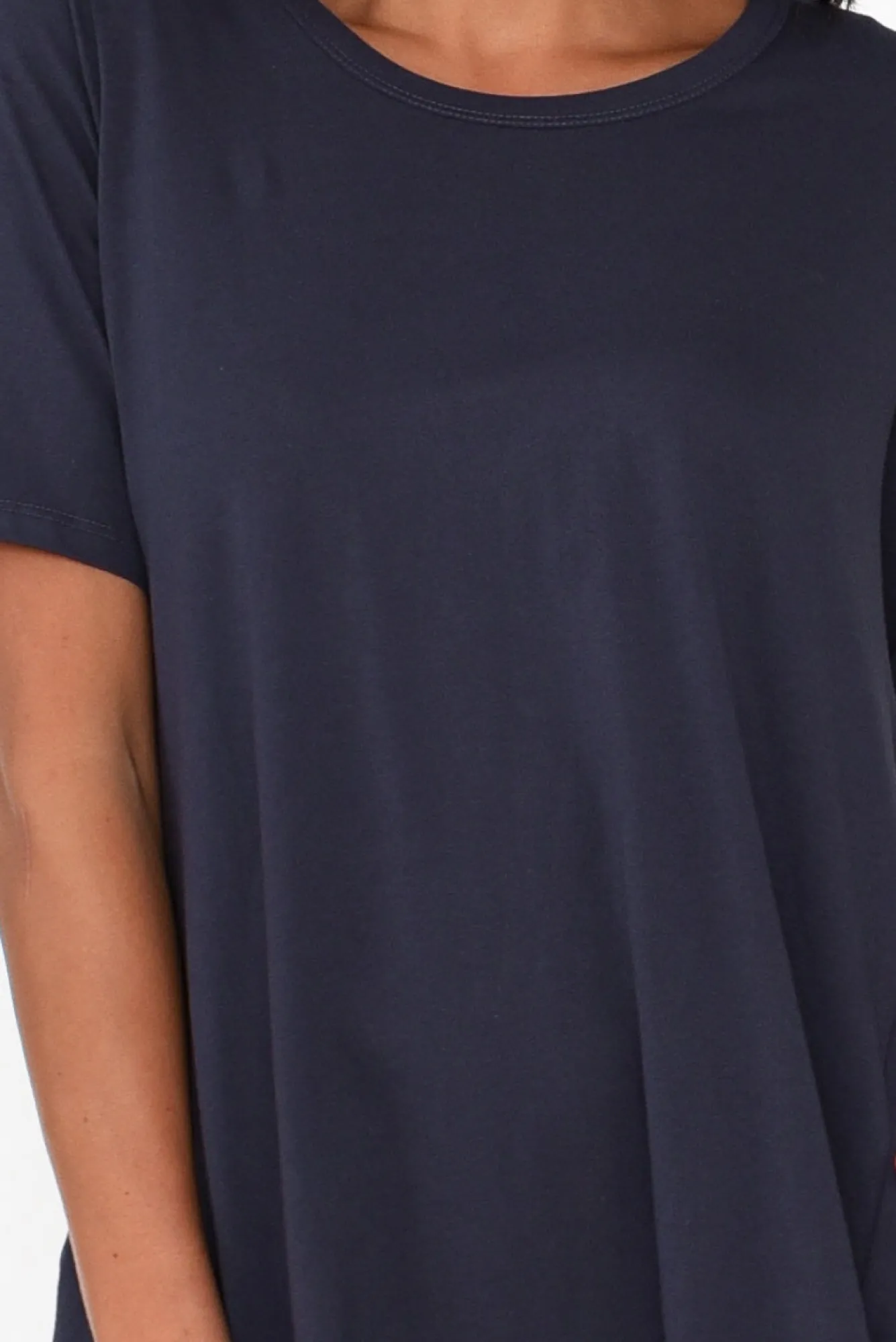 Fit: True. Refer To Size & Fit Tab Below For Specific Size RecommendationNNfabric: 100% CottonNlightweight, Soft, Stretchy And Breathable CottonNsimple Round NecklineNNclassic Straight Sleeves Fall Just Above The ElbowNtwo Discreet Pockets Located At The HipNsubtle A-Line SilhouetteNcurved Hi-Lo Hemline Falls Just Short Of The KneeNNcare: Cold Gentle Machine Wash RecommendedNNcolour: Navy Blue