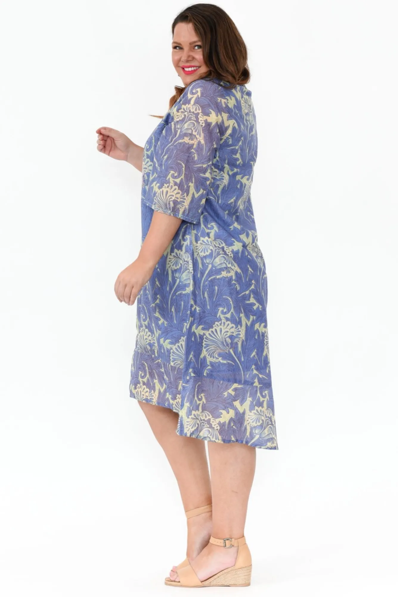 Fit: True To Size. Refer To Size & Fit Tab Below For Specific Size Recommendation NNfabric: 100% CottonNthe Perfect Dress To Elevate Your Spring And Summer WardrobeNcrafted From Lovely Lightweight, Breathable And Non-Stretch Fabric NNflattering V-Neckline With Fun Stitching Detail NN3/4 Length Sleeve With Dramatic Wide Cuff NNrelaxed A-Line Silhouette – A Summer Wardrobe Must Have!NNfloral Motif Features Sequin Detail Scattered ThroughoutNtwo Discreet Hip PocketsNfully Lined For Additional Coverage Nfeature Hi-Lo Hemline Falls Below Knee LengthNNNcare: Cool Gentle Hand Wash RecommendedNNcolour: Cornflower Blue Base With Regal Abstract Print