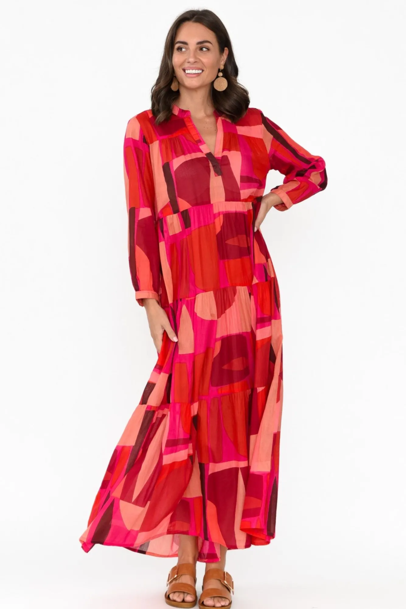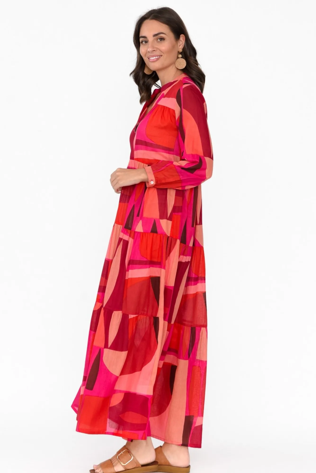 Fit: True To Size. Refer To Size & Fit Tab Below For Specific Size RecommendationNNfabric: 100% CottonNultra-Breathable And Lightweight Cotton With A Soft Woven Feel NNfabric Is Sheer, We Recommend Pairing With A SlipNNbanded Neckline Leads To A Deep V-Split Detail NN3/4 Length Sleeves With A Pearlescent Button CuffNNtiered A-Line Silhouette With Soft Pleating Starting At The Front Yoke NNstraight Hemline Falls To Versatile Maxi Length NNNcare: Cool Gentle Hand Wash RecommendedNNcolour: Gorgeous Geometric Print In Hues Of Red And Pink