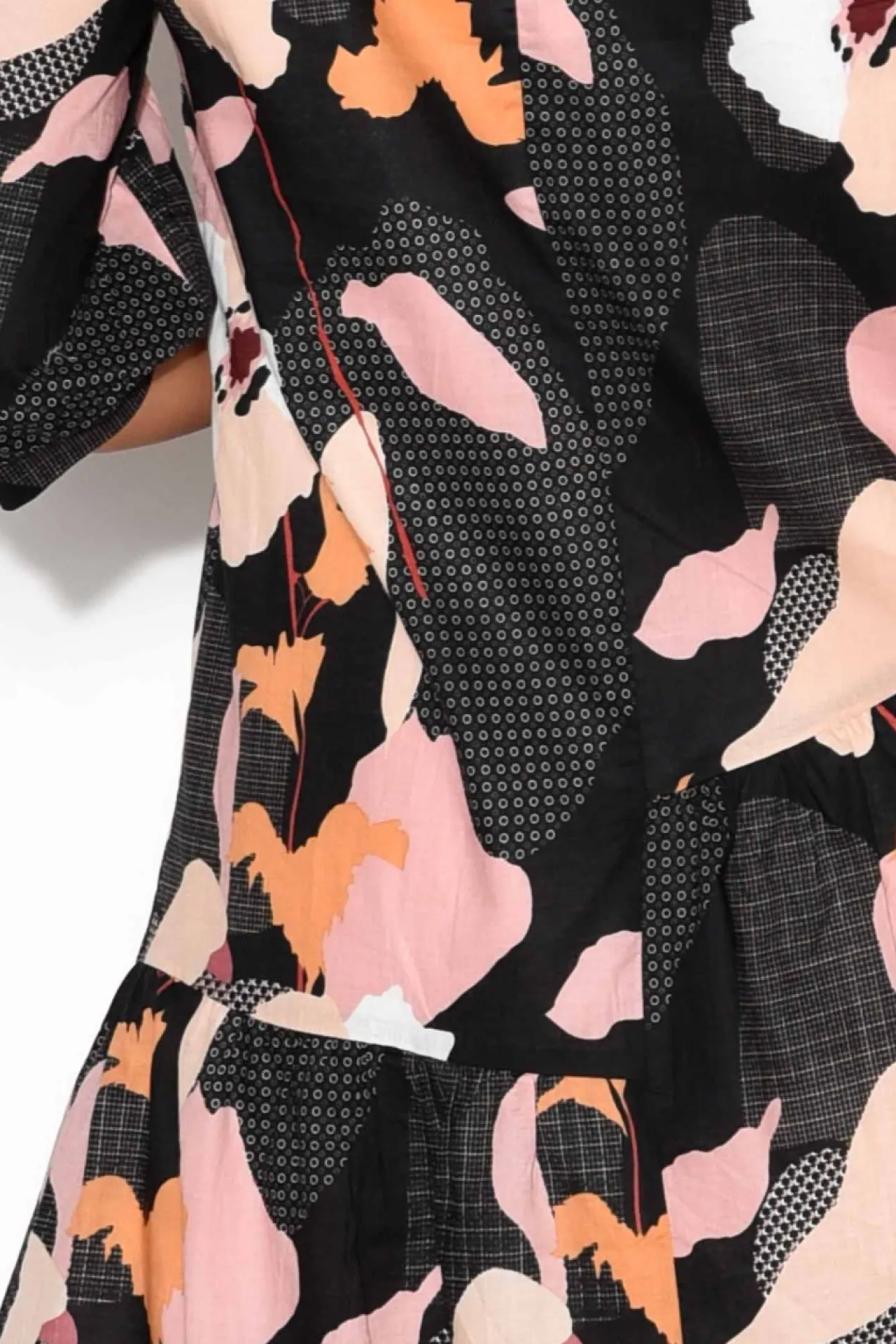 Fit: True To Size. Refer To Size & Fit Tab Below For Specific Size RecommendationNNfabric: 100% CottonNlightweight And Breathable, Full Lined Cotton Dress, With No StretchNNclassic Rounded NecklineNNhalf-Length Sleeve With Banded CuffNNa-Line Silhouette Accentuated By Asymmetric Tiers NNfeature Seams With Slight Pleats For A Full Body LookNNhemline Falls To A Below Knee LengthNNcare: Cool Gentle Hand Wash RecommendedNNcolour: Black Base With A Pink And Orange Geometric Floral Print Overlay
