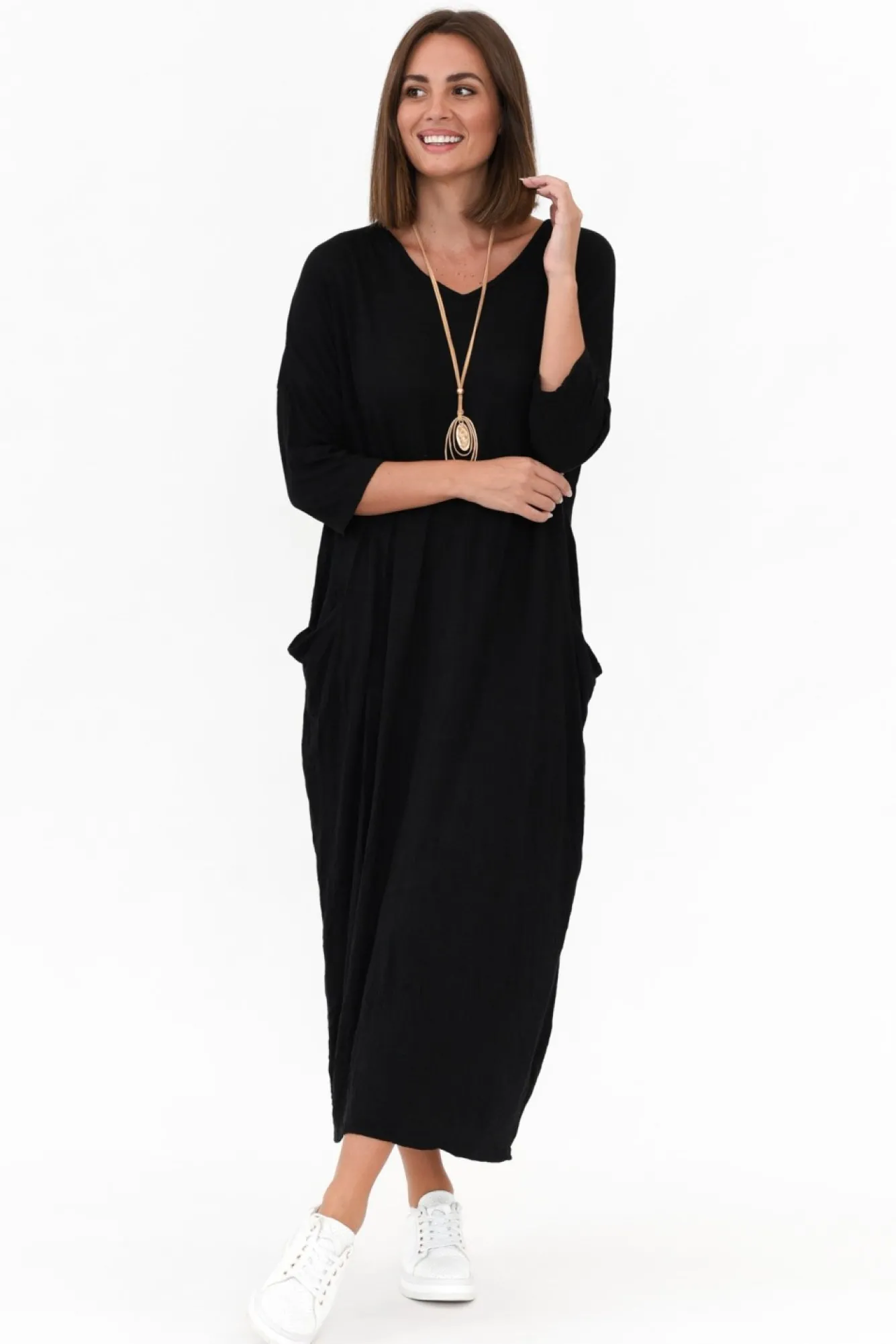 Fit: True. Refer To Size & Fit Tab Below For Specific Size Recommendation NNfabric: 100% CottonNluxurious Lightweight And Breathable Cotton Fabric With A Crinkle TextureNrounded V Neckline Highlights Collarbones NN3/4 Sleeves Fall Past The Elbow Nfeature Exterior Hip Pockets NNdraping Silhouette For A Relaxed, Yet Chic LookNslightly Tapered Hemline Hits A Midi LengthNNcare: Cool Gentle Machine Wash RecommendedNNcolour: Classic Black Shade