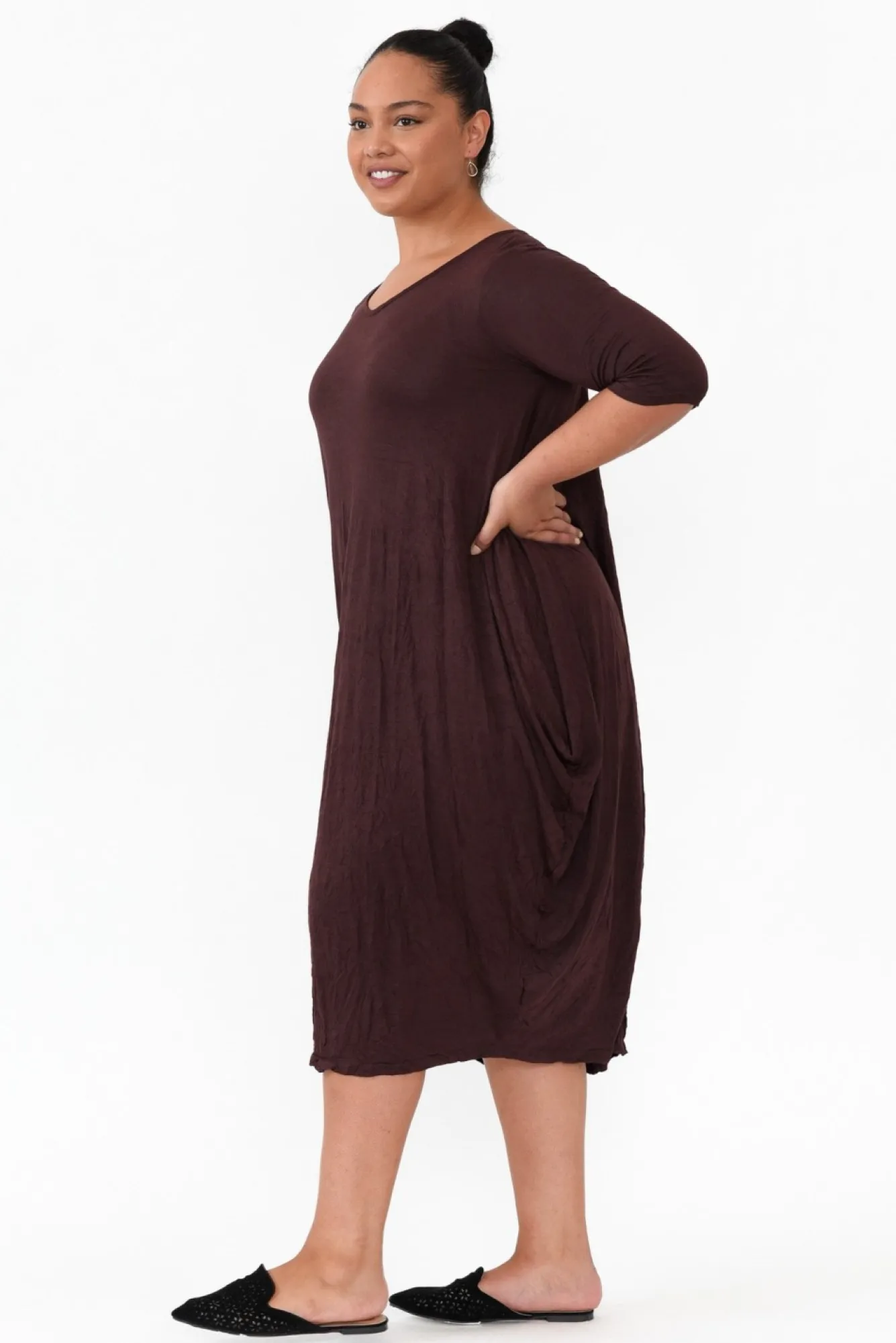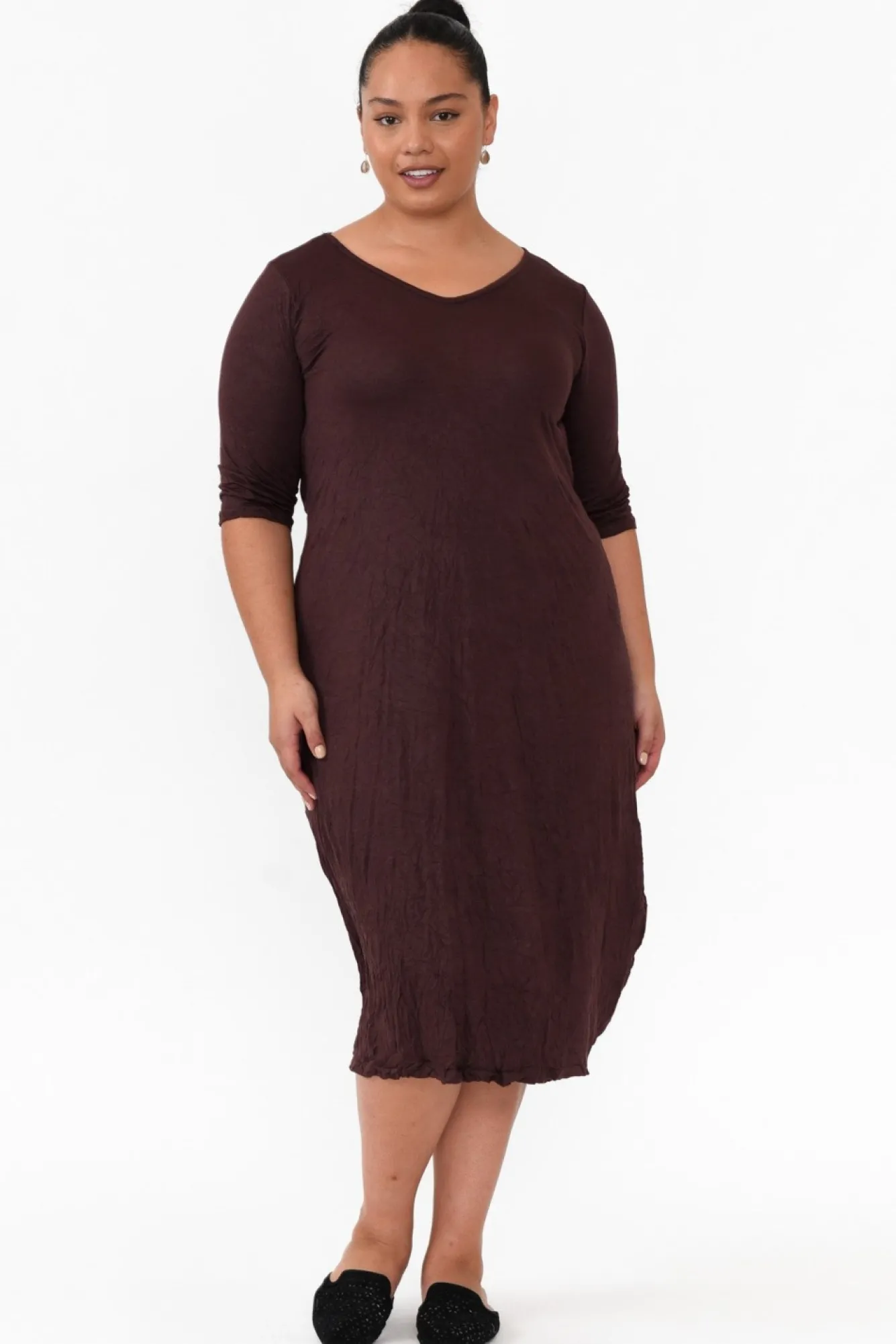 Fit: True To Size. Refer To Size & Fit Tab Below For Specific Size Recommendation NNfabric: 100% CottonNultra-Lightweight, Breathable And Soft Crinkle Cotton Fabric With A Comfortable StretchNNsoft V-NecklineNtimeless 3/4 Length Sleeves NNflattering Draped Silhouette Can Be Styled Four Different Ways Nstraight Hemline Falls To Midi Length NNcare: Cool Gentle Hand Wash RecommendedNNcolour: Warm Chocolate ShadeNNstyle Tip – Style 4 Ways: 1. Tie Straps At The Back 2. Tie Straps At The Front 3. Tuck Both Ties Through Buttonholes 4. Tuck Through And Tie Up One Or Both SidesNNnote: Please See Photos Rather Than Video For Most Accurate Colour.