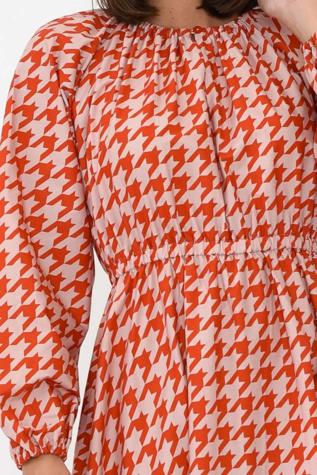 Fit: True To Size. Refer To Size & Fit Tab Below For Specific Size RecommendationNNfabric: 100% CottonNcrisp Cotton Poplin Fabric Offering Natural Breathability And A Structured DrapeNthe Elasticated Round Neckline Sits High And Features A Keyhole Button Closure At The FrontNstatement Puff Sleeves Extend To A Full Length And Finish With An Elastic CuffNNfloaty A-Line Silhouette For A Timeless Look Nfitted, Stretchy Waistband Flatters The MidlineNcurved Hem Falls To The Ankles NNNcare: Cool Gentle Machine Wash RecommendedNNcolour: Pink Base With A Sophisticated Red Houndstooth Overlay