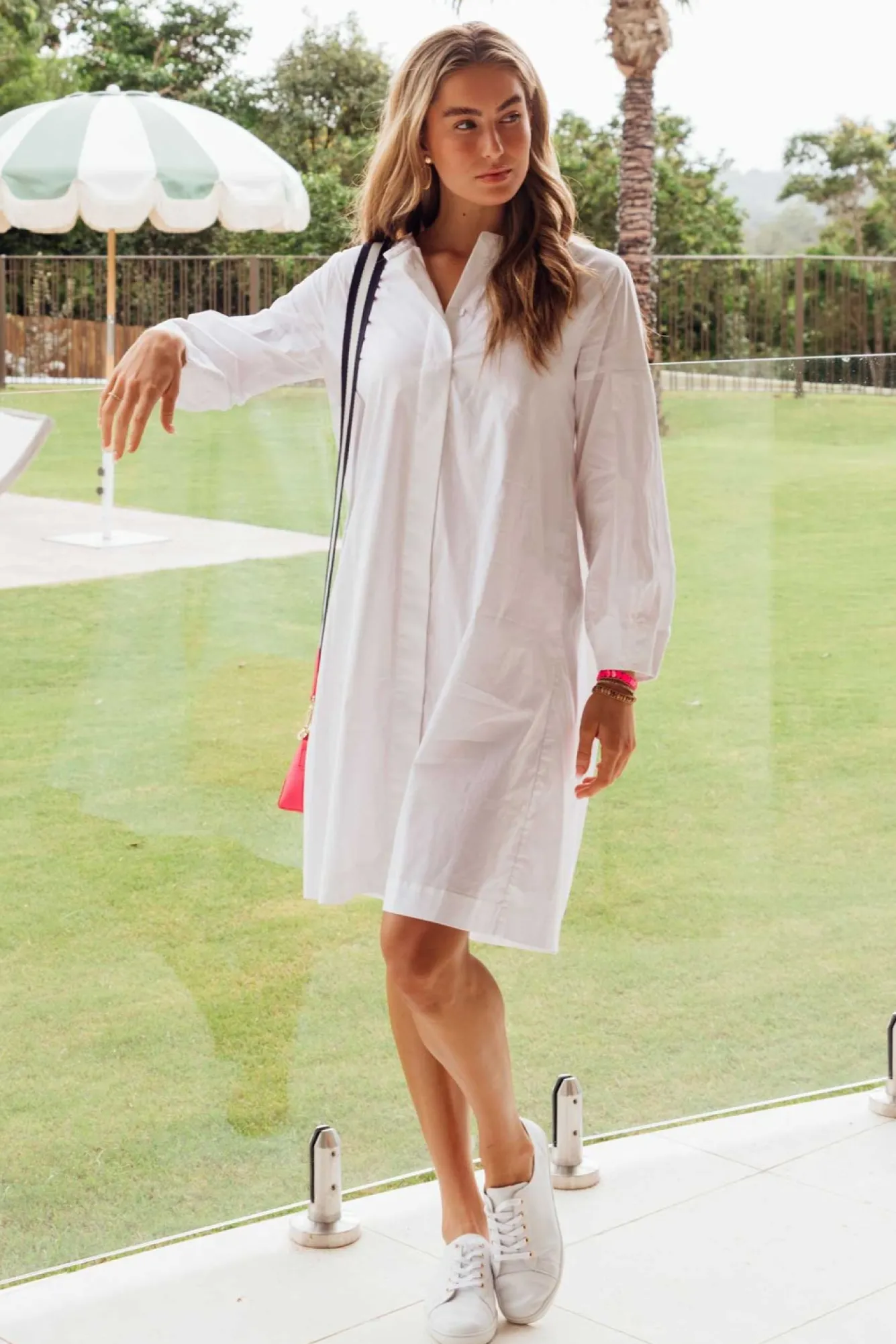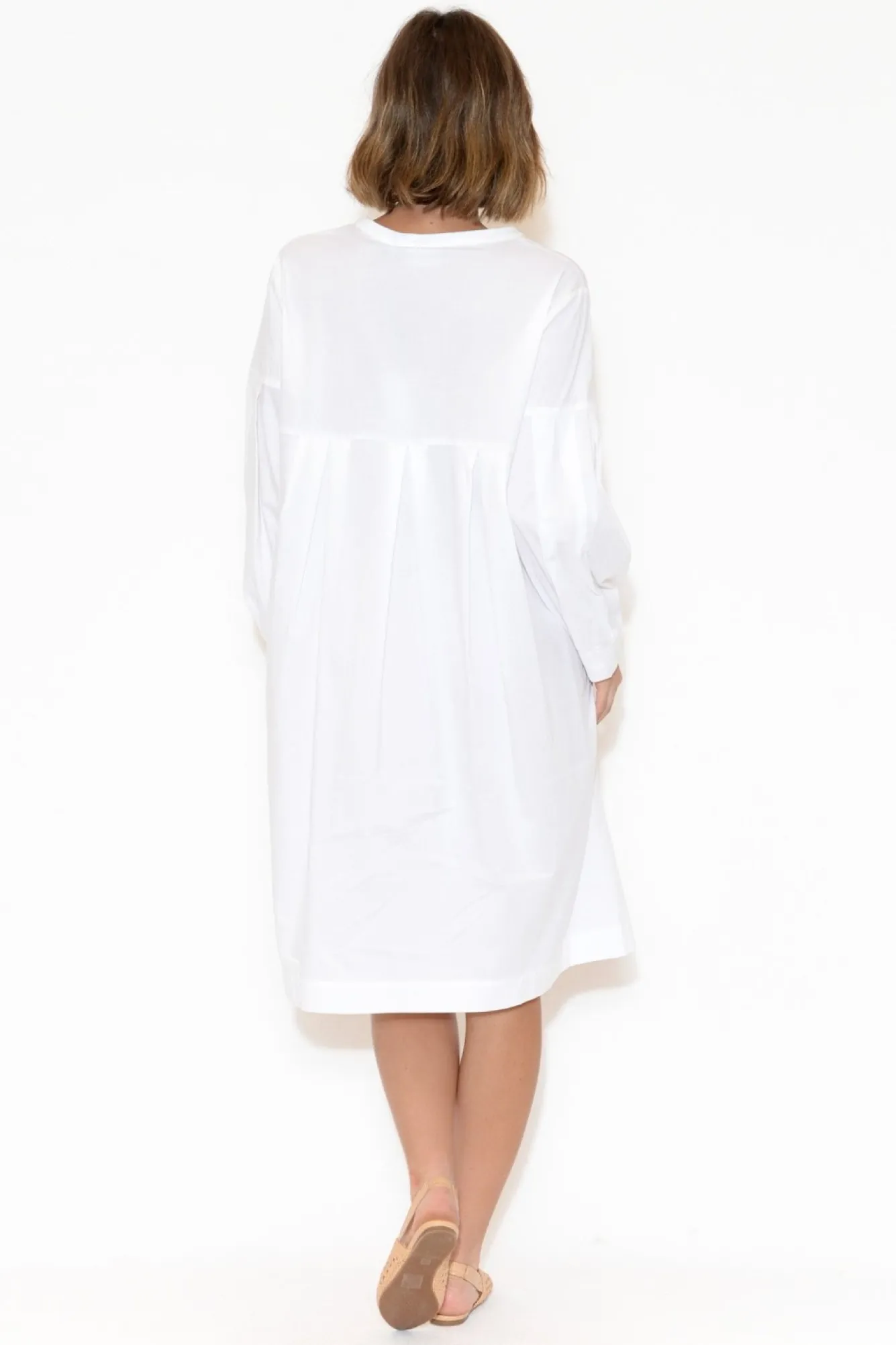 Fit: True To Size. Refer To Size & Fit Tab Below For Specific Size RecommendationNNfabric: 97% Cotton, 3% ElastaneNa Breathable, Non-Stretch Cotton Dress In A T-Shirt Inspired ShapeNhidden Button Up Style With Banded Round NecklineNNfull Length, Pleated Puff Sleeve With Non-Stretch CuffNNtrue A-Line Flare Created By Pleated BackNtwo Generous Hip Pockets Located At The HipNcrisp, Straight HemlineNNstyle Falls To The Knee – Above Or Below Dependent On HeightNNNcare: Cool Gentle Machine Wash RecommendedNNcolour: Cool WhiteNNstyle Tip: Due To The Sheer Nature Of White Garments, We Recommend Pairing With A Slip Dress For Added Coverage.