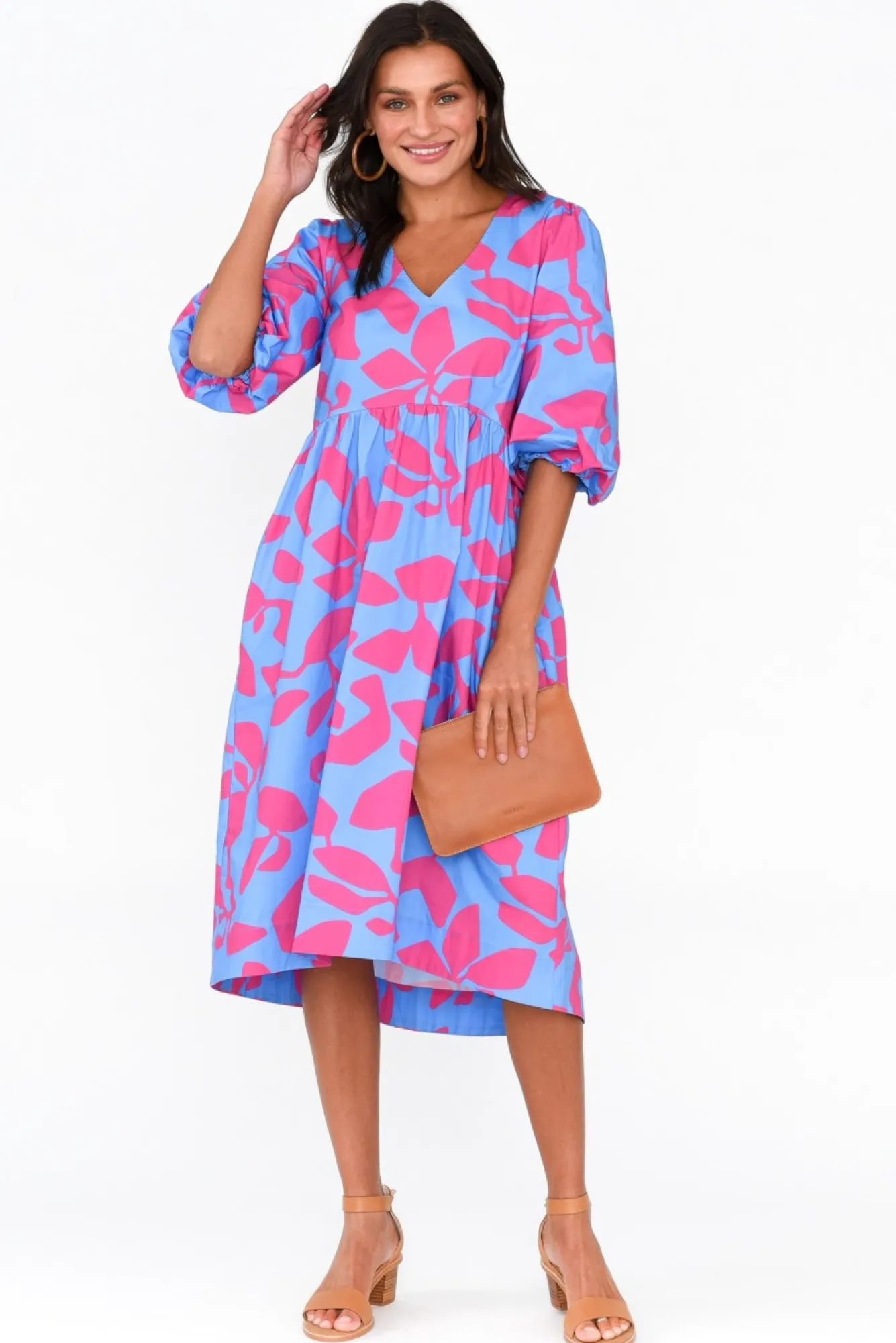 Fit: True To Size. Refer To Size & Fit Tab Below For Specific Size RecommendationNNfabric: 97% Cotton, 3% ElastaneNlightweight, Breathable And Non-Stretch Cotton Fabric With A Lovely Crisp Poplin Hand Feel NNdeep V-Neckline NNstatement Half-Length Puff Sleeves With An Elasticated Cuff NNsmock-Style Silhouette Enhanced By A Gathered Waist Seam NNtwo Discreet Side Seam Pockets NNsubtle Hi-Lo Hemline Falls Below Knee Length NNNcare: Cool Gentle Machine Wash RecommendedNNcolour: Vibrant Blue Base With Bright Pink Leaf Illustrations