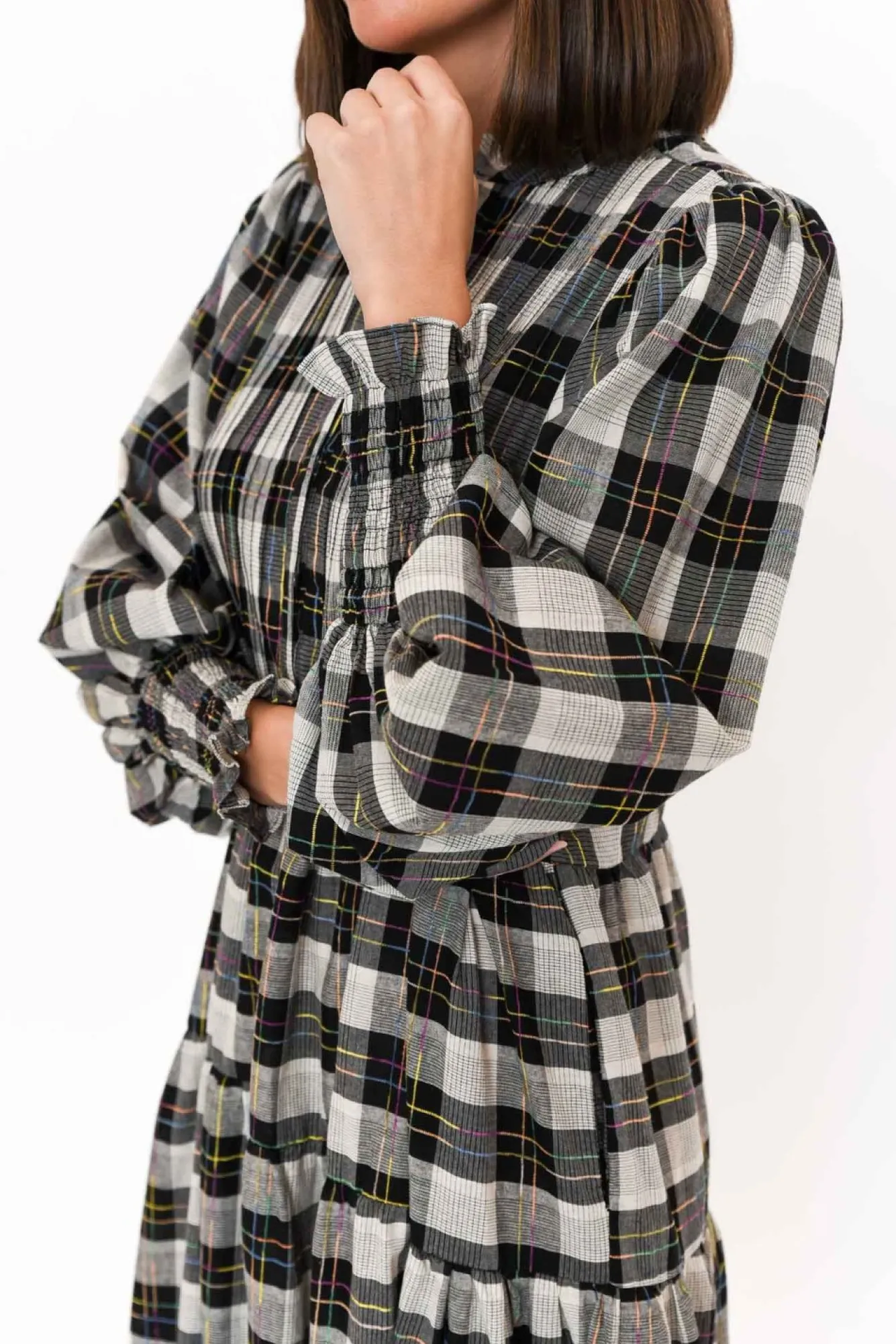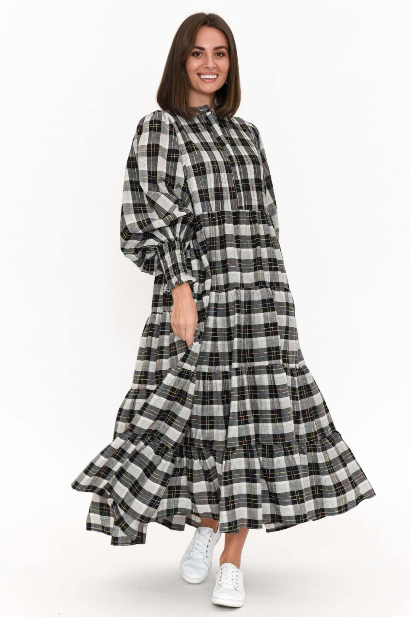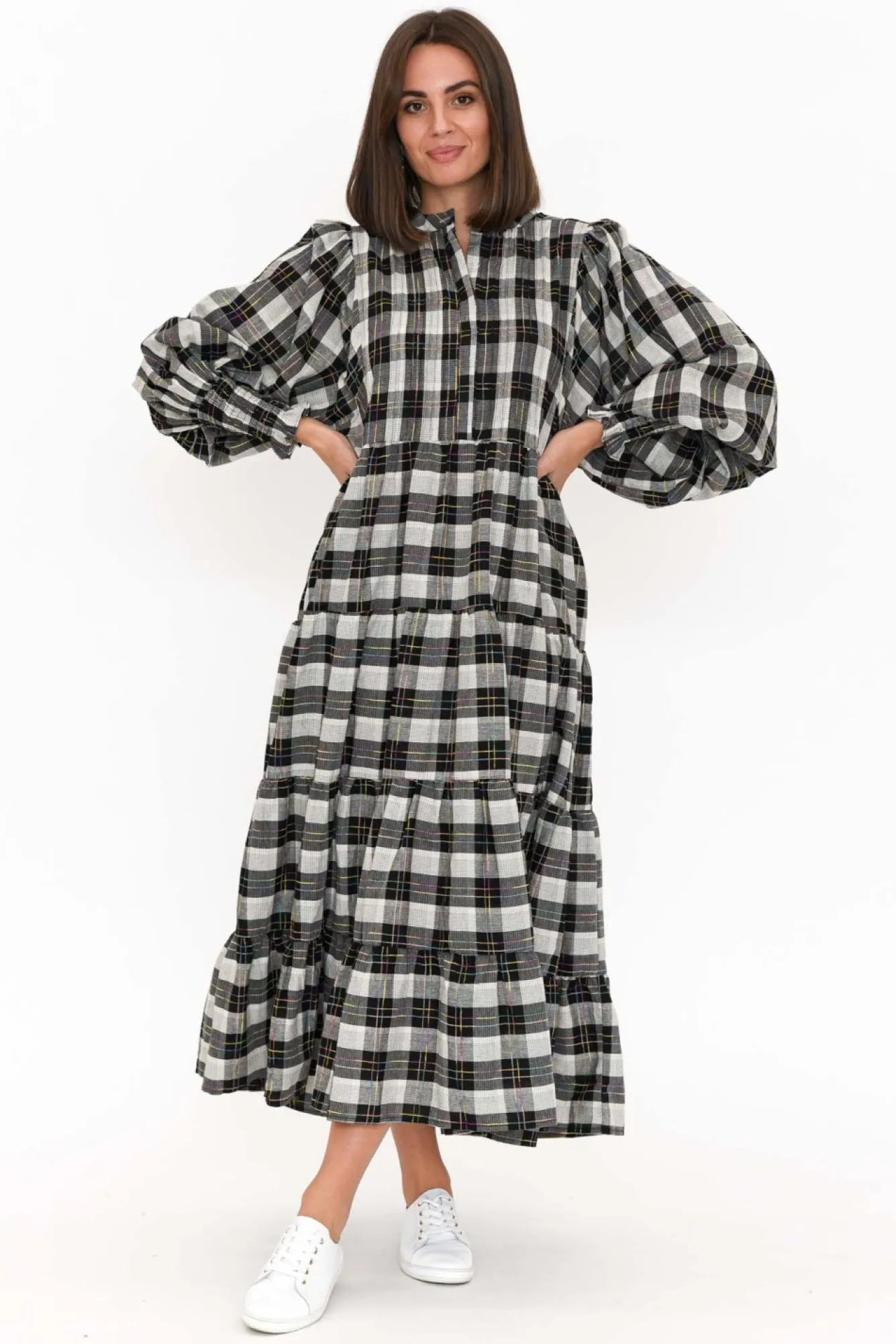 Fit: True To Size. Refer To Size & Fit Tab Below For Specific Size RecommendationNNfabric: 100% CottonNconstructed From Lightweight, Ultra-Breathable And Non-Stretch Cotton With A Soft Hand Feel Nround Banded Neckline Complements The Button-Down Front From Neck To WaistNstatement Ballon-Sleeves Accentuated By Fitted Shirred CuffsNversatile Tiered A-Line Silhouette Enhanced By Subtle Pleating Under Tiers Ntwo Discreet Hip Pockets NNdrapes To Classic Maxi Length NNNcare: Cool Gentle Hand Wash RecommendedNNcolour: Black And White Check With Delicate Multicolour Thread DetailingNNNNfit Tip: This Style Features A Non-Stretch Waist Seam That Must Fit Over Your Bust. If You Have A Larger Bust, We Suggest Sizing Up. Please Consult The Size & Fit Tab Below To Determine The Size Best For You.