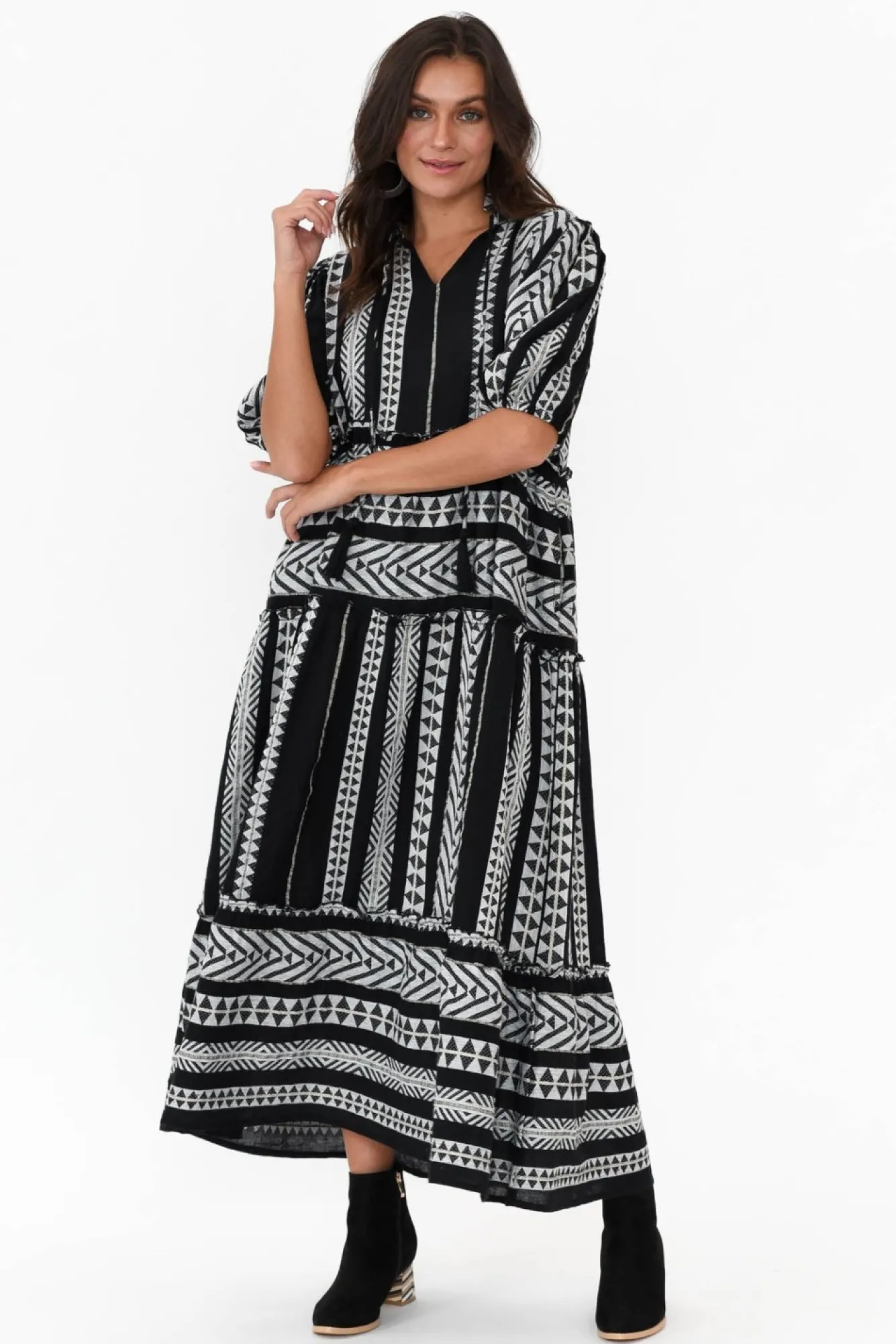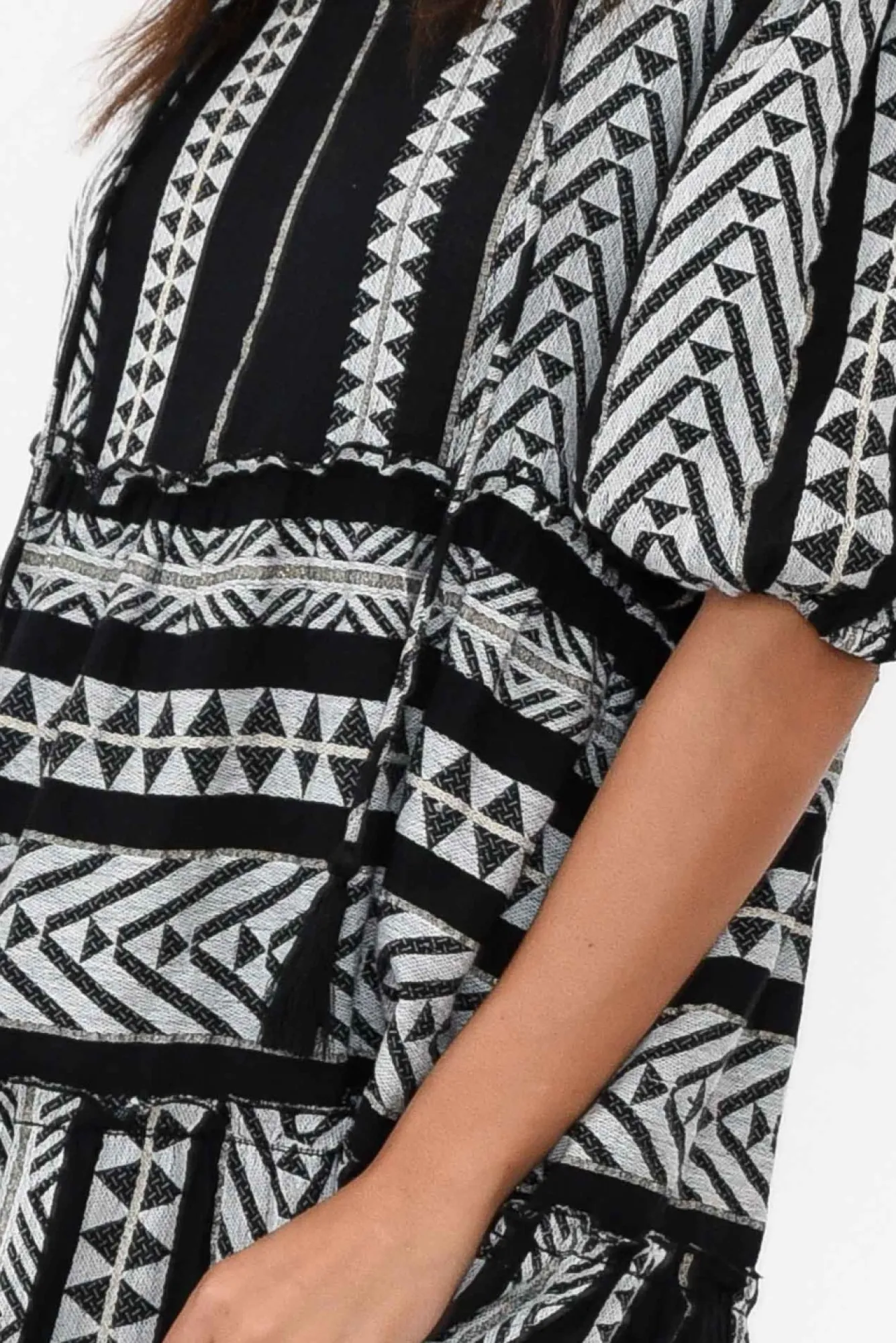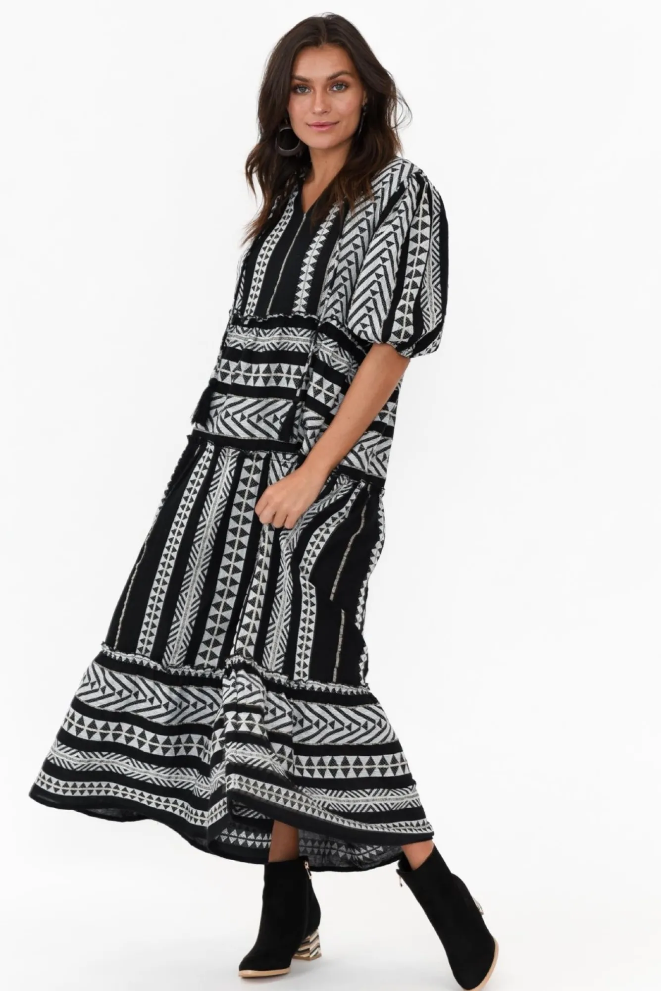 Fit: True To Size. Refer To Size & Fit Tab Below For Specific Size RecommendationNNfabric: 100% CottonNconstructed From Lightweight, Breathable And Non-Stretch Textured Cotton Fabric Nv-Split Neckline Elevated With An Adjustable Tassel Tie And Frill Detailing NNhalf-Length Puff Sleeves Complete With Elasticated Cuff NNrelaxed Tiered A-Line Silhouette NNtwo Discreet Side Seam Pockets NNstraight Hemline Falls To Maxi Length NNcare: Cool Gentle Hand Wash RecommendedNNcolour: Black And White Intricate Embroidery With Hints Of Metallic ThreadNNstyle Tip: Fabric Can Appear Slightly Sheer, We Recommend Pairing With A Slip For Additional Coverage. NNnote: Print Placement May Vary Between Garments