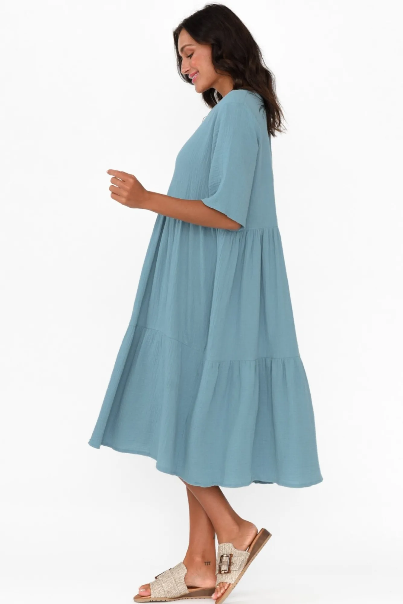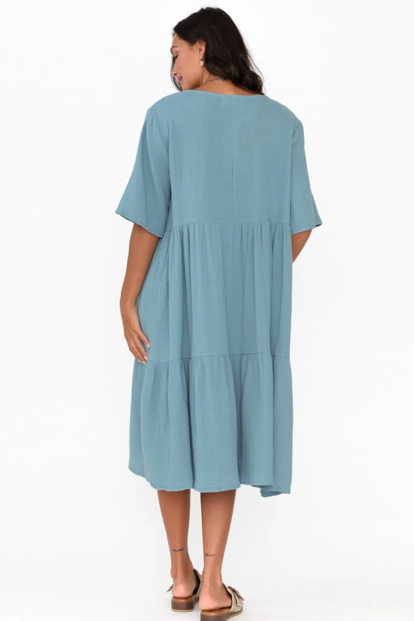 Fit: True To Size. Refer To Size & Fit Tab Below For Specific Size RecommendationNNfabric: 100% CottonNlightweight, Breathable And Soft Cotton With A Lovely Cheesecloth Finish NNtimeless Round Neckline Skims Below The Collarbones NNstraight Half-Length Sleeves NNbreezy, Tiered A-Line Silhouette NNhemline Falls Below Knee Length For A Versatile Look NNNcare: Cool Gentle Machine Wash RecommendedNNcolour: Steel Blue Hue