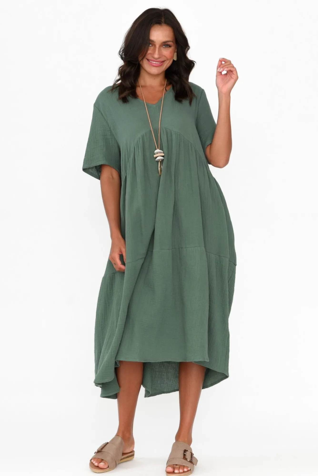 Fit: True To Size. Refer To Size & Fit Tab Below For Specific Size RecommendationNNfabric: 100% CottonNlightweight, Breathable And Non-Stretch Cotton With A Lovely Cheesecloth FinishNNsoft V-Neckline Frames The Collarbones NNstraight Half Length Sleeves NNbreezy A-Line Silhouette Enhanced By Feature Peak Detail Under The BustNNtwo Discreet Pockets Located In Side Seams NNsubtle Hi-Lo Hemline Falls Below Knee LengthNNNcare: Cool Gentle Machine Wash RecommendedNNcolour: Timeless Khaki Shade