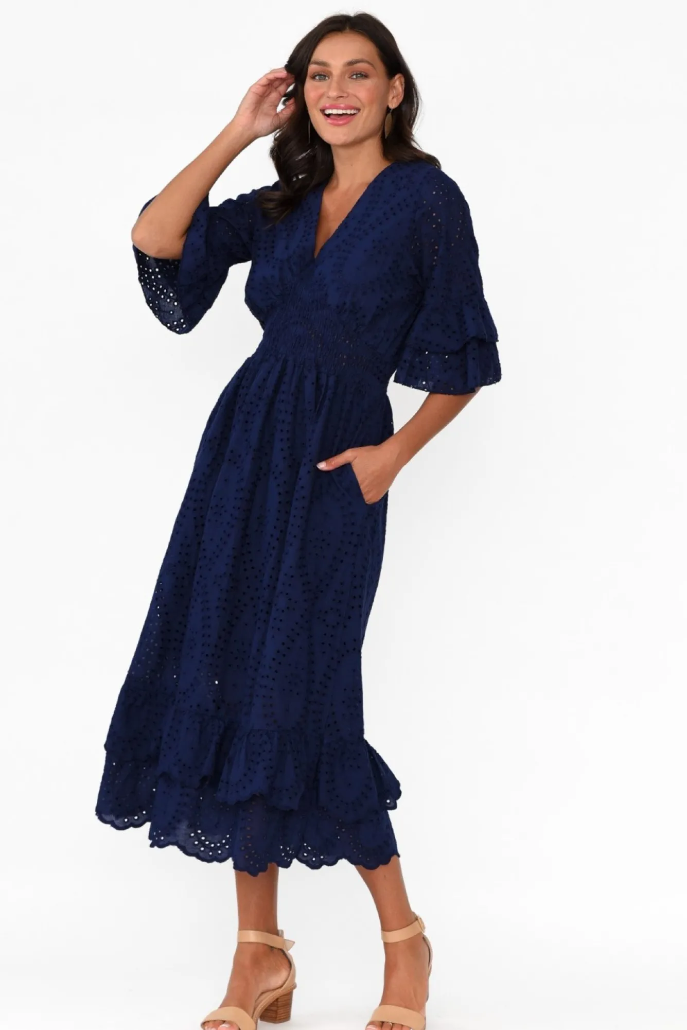 Fit: True To Size. Refer To Size & Fit Tab Below For Specific Size RecommendationNNfabric: 100% CottonNNcrafted In Italy From Lightweight, Breathable And Non-Stretch CottonNbust Is Unlined, We Recommend Pairing With Nude Undergarments NNsharp V-Neckline Frames The Collarbones Nfeaturing 3/4 Length Sleeves With A Flared Frill Cuff NNshirred Elasticated Peak Detail Under The Bust Nbreezy A-Line Silhouette With A Fully Lined Skirt NNtwo Discreet Hip Pockets NNdouble Frill Hemline Falls To Midi Length NNcare: Cool Gentle Machine Wash RecommendedNNcolour: Deep Indigo Broderie Angalise