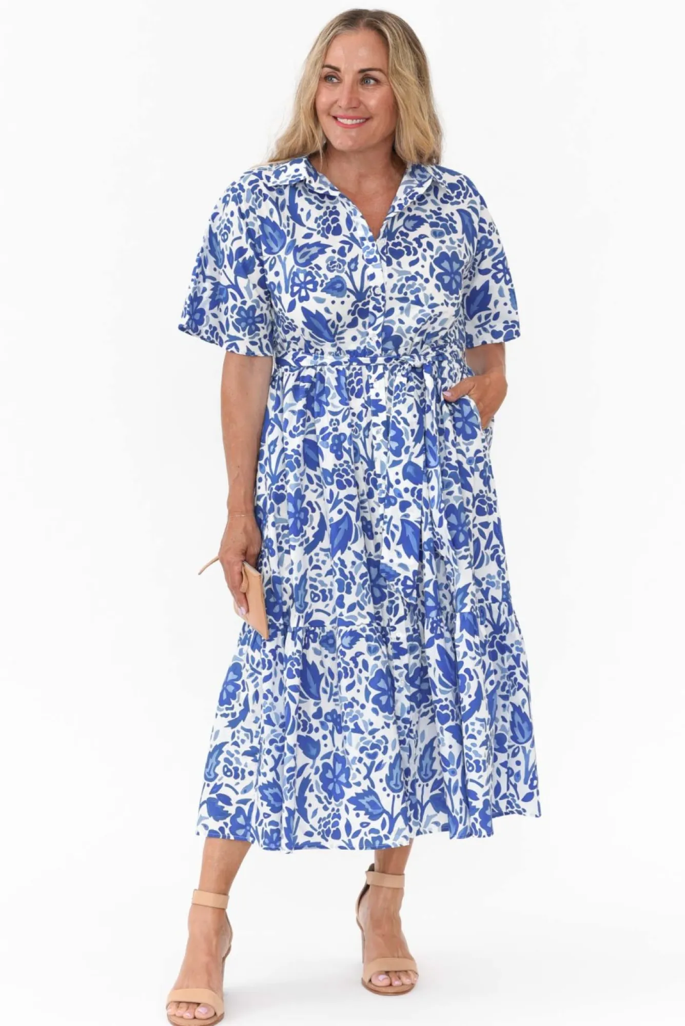 Fit: True To Size. Refer To Size & Fit Tab Below For Specific Size RecommendationNNfabric: 100% CottonNcrafted From Comfortable Lightweight, Non-Stretch Cotton Poplin Offering Wonderful BreathabilityNNelegant Collared Neckline Enhanced By Button-Down Front NNwide Half-Length Sleeves For A Timeless Look NNtiered A-Line Silhouette With Removable Waist Tie NNtwo Discreet Hip-Pockets NNstraight Hemline Falls To Midi Length NNcare: Cool Gentle Hand Wash RecommendedNNcolour: Crisp White Base With Eye-Catching Cobalt Blue Floral Print