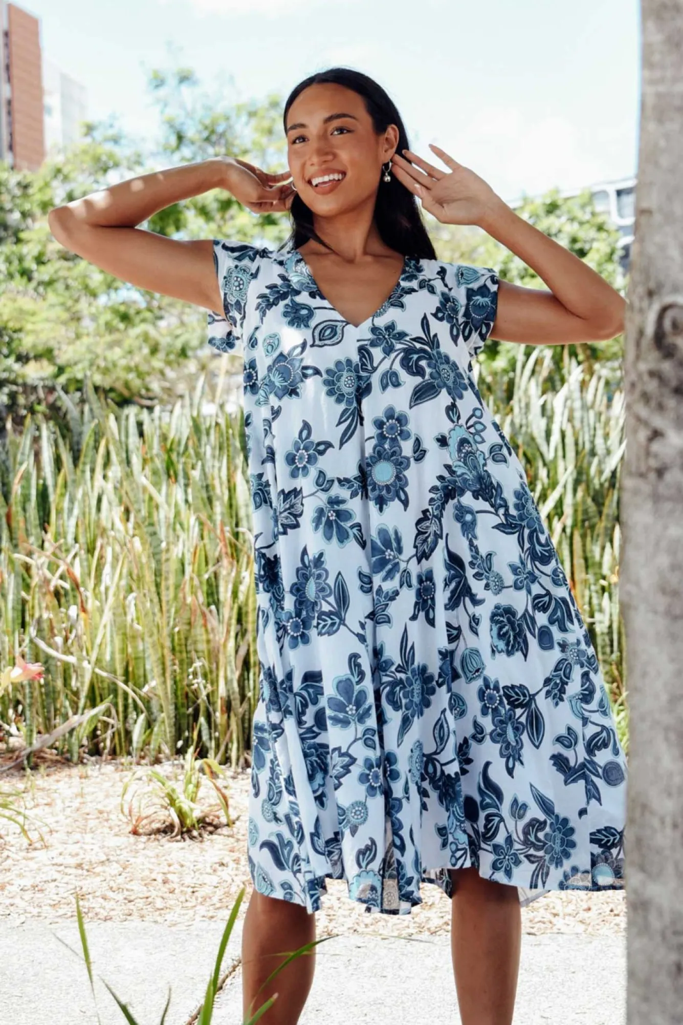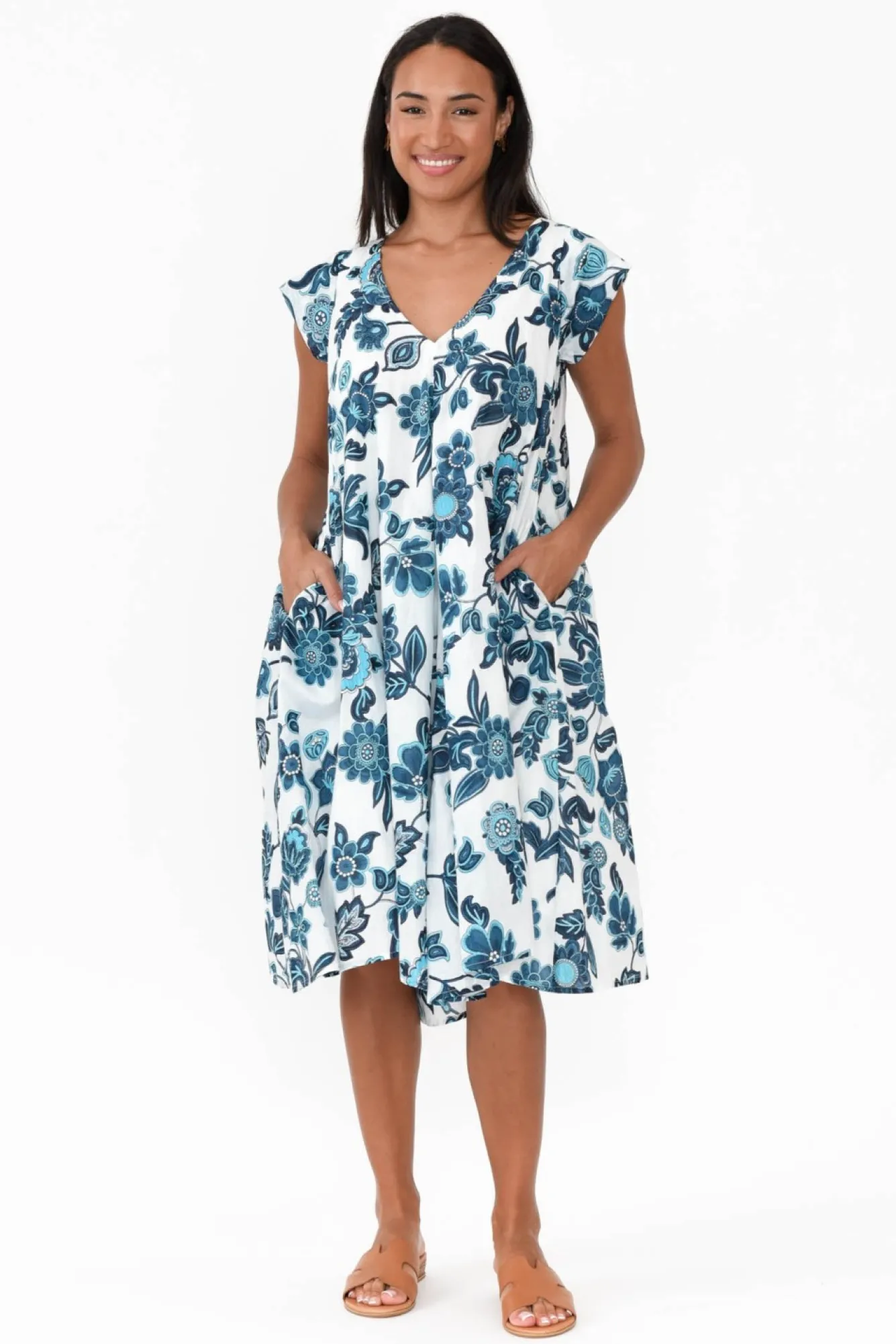 Fit: True To Size. Refer To Size & Fit Tab Below For Specific Size Recommendation NNfabric: 100% CottonNthis Dress Is Perfect For Adding Fresh Summer Tones To Your Wardrobe And It Can Be Worn To Your Next Ladies Day Out Or When You Have A Busy Day Ahead!Nsuper Light And Soft Non-Stretch CottonNfully LinedNsharp V Neckline And Short Cap SleevesNa Line Silhouette With Center Seam DetailNtwo Side PocketsNfalls To A Below Knee Length NNcare: Cool Gentle Hand Wash RecommendedNNcolour: White Background With A Pretty Blue Floral Pattern