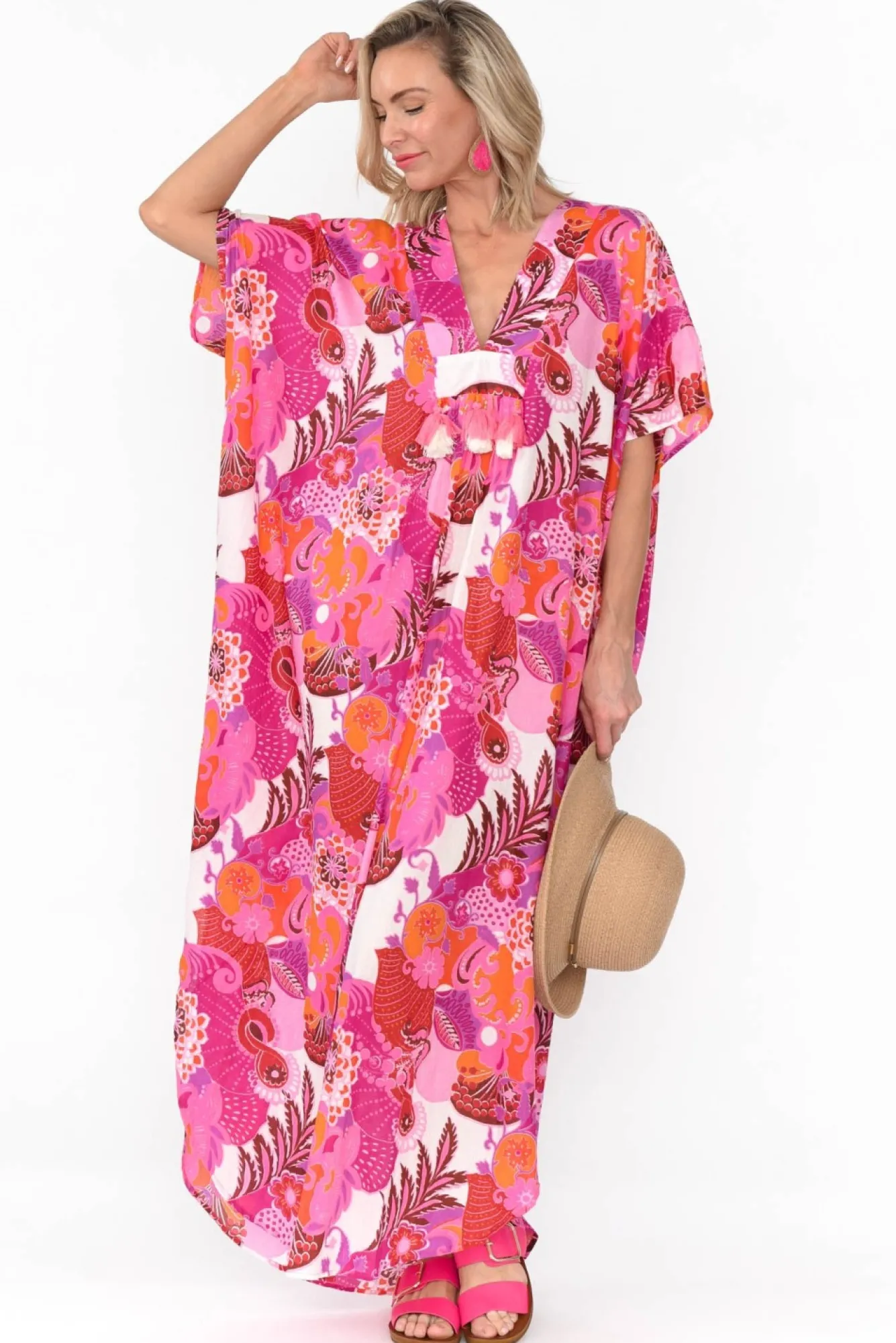 Fit: One Size. Refer To Size & Fit Tab Below For Specific Size RecommendationNNfabric: 100% CottonNperfectly Lightweight And Breathable Cotton Featuring A Non-Stretch, Soft Finish Nsquare Cut Kaftan With A Relaxed, Draping SilhouetteNwide Short SleevesNNNbanded V-Neckline And Tassel Detail Under BustNchic Maxi Length Featuring Knee-High Side Splits And A Curved HemlineNNcare: Cool Gentle Hand Wash RecommendedNNcolour: Detailed Pink Tropical Pattern