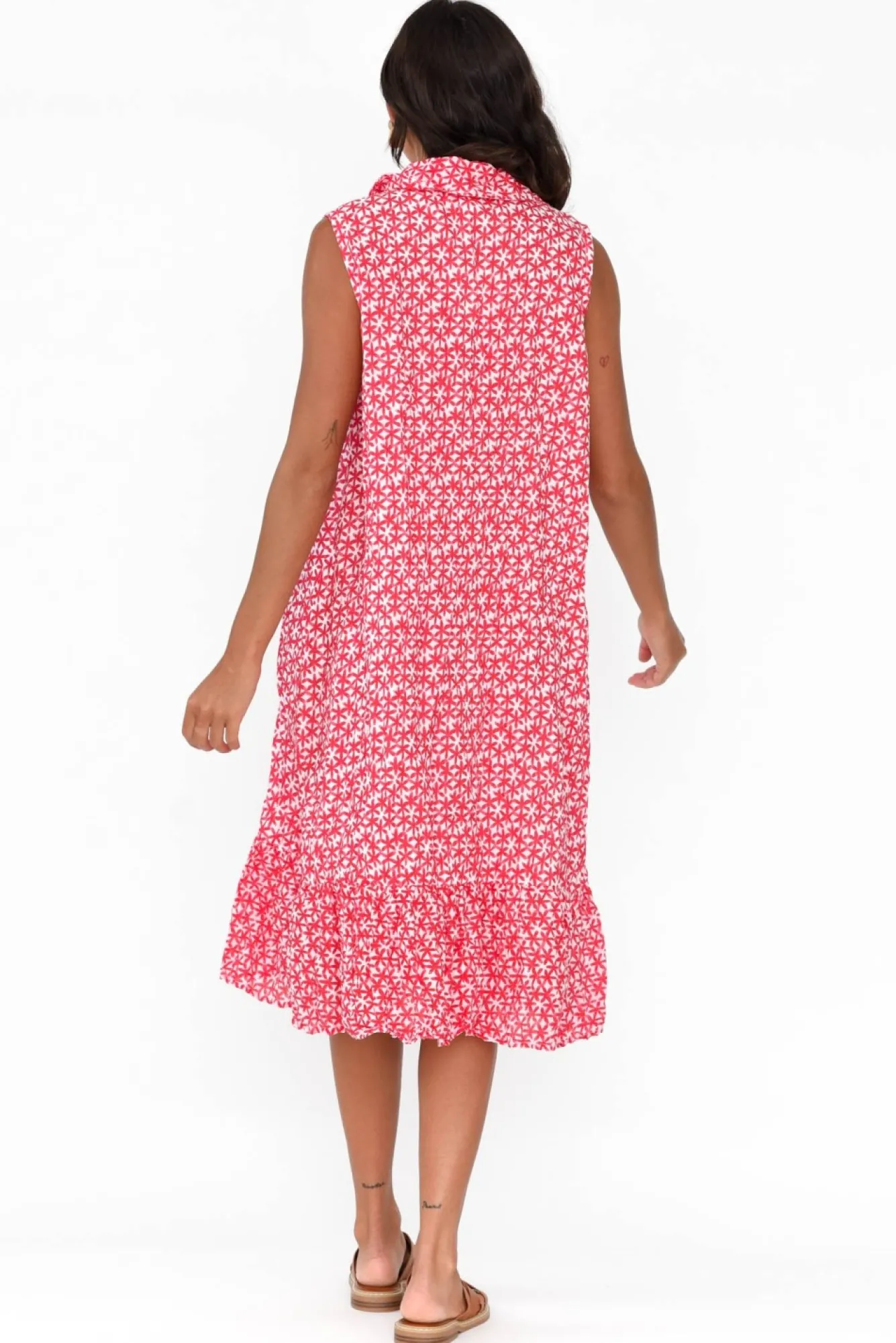 Fit: True To Size. Refer To Size & Fit Tab Below For Specific Size RecommendationNNfabric: 100% CottonNlovely Lightweight And Breathable Cotton Fabric With A Must-Have Crinkle TextureNcollared Neckline With Complementary Wooden Buttons From Neckline To HemNsleeveless Design And Full Shoulder Coverage NNsimple Shift Silhouette For Ultimate ComfortNNsewn-In Cotton Lining – No Need For An Additional SlipNfrilled Hem Falls Past The Knees NNNcare: Cool Gentle Hand Wash RecommendedNNcolour: Clustered Red Flower Print Over A White Base