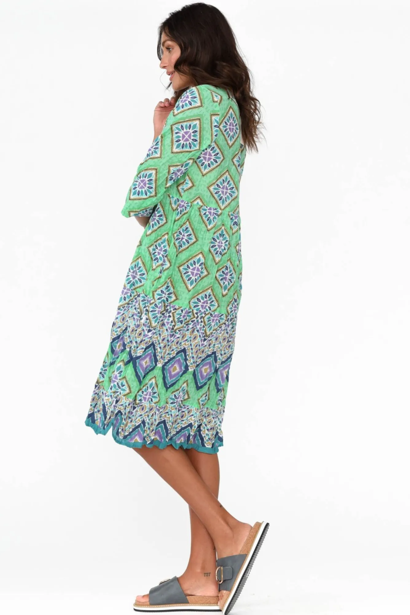 Fit: True To Size. Refer To Size & Fit Tab Below For Specific Size Recommendation NNfabric: 100% CottonNsoft Cotton Dress With A Lovely Lightweight, Breathable Feel And A No-Fuss Crinkle Cotton Texture NNwe Recommend Pairing With Your Favourite Slip For Additional CoverageNNround Banded Neckline With V-Split And Pink Tassel Tie Nstraight Sleeves Fall Past The ElbowNNfeature Under-Bust Seam Flows To A Tiered A-Line SkirtNstraight Hemline Falls To Knee Length NNNcare: Cool Gentle Hand Wash RecommendedNNcolour: Aqua Base With A Stunning Geometric Overlay NNfabric Tip: Twist The Garment, Fold In Half And Secure With A Rubber Band To Store After Washing And Drying To Keep The Crinkle AliveNNnote: Lengths May Vary Between Colourways, Please Refer To Individual Size Charts.