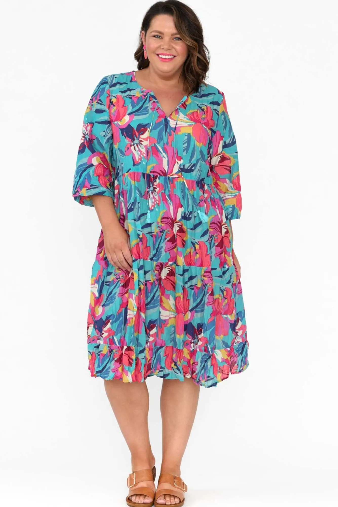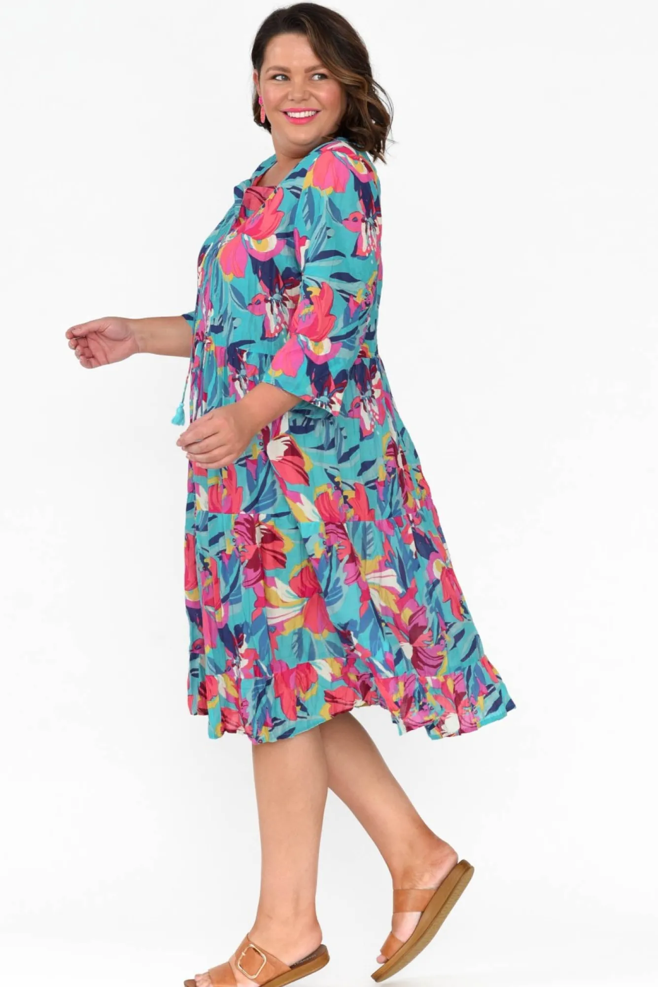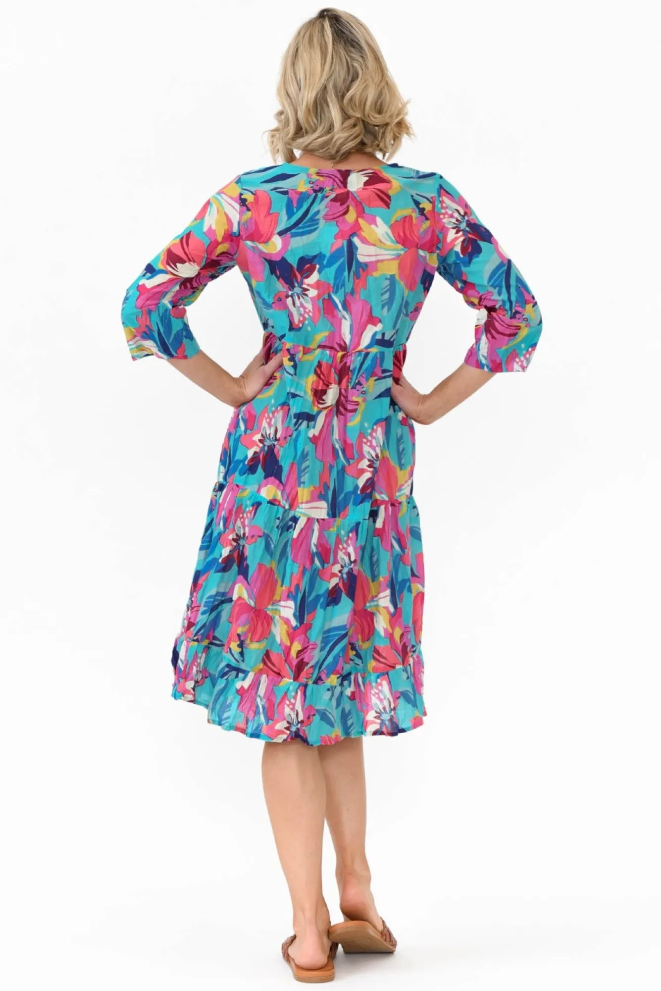 Fit: True To Size. Refer To Size & Fit Tab Below For Specific Size Recommendation NNfabric: 100% CottonNlightweight Summer Dress Designed In Breathable Cotton And A No-Fuss Crinkle FinishNwe Recommend Pairing With Your Favourite Slip For Additional CoverageNround Banded Neckline With V-Split And Pink Tassel Tie Nstraight Sleeves Fall Past The ElbowNNfeature Under-Bust Seam Flows To A Tiered A-Line SkirtNstraight Hemline Falls To Knee Length NNNcare: Cool Gentle Hand Wash RecommendedNNcolour: Sky Blue Base With A Vibrant Pink Floral PrintNNfabric Tip: Twist The Garment, Fold In Half And Secure With A Rubber Band To Store After Washing And Drying To Keep The Crinkle AliveNNnote: Lengths May Vary Between Colourways, Please Refer To Individual Size Charts.