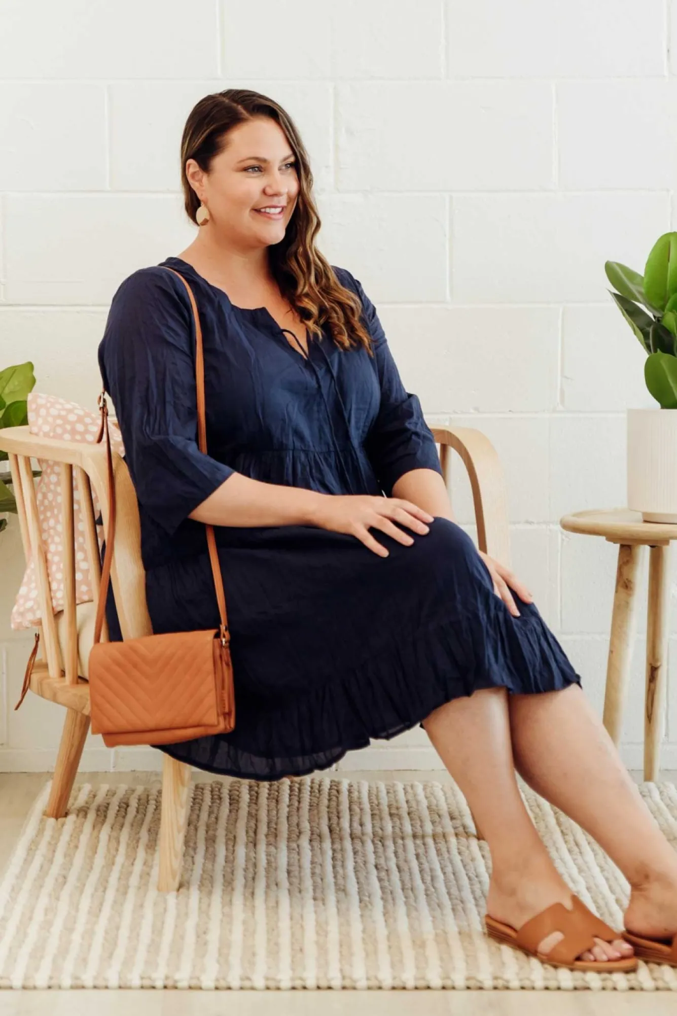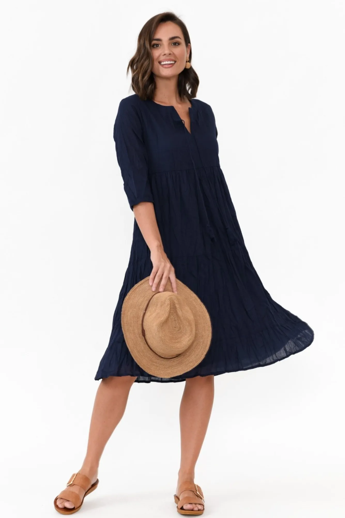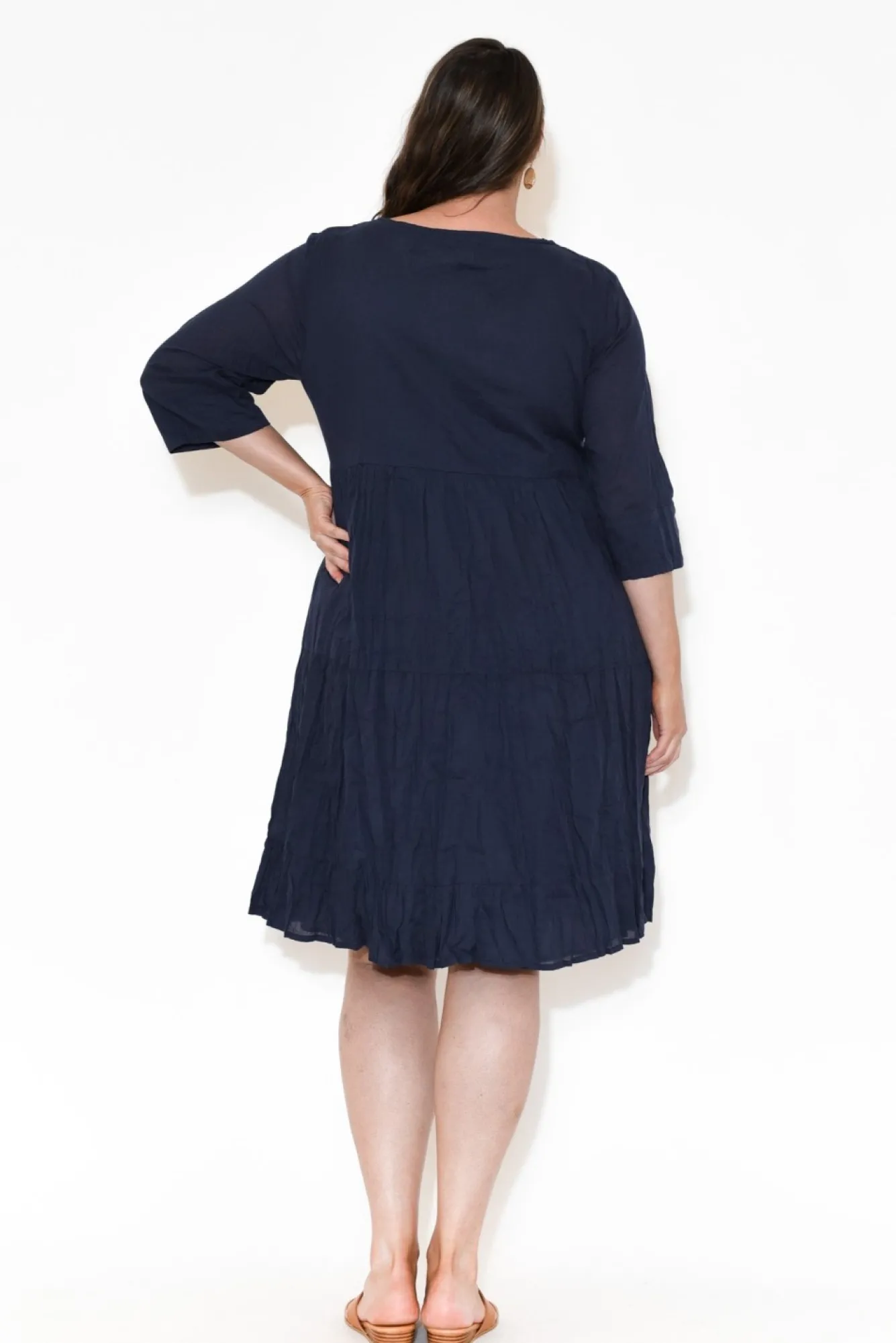 Fit: True. Refer To Size & Fit Tab Below For Specific Size RecommendationNNfabric: 100% CottonNlightweight, Soft And Breathable Non-Stretch Cotton FabricNcrinkle Cotton Is The Ultimate No-Fuss Fabric – Just Roll Up And Go, No Ironing Required!Nround Neckline With A V-Split And TieNN3/4 Length SleevesNunder Bust SeamNdouble Tiered SkirtNfully Lined Style For Added CoverageNknee-LengthNNcare: Cool Gentle Hand Wash RecommendedNNcolour: Navy ShadeNNfabric Tip: Twist The Garment, Fold In Half And Secure With A Rubber Band To Store After Washing And Drying To Keep The Crinkle Alive