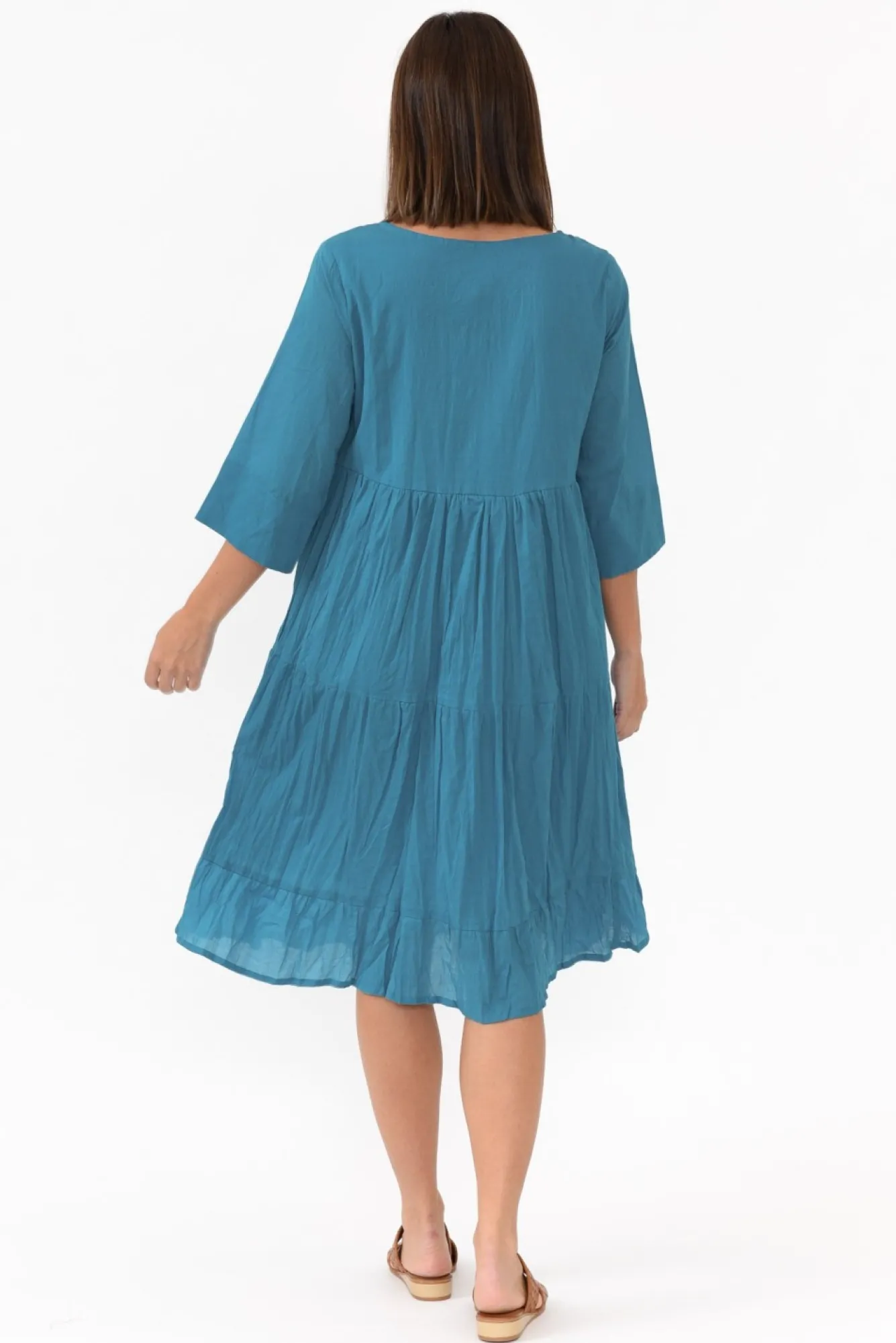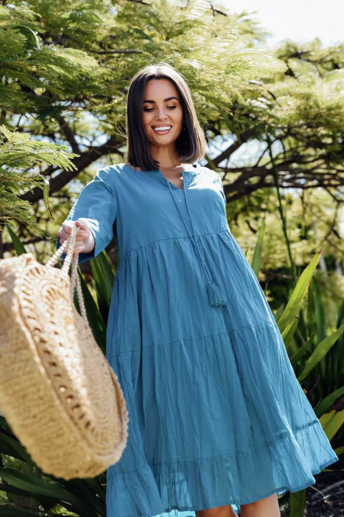 Fit: True. Refer To Size & Fit Tab Below For Specific Size RecommendationNNfabric: 100% CottonNbreathable, Lightweight And Non-Stretch Cotton In A Customer-Favourite Crinkle Finish – No Ironing Needed!NNround Neckline With A V-Split And Lovely Tassel TiesNNsimple, Straight 3/4 Length SleevesNtiered Flowy Skirt Falls From The Underbust SeamNNfully Lined Style For Added CoverageNcomfortable Knee-LengthNNcare: Cool Gentle Hand Wash RecommendedNNcolour: Bright Ocean BlueNNfabric Tip: Twist The Garment, Fold In Half And Secure With A Rubber Band To Store After Washing And Drying To Keep The Crinkle Alive