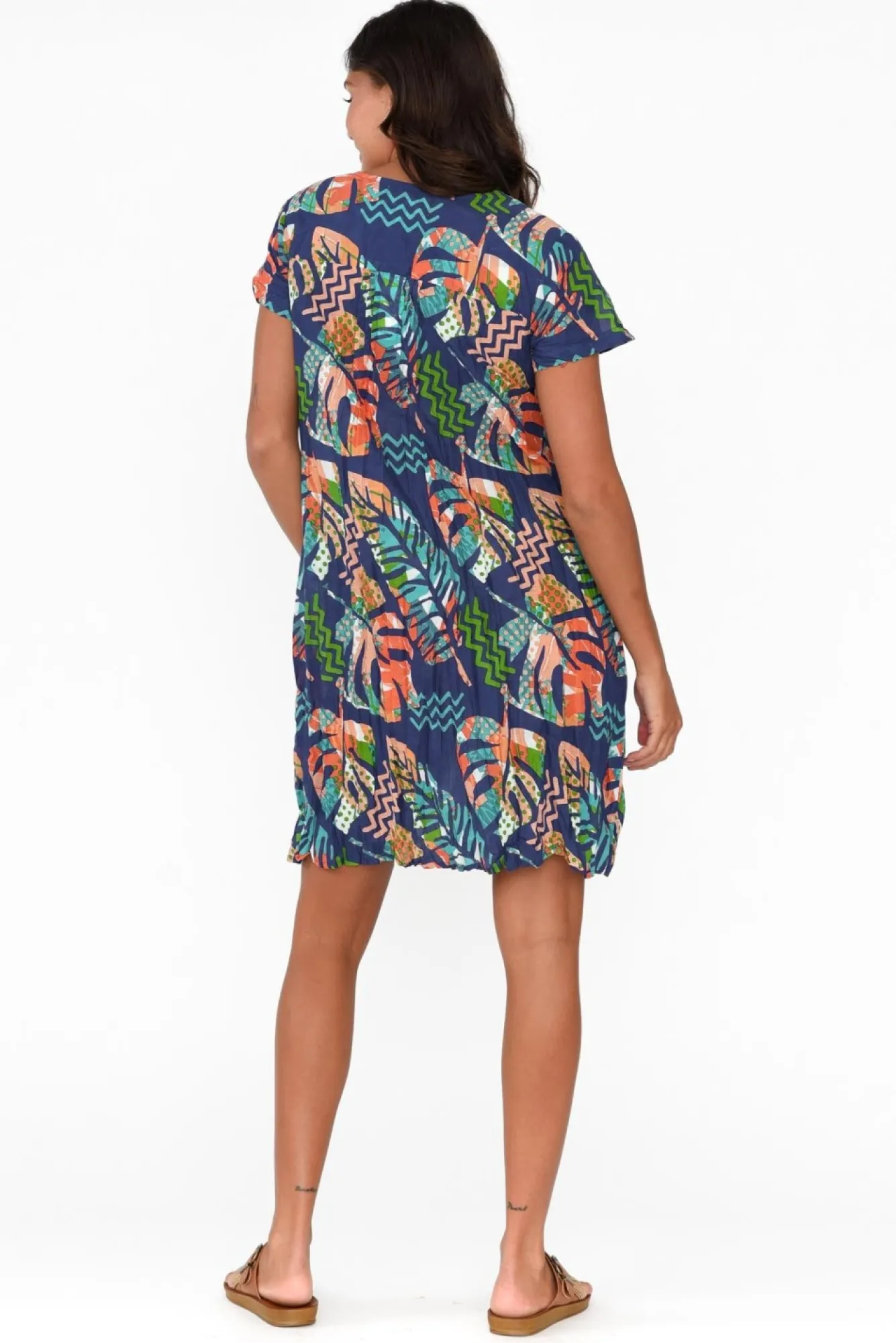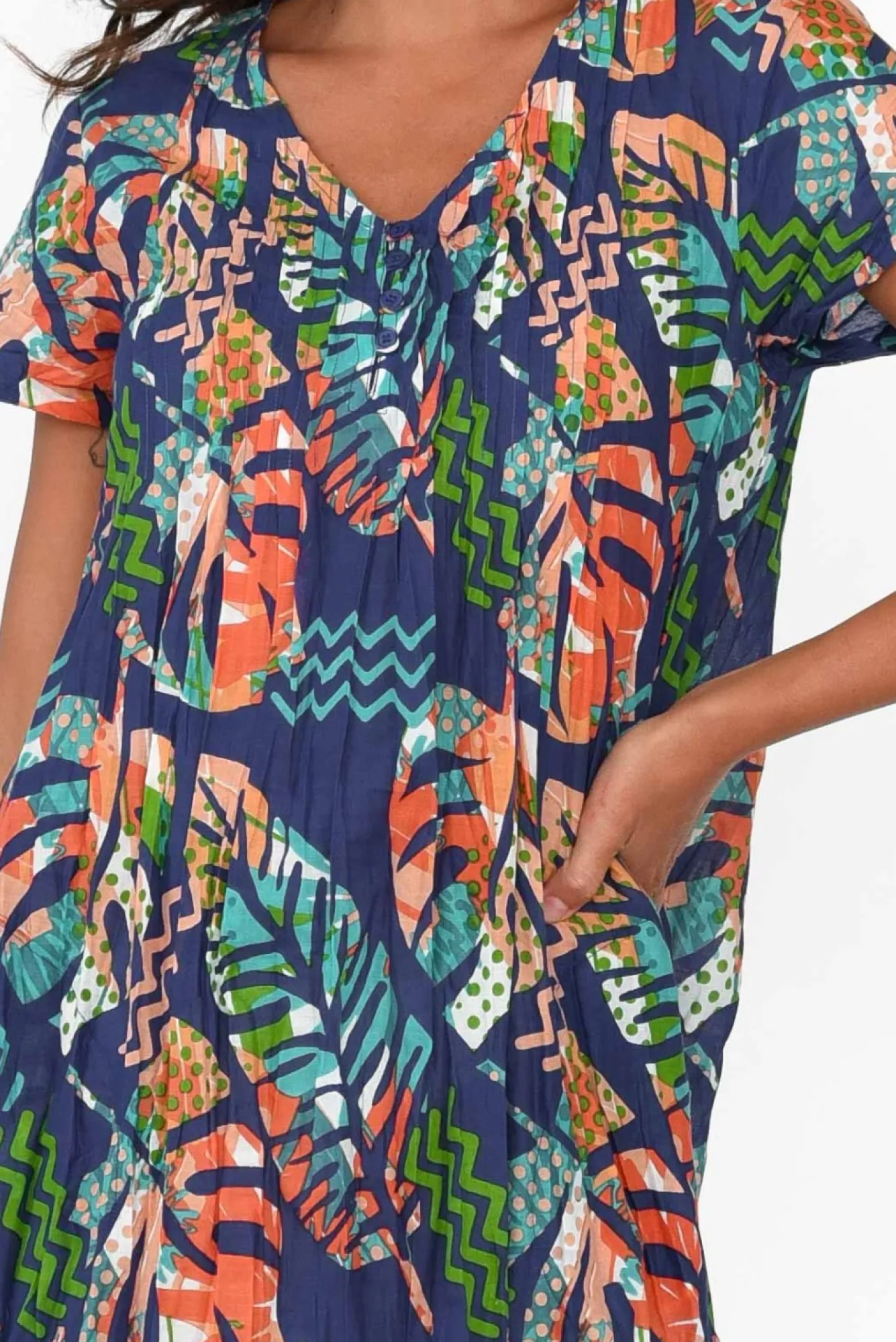 Fit: True To Size. Refer To Size & Fit Tab Below For Specific Size RecommendationNNfabric: 100% CottonNcrafted From Ultra-Lightweight, Breathable And Non-Stretch Cotton With A Crinkled Texture Nsoft V-Neckline With Buttons Cascading From Bust To Waist NNfeaturing Delicate Pleating Across Front YokeNclassic Short SleevesNtwo Discreet Hip PocketsNflattering Tiered A-Line SilhouetteNstraight Hemline Falls To Above Knee Length NNNcare: Cool Gentle Hand Wash RecommendedNNcolour: Navy Base With A Lovely Abstract Leaf Print