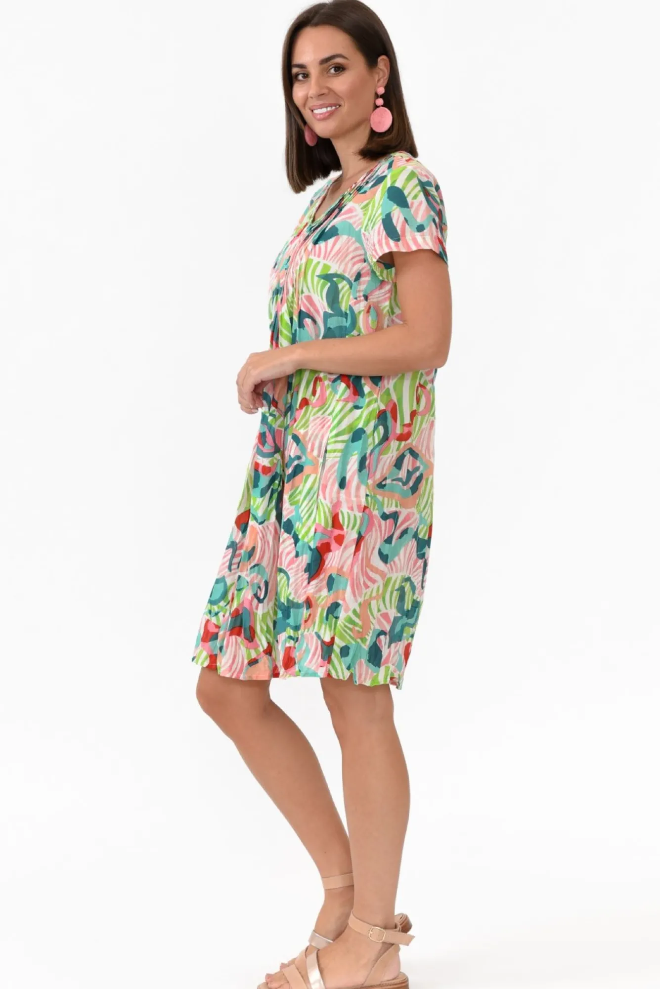 Fit: True To Size. Refer To Size & Fit Tab Below For Specific Size RecommendationNNfabric: 100% CottonNlightweight, Breathable, Non-Stretch Crinkle Cotton Fabric With A Lovely Soft Hand FeelNdainty V-Neckline Featuring Button Detailing From Bust To WaistNNdelicate Pleating Adorns The Bust Nclassic Short SleevesNtwo Discreet Hip PocketsNa-Line Silhouette Flows Over CurvesNabove Knee Length Dress With A Simple Straight HemlineNNcare: Cool Gentle Hand Wash RecommendedNNcolour: Summery Swirl Pattern Of Green, Pink And Blue HuesNNfabric Tip: Twist The Garment, Fold In Half And Secure With A Rubber Band To Store After Washing And Drying To Keep The Crinkle AliveNNstyle Tip: We Recommend Pairing With Your Favourite Slip For Additional Coverage